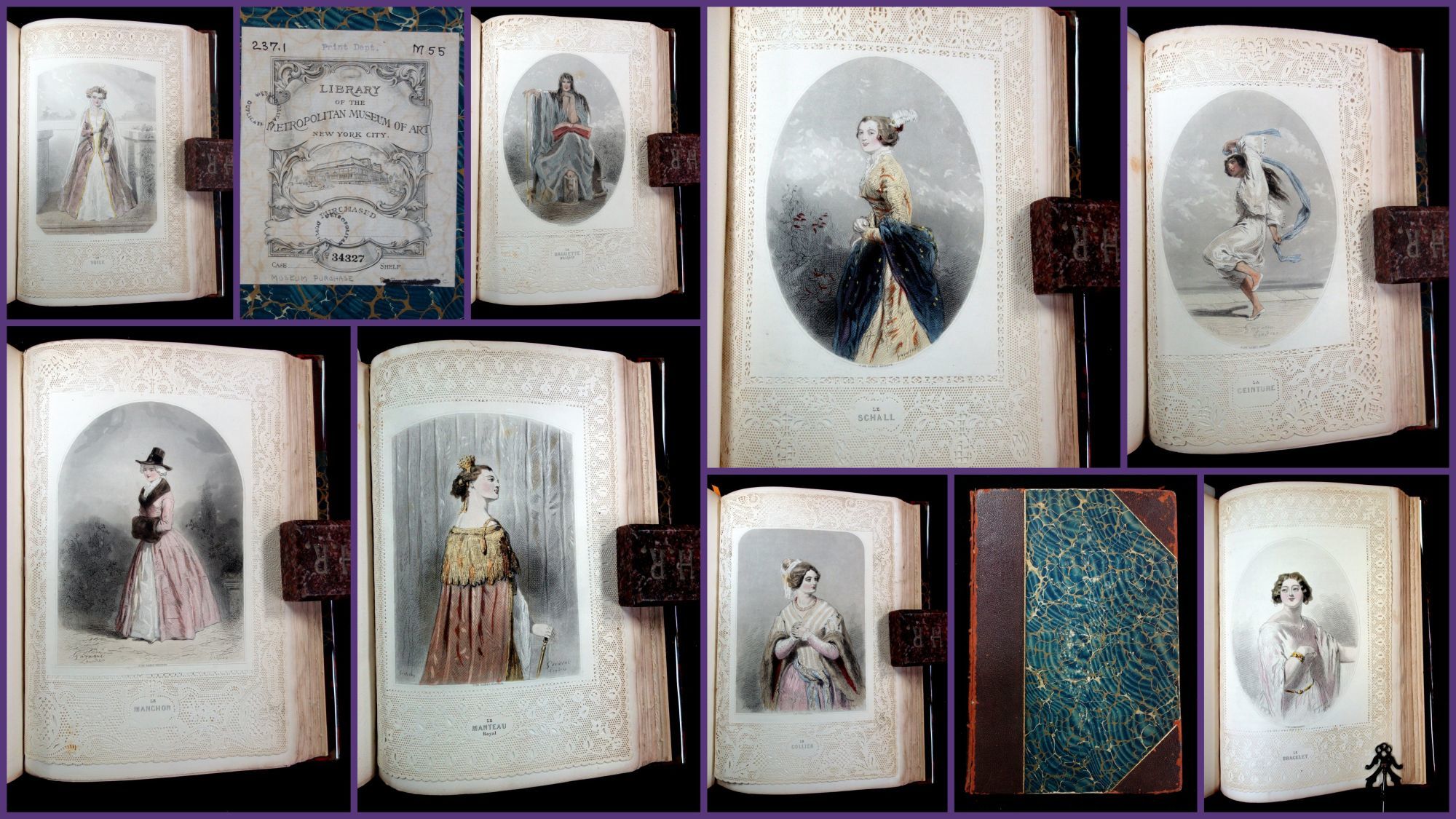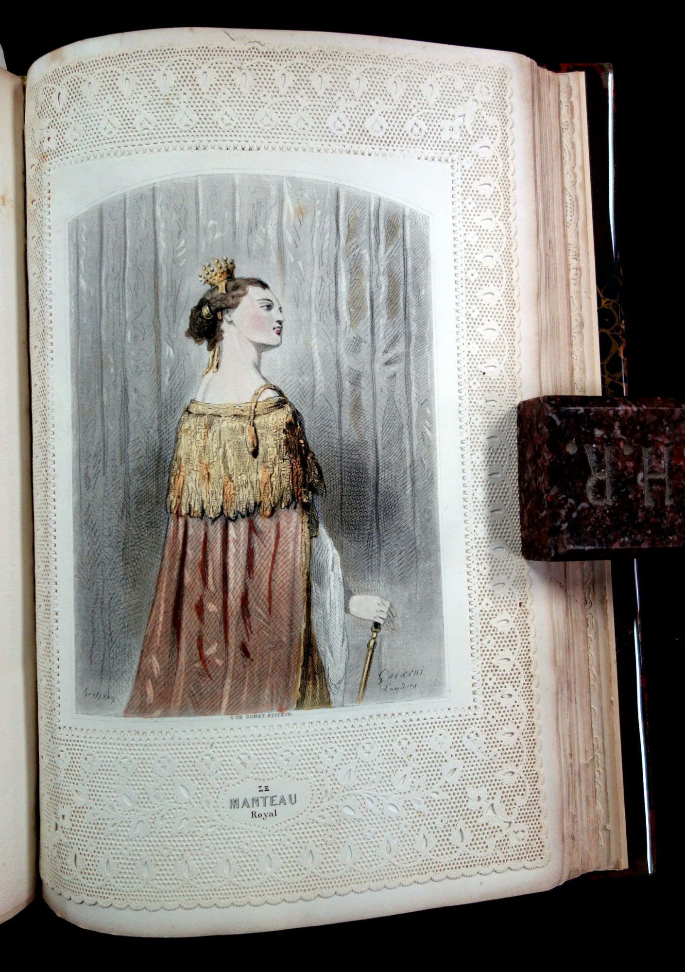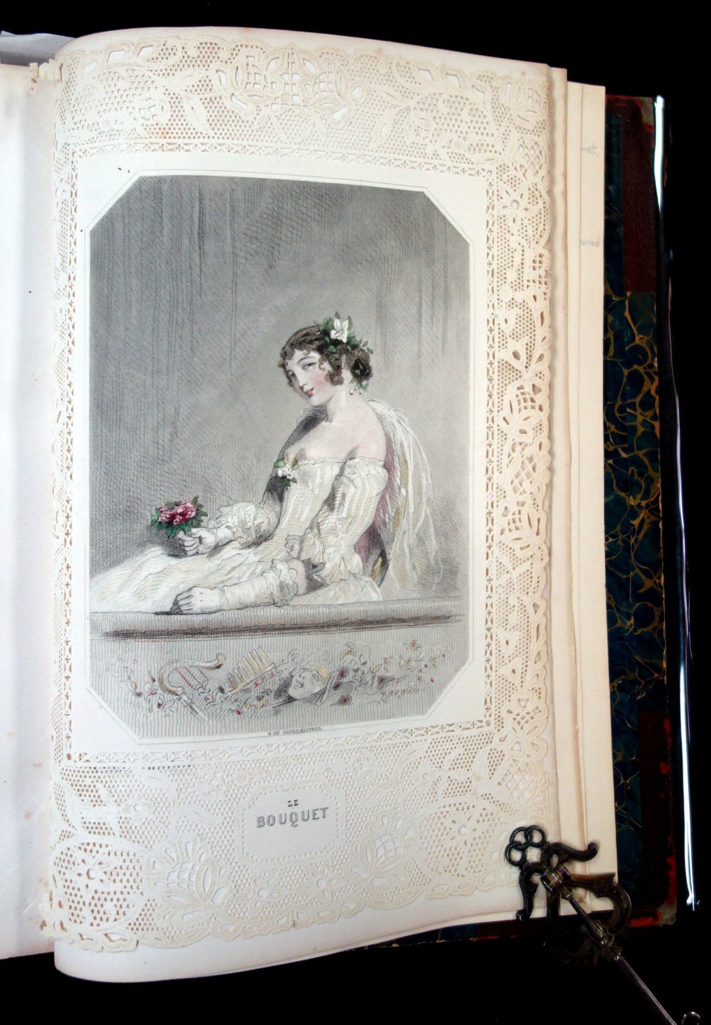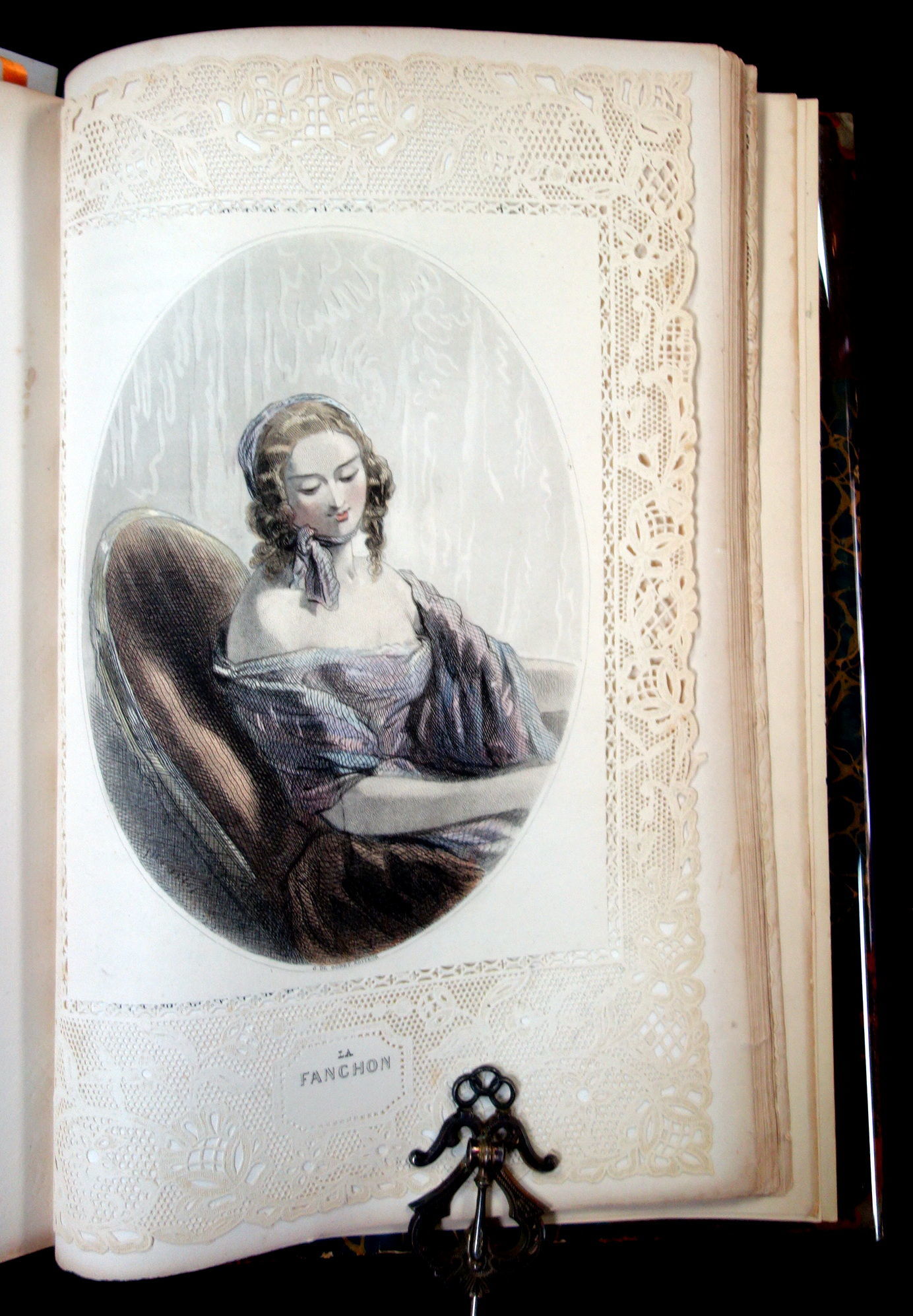 Volume two of two with frontispiece and 15 plates engraved by Geoffroy after Gavarni, all in two states, on chine monté, and on elegantly coloured and printed papier vélin with borders cut to lace patterns. 8vo. Steel engravings are printed and delicately coloured on paper with borders cut to various lace patterns, or "decoupées en dentelles". Ex. Library Metropolitan Museum of Art, New York.