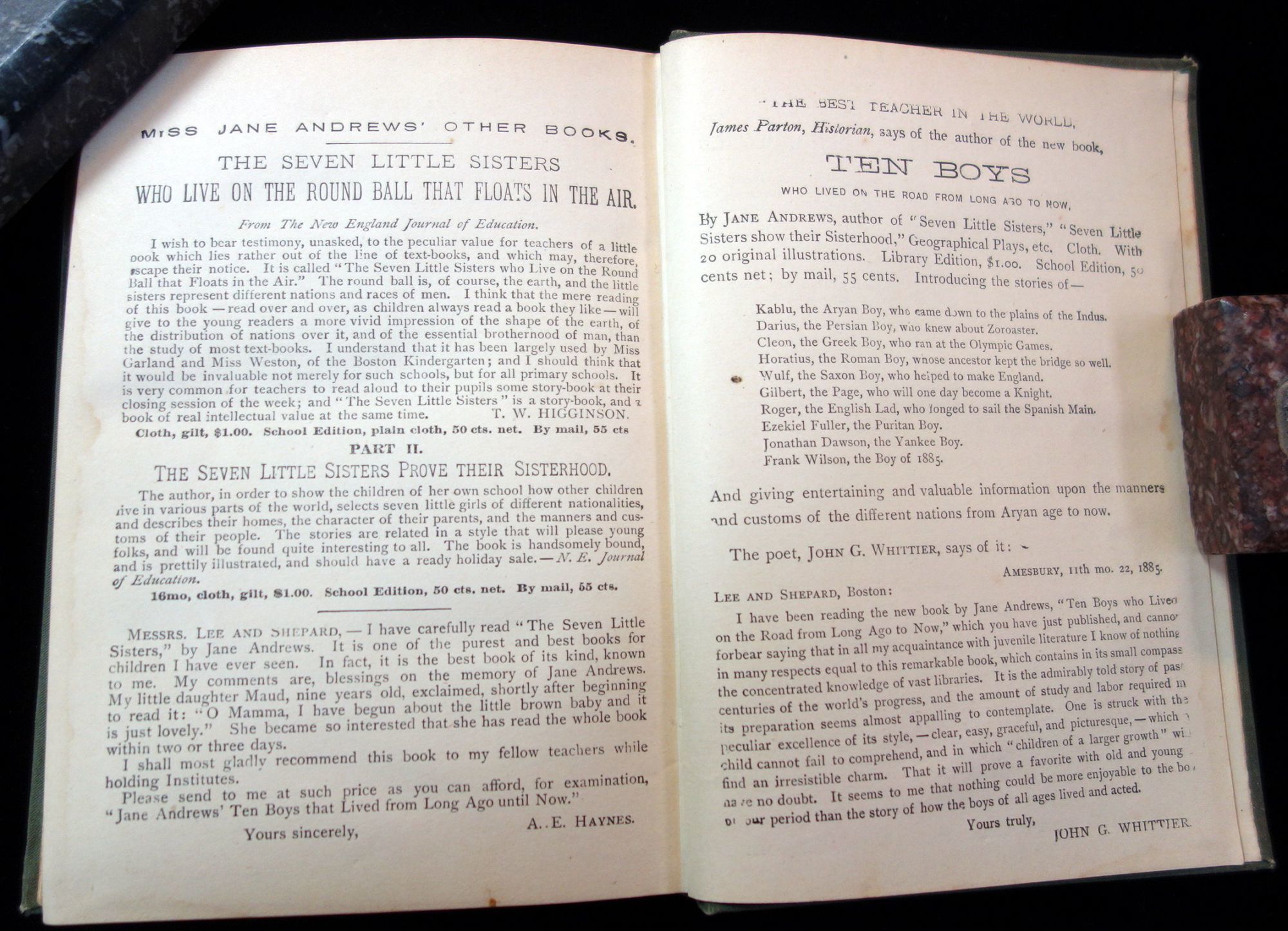 This book is a companion to 'The Seven Little Sisters Who Live on the Round Ball that Floats in the Air and' 'Ten Boys Who Lived on the Road from Long Ago to Now,' also by Jane Andrews, and is intended as an elementary text book, with pronunciation and vocabulary lists in the back.