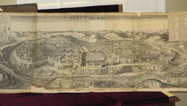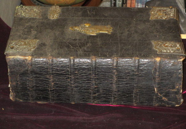 Luneburg: Johann Stern, 1711. Very Good. Large Folio (16 1/2" x 11 1/2"). A magnificent pulpit size Bible, in contemporary full leather binding, with cast bronze corners, each showing a different biblical narrative (4 on front board and 4 on rear), 4 cast bronze studs for clasps (one lacking) and a cast bronze figure of Jesus on front board and a cast bronze figure of Moses on the rear board. Printed title and engraved title, with frontis for Old Testament (both mounted) and engraved title with New Testament; large folding BIRD'S EYE VIEW of the Jerusalem (42" x 16 1/2"), mounted; double page map of the Holy Land. [42]374[12],252[14],245[12] - includes the Apocrypha. Internally clean and bright, contemporary note on OT printed title page and small marginal loss to edge, obliterating the date (1711). Binding and ropes are strong, small loss at spine ends. A very good copy, indeed; not in Darlow and Moule.