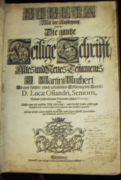Biblia Mit Der Ausslegung. Das Ist: Die Gantze Heilige Schrift, Altes Und Neues Testaments, D. Martini Lutheri. Mit Einer Kurzen / Jedoch Grundlichen Erklarung Dess Textes, D. Lucae Ofiandri, Senioris......Bible in German (1711)