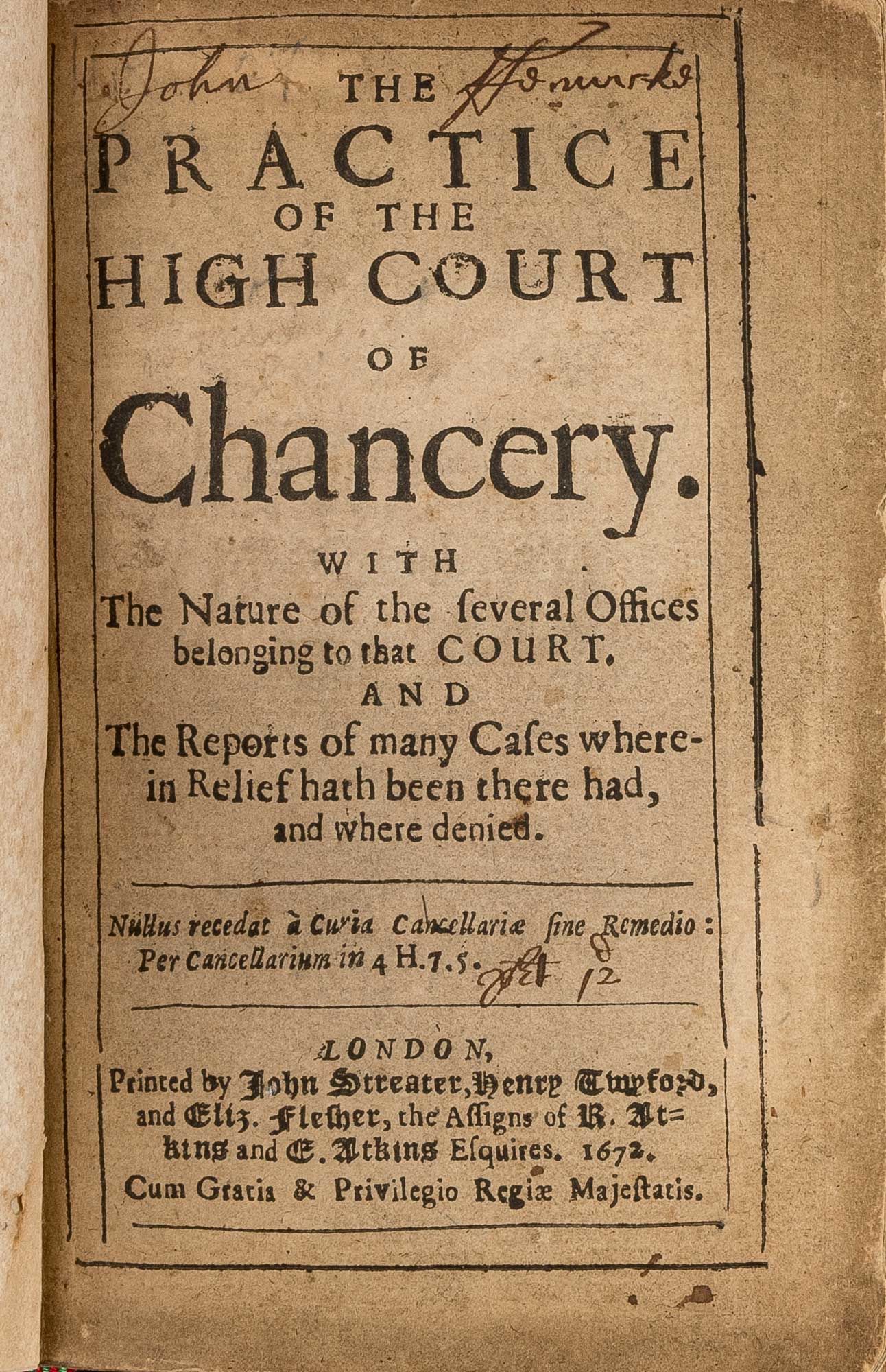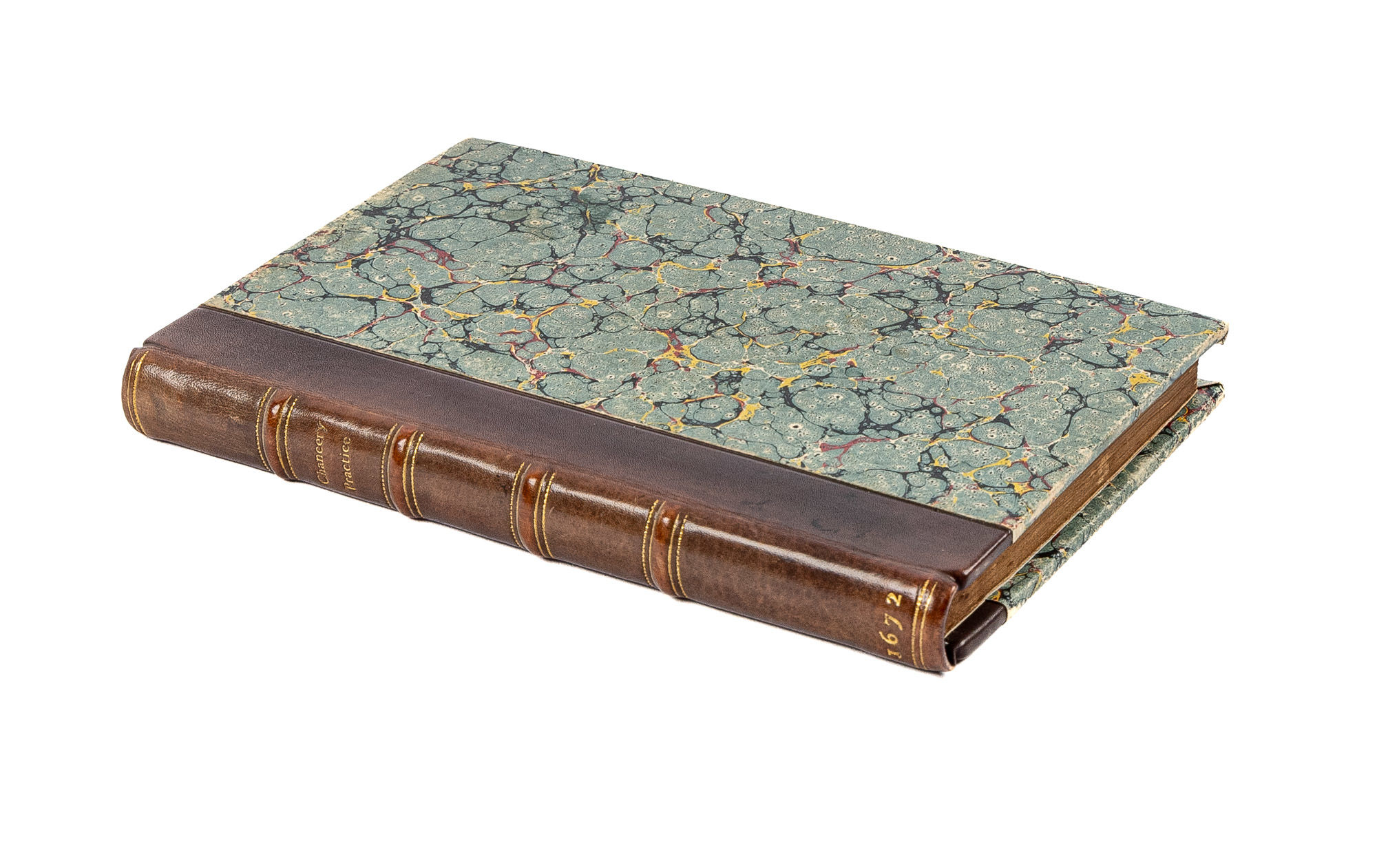 1672. 2d part: Choyce Cases in Chancery. 2d part: Choyce Cases in Chancery. "An Exhibition of Elizabethan Habits, Manners, And Peculiarities" [Court of Chancery]. [Great Britain]. The Practice of the High Court of Chancery. With the Nature of the Several Offices Belonging to that Court. And the Reports of Many Cases Wherein Relief Hath Been There Had, And Where Denied. London: printed by John Streater, Henry Twyford, And Eliz. Flesher, The Assigns of R. Atkins and E. Atkins Esquires, 1672. [viii], 180, [10] pp. Final Table of Cases leaf, from Plaintiff to Z, lacking. Two parts with continuous pagination. Second part has headline title: Choyce Cases in Chancery. Octavo (5-3/4" x 3-3/4"). Recent period-style quarter calf over marbled boards, gilt title and gilt-edged raised bands to spine, endpapers renewed. Light rubbing to extremities, minor wear to corners. Some toning to text, light foxing to a few leaves, light soiling, edgewear and early owner signature ("John Ffenwicke") to title page. A handsome copy. $500. * Second edition, one of two issues from 1672. "Like Lambard, Tothill, and a few similar works, this volume is one which those great cases that occur from time to time, and stimulate inquiry into the very foundations of legal science, will occasionally call forth, and it ought, therefore, to be in every public law library. (...) There is a picturesqueness and dramatic interest about them, especially as seen by the half lights in which sitting so far off, we...necessarily view them, that makes them quite entertaining, and, indeed an exhibition of Elizabethan habits, manners, and peculiarities." (Wallace). The period covered by Choyce Cases is 1557-1606. Counting both issues, OCLC locates 10 copies in North American law libraries (Columbia, Georgetown, Harvard, Jenkins, Library of Congress, Northwestern, University of Minnesota, University of Pennsylvania, US Supreme Court, Yale). Wallace, The Reporters 470-471. English Short-Title Catalogue R222499.