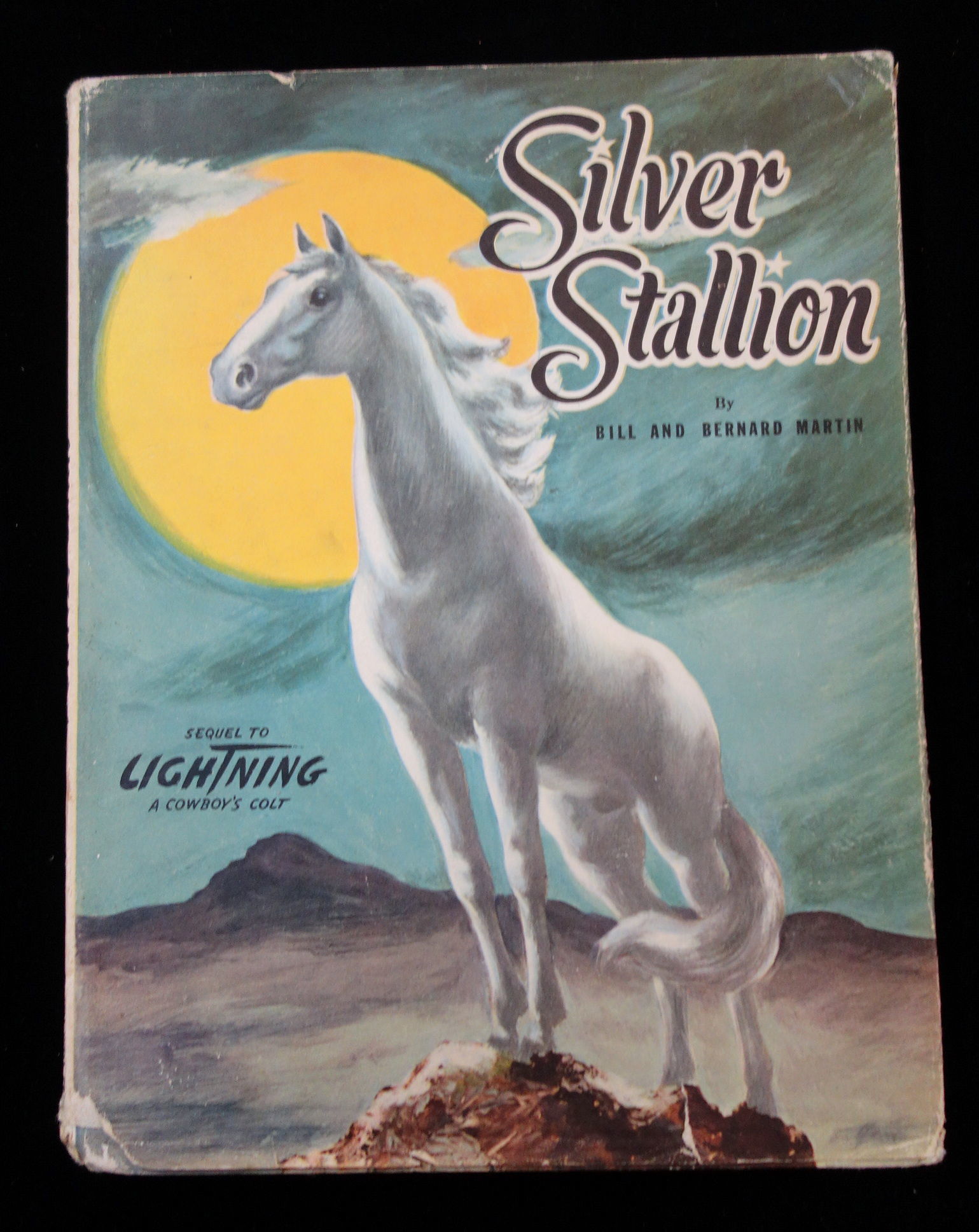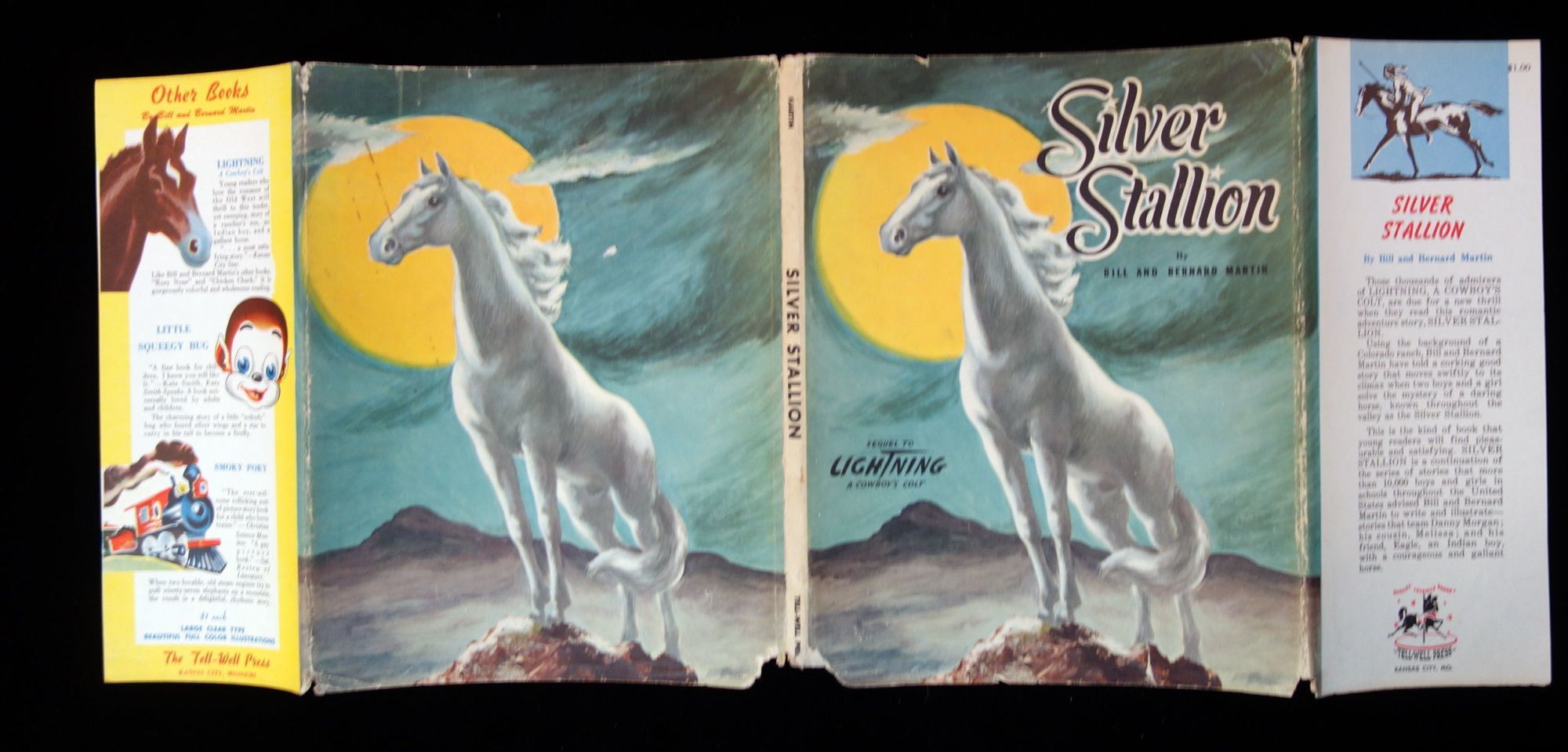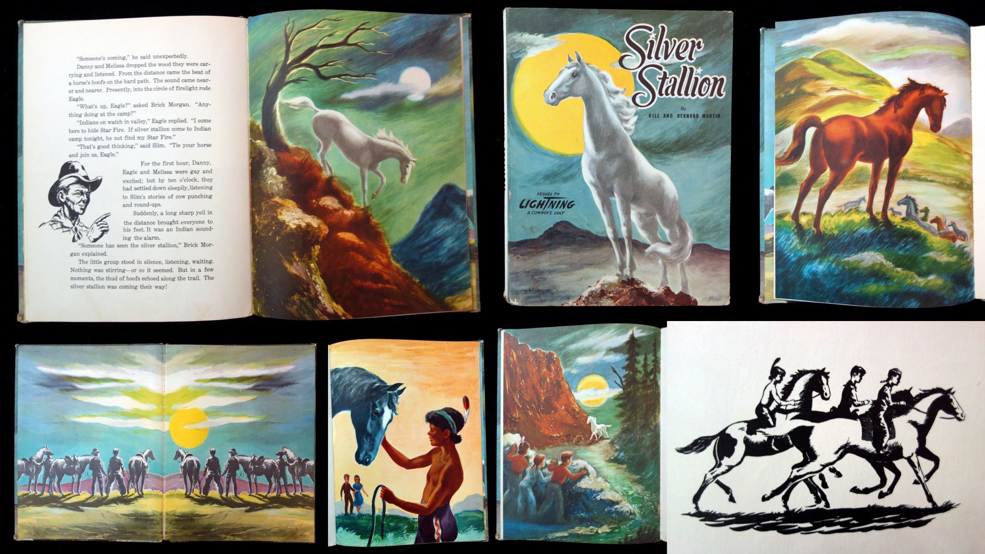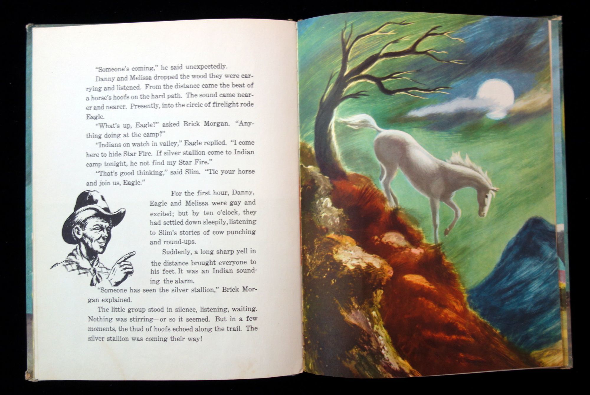 Kansas City, MO: Tell Well Press, 1949. 29 pp. (unpaginated) children's book, tells the story of Danny Morgan, his cousin Melissa, and their friend Eagle, an Indian boy, as they solve the mystery of the phantom silver stallion. Called a "corking good story", it is chalk full of vibrantly colored, or charming black and white illustrations on nearly every page. A must for any child horse lover.