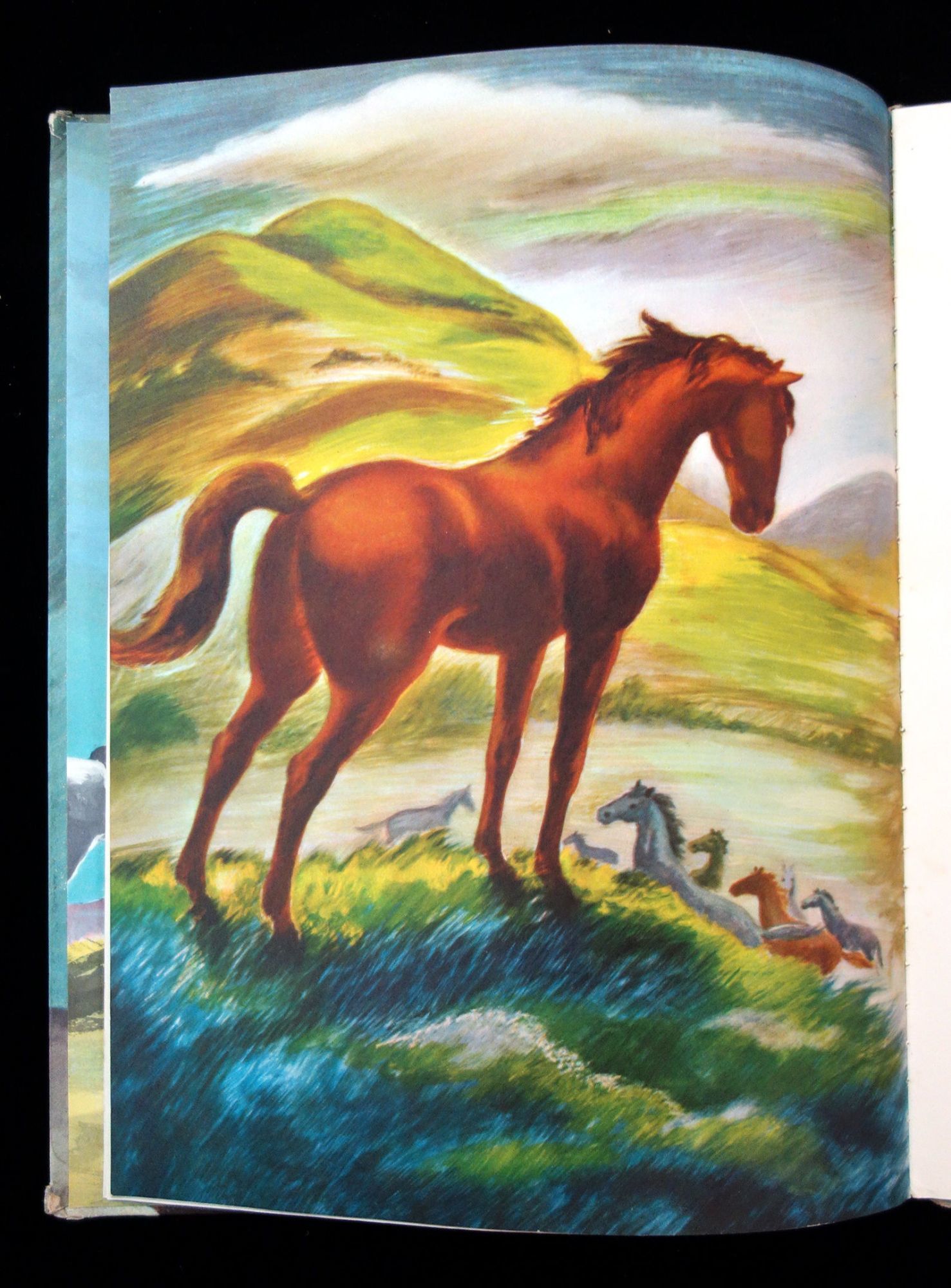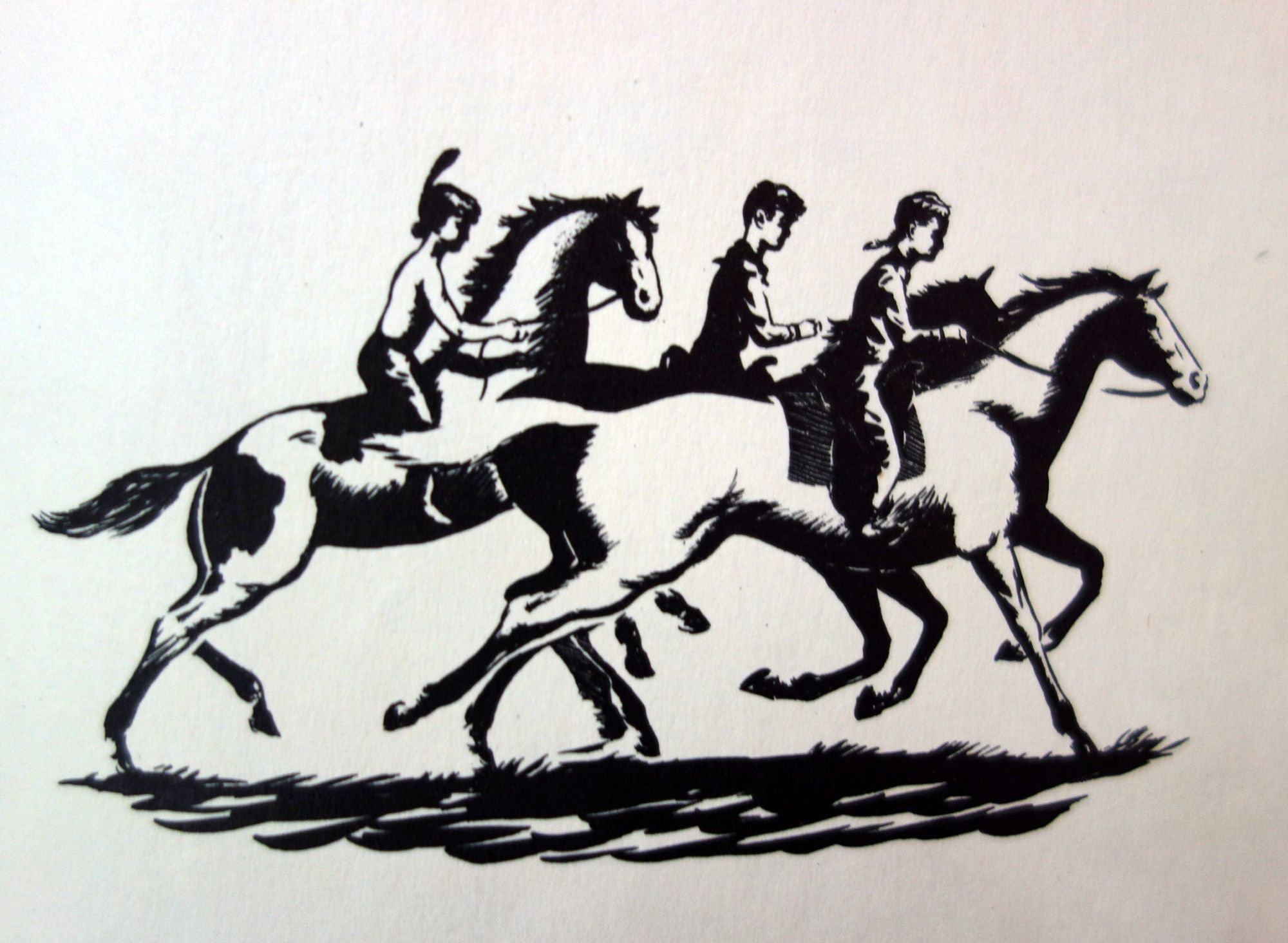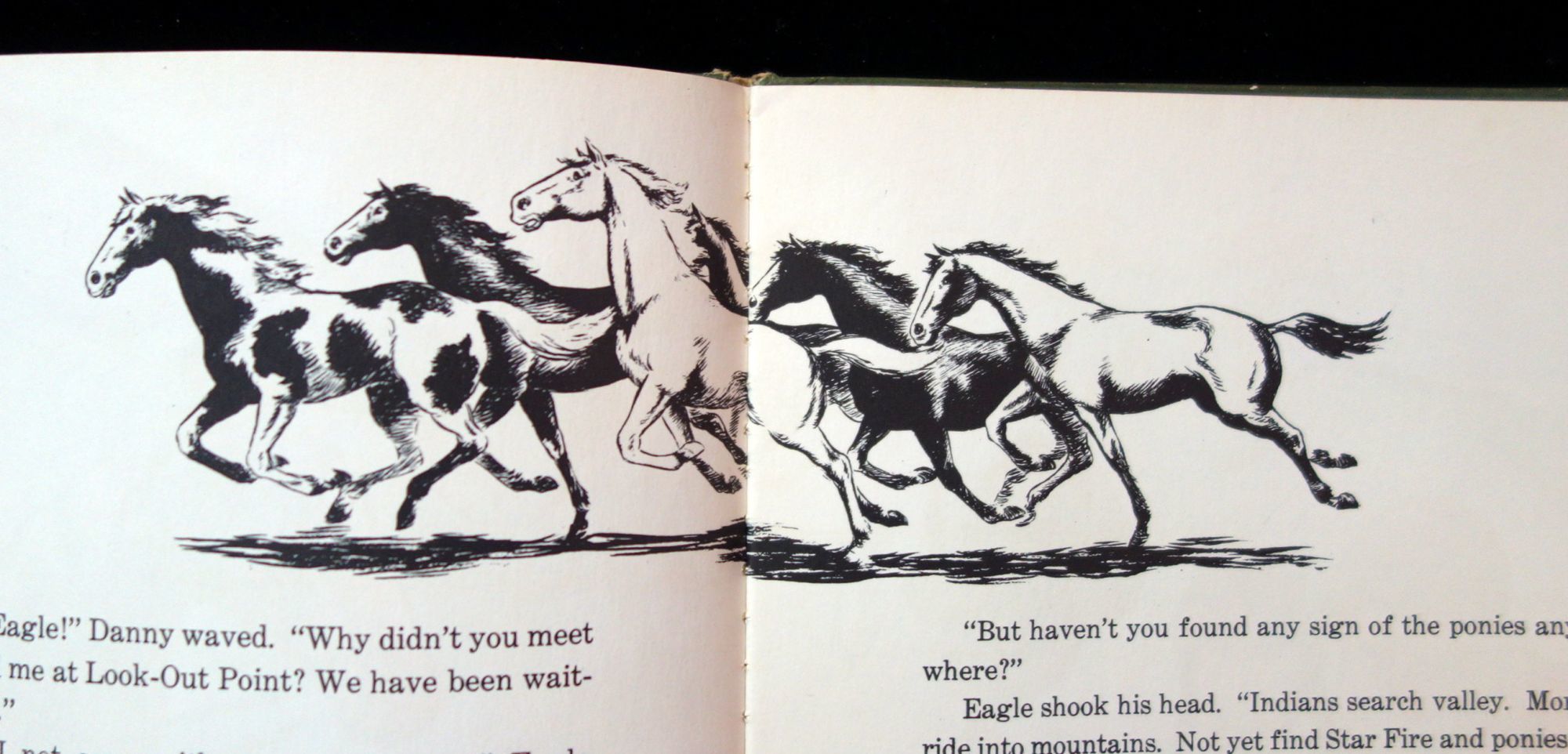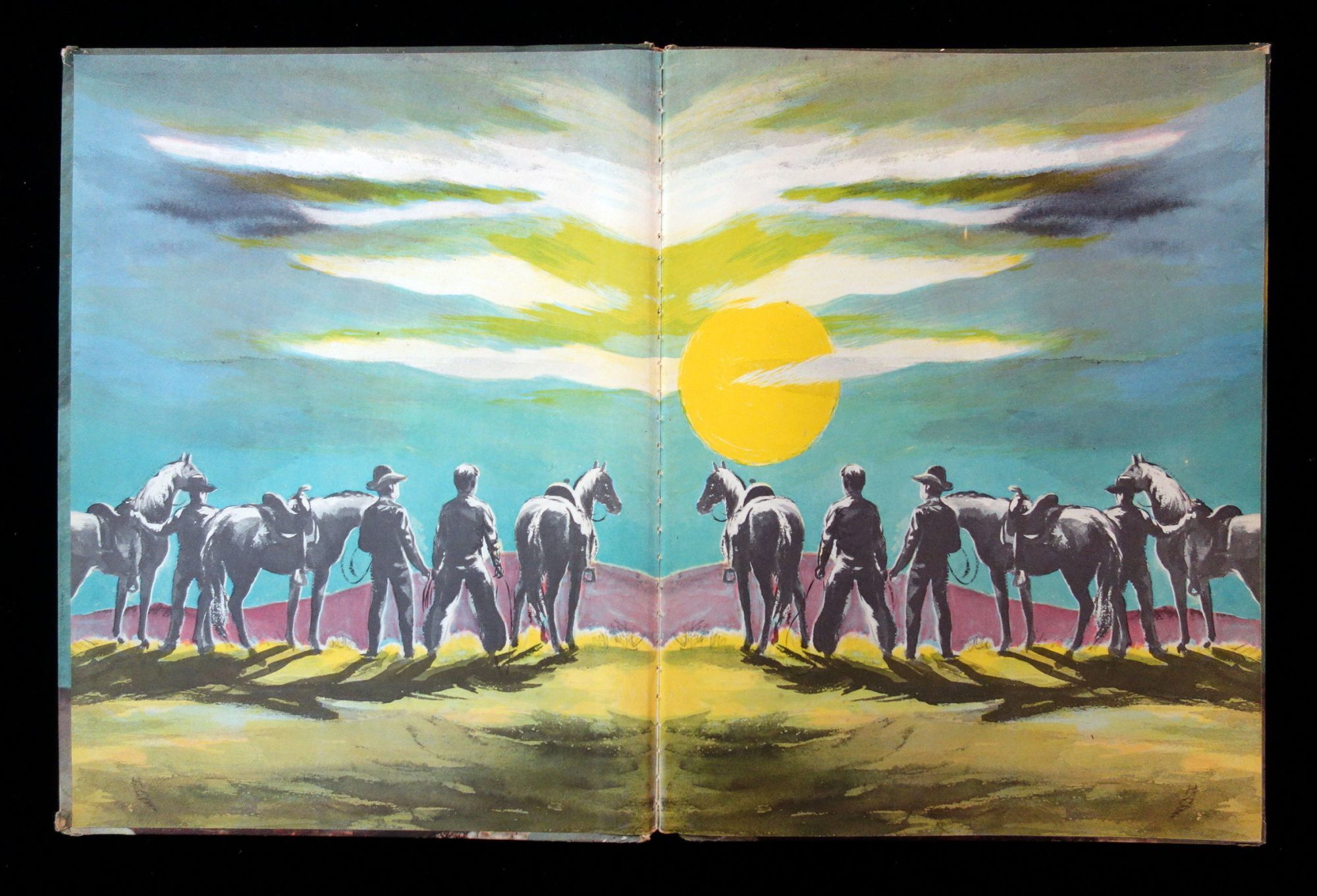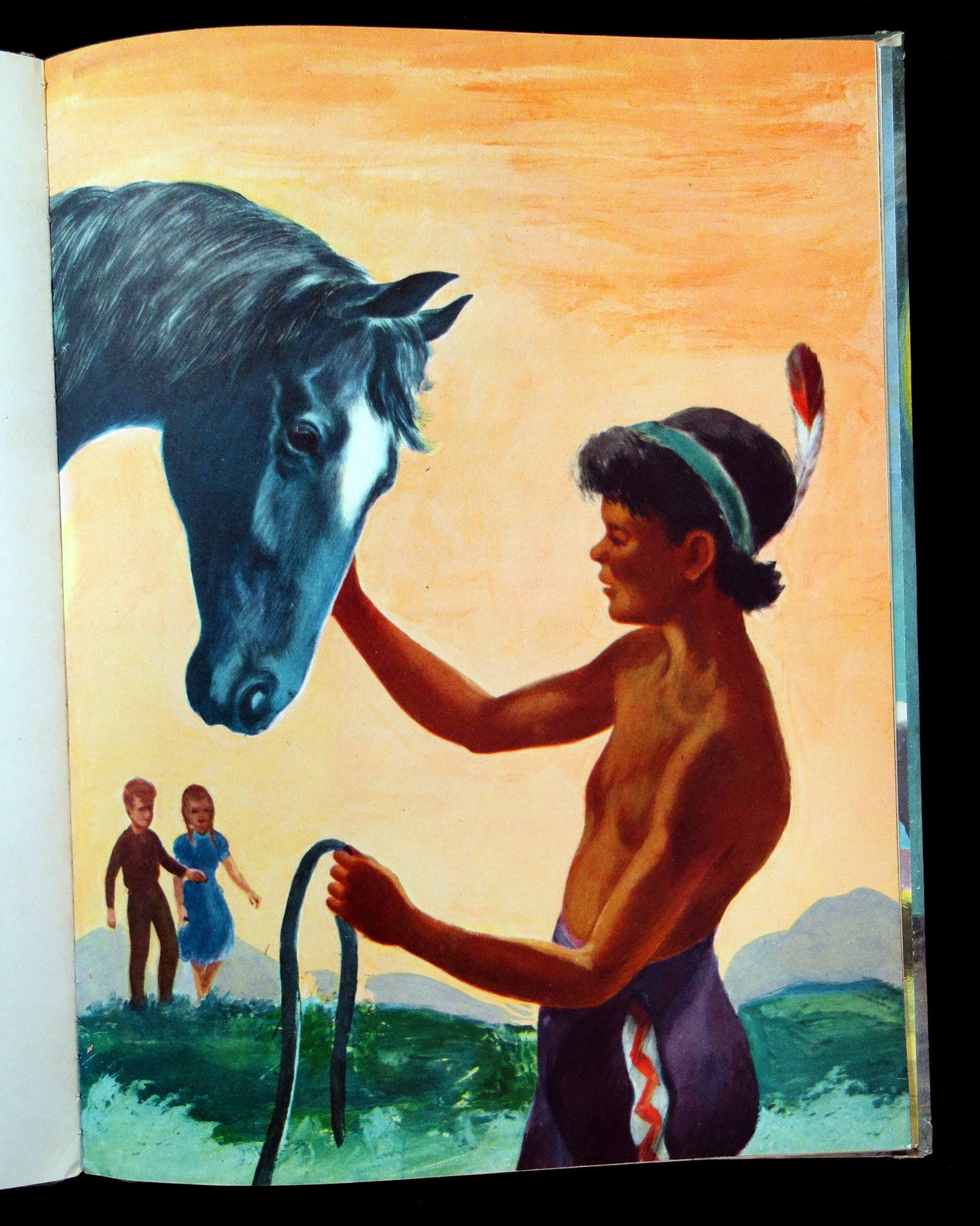 Kansas City, MO: Tell Well Press, 1949. 29 pp. (unpaginated) children's book, tells the story of Danny Morgan, his cousin Melissa, and their friend Eagle, an Indian boy, as they solve the mystery of the phantom silver stallion. Called a "corking good story", it is chalk full of vibrantly colored, or charming black and white illustrations on nearly every page. A must for any child horse lover.