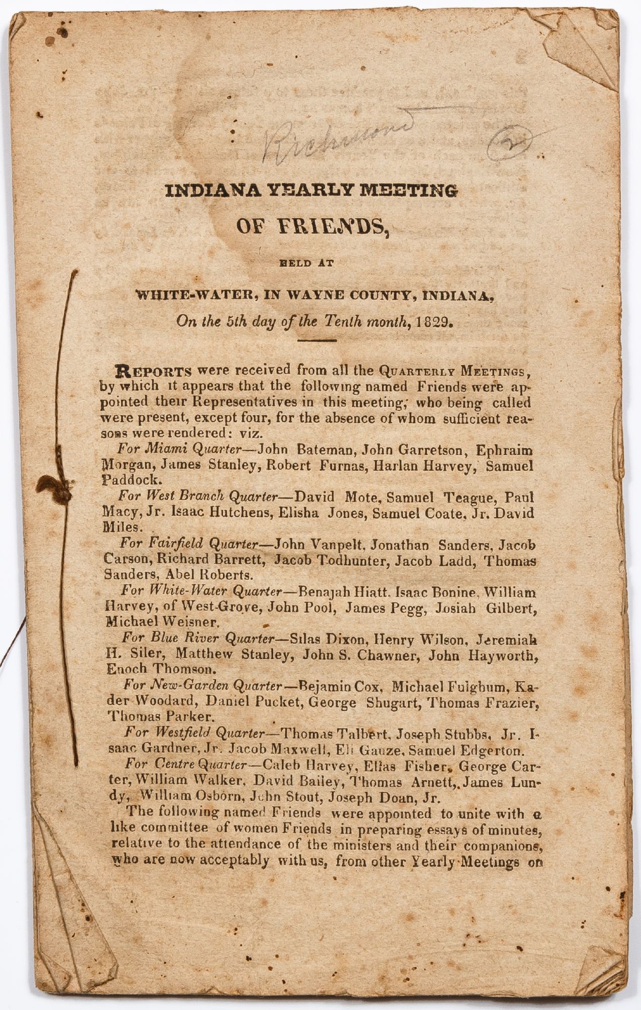 Indiana Yearly Meeting of Friends, held at White-Water, in Wayne county, Indiana, on the 5th day of the Tenth Month, 1829