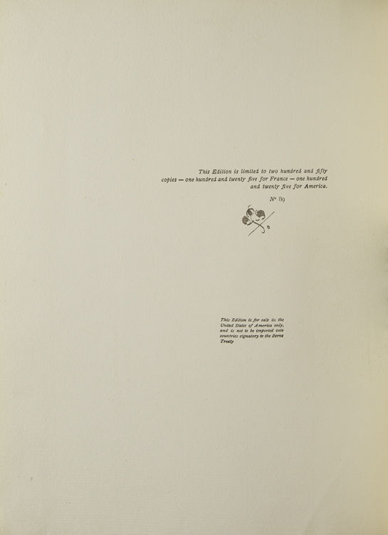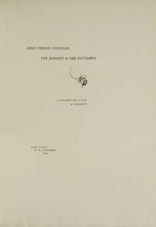 New York: R.H. Russell, 1899. First American Edition, Number 89 of 250 large paper copies. 125v for France and 125 for America. [xxxii], 79 pp. 1 vols. 8vo. Original tan cloth-backed boards, with title and gilt butterfly device on upper cover, uncut and unopened. Spine slightly darkened, else Fine copy. Bookplate of S.l. Deitsch. First American Edition, Number 89 of 250 large paper copies. 125v for France and 125 for America. [xxxii], 79 pp. 1 vols. 8vo. Whistler's famous row with William Eden over the portrait of Lady Eden and the eventual lawsuit.