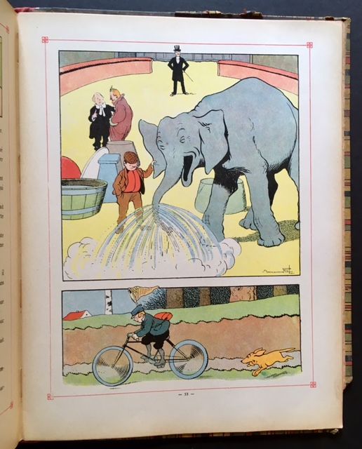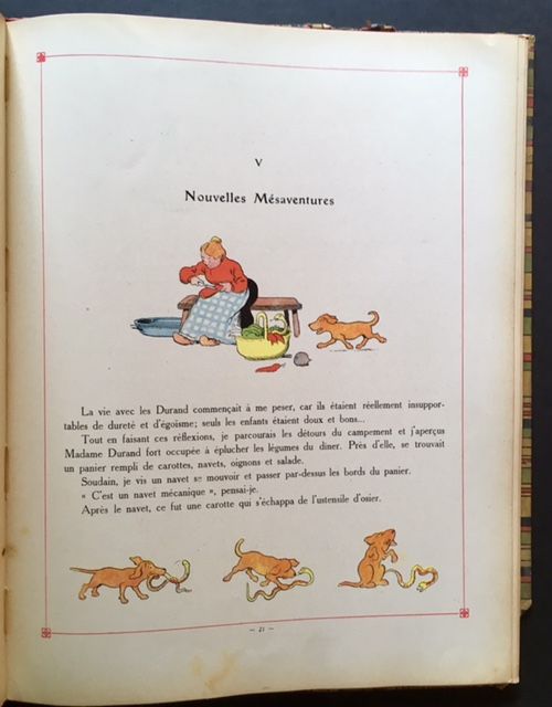 Paris: Editions Jules Tallandier, 1907. Hardcover. Very Good. Benjamin Rabier. A solid copy of this wonderful 1907 French children's tale of the misadventures of a certain incorrigible --but very cute-- dog. Tight and VG- in its decorative plaid cloth, with just a touch of soiling to the interior and light chipping at the rear panel edges (including 2" of loss along the rear fore-edge). Still though, attractive and very presentable, and nicely illustrated in rich color by the author Benjamin Rabier himself. Tall quarto, published by Editions Jules Tallandier of Paris.