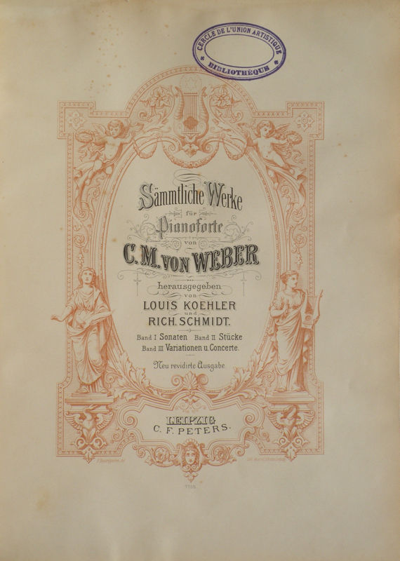 Later Peters editions use the same plates and title design, but they spell the name of Louis Koehler with an Umlaut and the word "Concerte" as "Konzerte"; instead of Rich[ard] Schmidt, they list August Ruthardt as co-editor; and their contents pages are re-engraved, with some including incipits. There is also an edition in one volume using the same plates and the title page of the present volumes 1 and 2, but the contents are arranged in a completely different order (sonatas coming last); the uniform plate number is 6176.