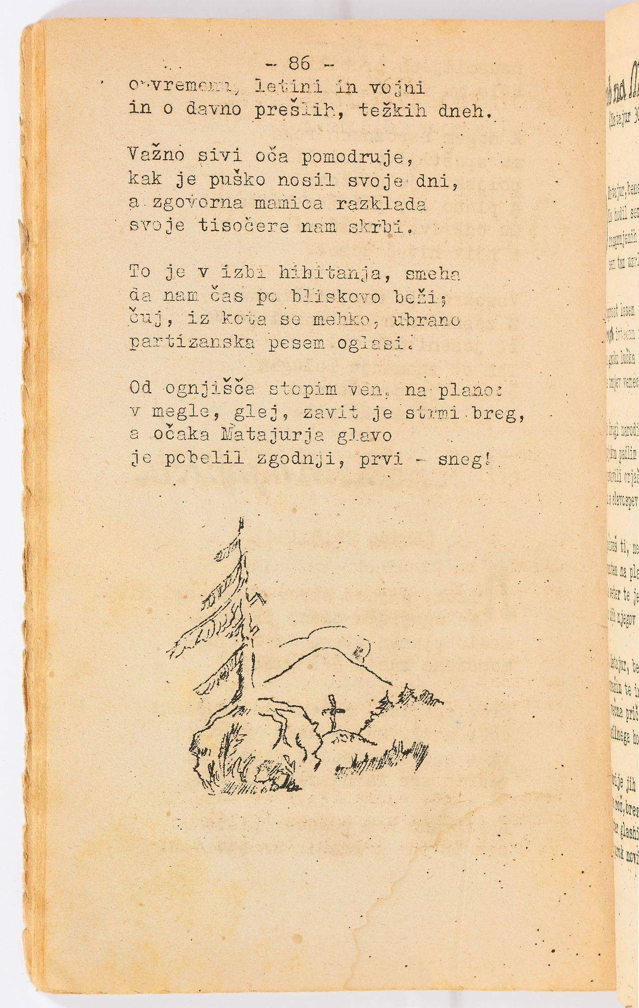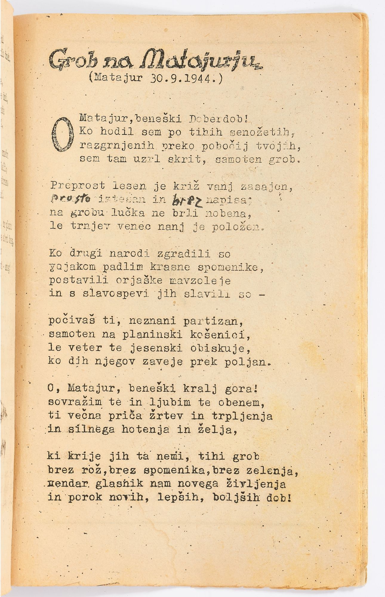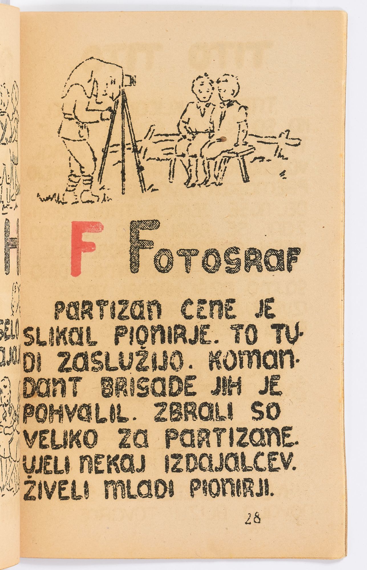 The corpus of their surviving works is diverse, and considering the circumstances of their production, by turns crude or surprisingly sophisticated in content, graphic design, and illustration. This collection features 14 pamphlets chosen for their subject matter and rarity: *OCLC* locates no copies of 11 titles, and only two copies each of the other three works. Included is the only known surviving first edition of Matej Bor’s *Raztrganci* [The Vagabonds], the most acclaimed Partisan work of theatre, and one of the earliest first-hand accounts of life inside the Mauthausen concentration camp, printed by a Partisan press in 1944. Also included are four other works of arts and entertainment (theatre, music, poems), four military manuals, one medical field manual and one medical journal, a children’s alphabet book, and a pamphlet about Muslim women Partisans. Most are mimeographed, with mimeographed illustrations, maps, and music, and some also have black and white or color linocut illustrations.