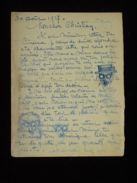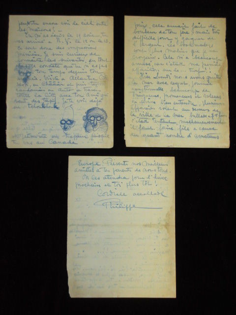 N.p., 1927. Very Good+. (ALS), Octavo, 6 pages, to a friend "Christian." With three caricature drawings in the text - written in blue ink. Philippe Swyncop (1878 - 1949) was the older brother of Charles Swyncop, both were accomplished artists. Philippe lived in Spain for 12 years, produced valuable works in oil, watercolor and prints.