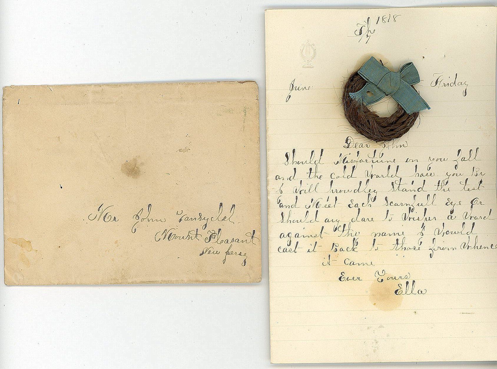 1820. Single-fold 5" x 3 3/4" sheet with sentiment and circle of plaited hair and decorative hand cut paper hearts. The verse reads: