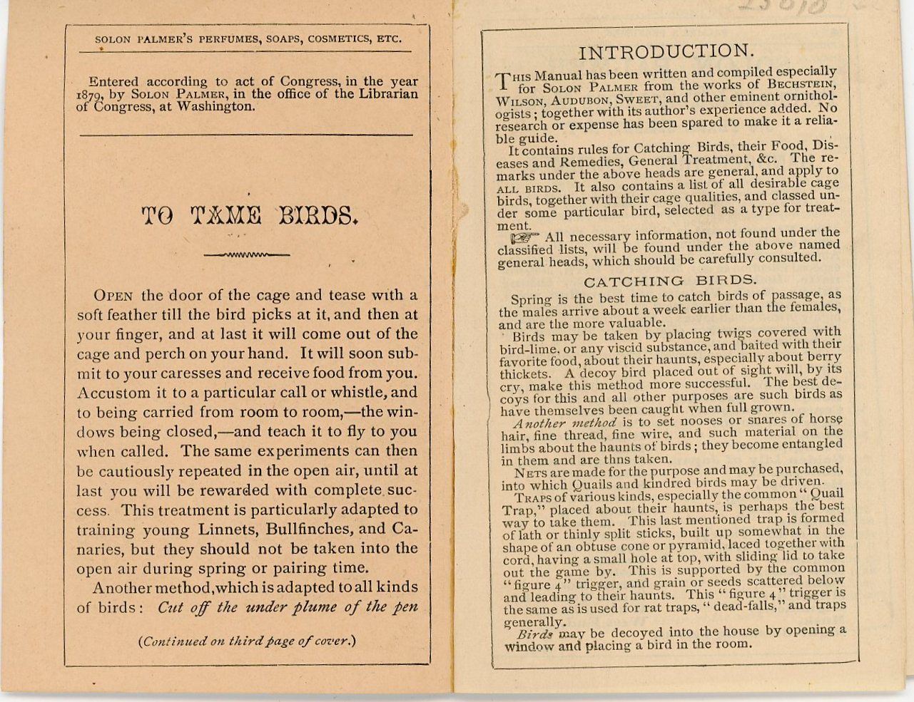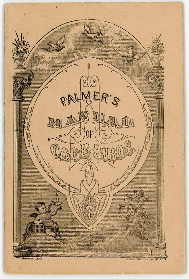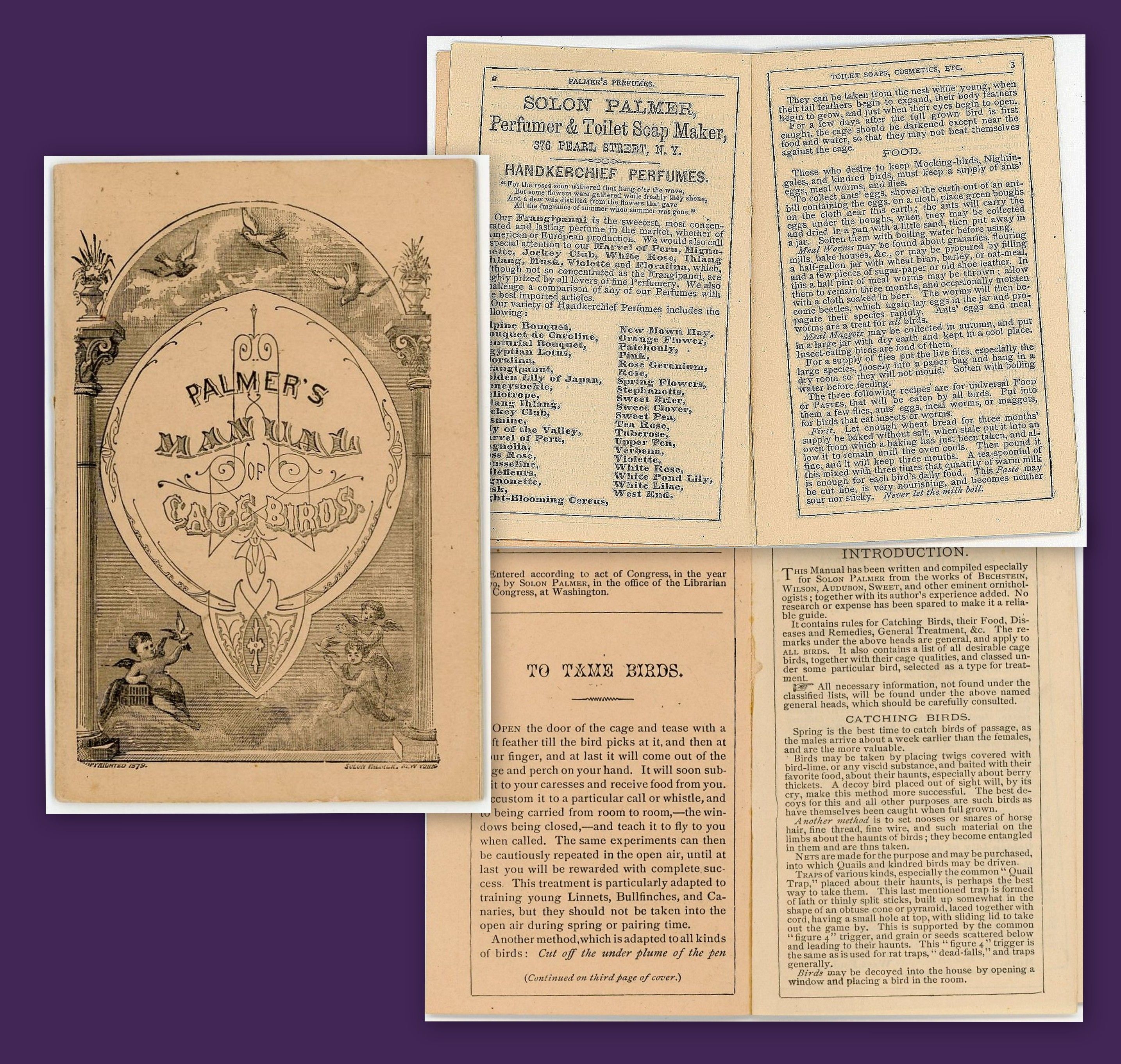 New York: Solon, 1879. A 32 pp booklet providing information how to catch and tame birds, bird food, cages, breeding, extensive information on diseases and remedies followed by general remarks, the canary, breeding, singing, molting and varieties. The remainder of the book focuses on Palmer's products including perfumes, soaps, lotions and other remedies. Illustrated covers. Measures 4 3/4" x 3 1/4