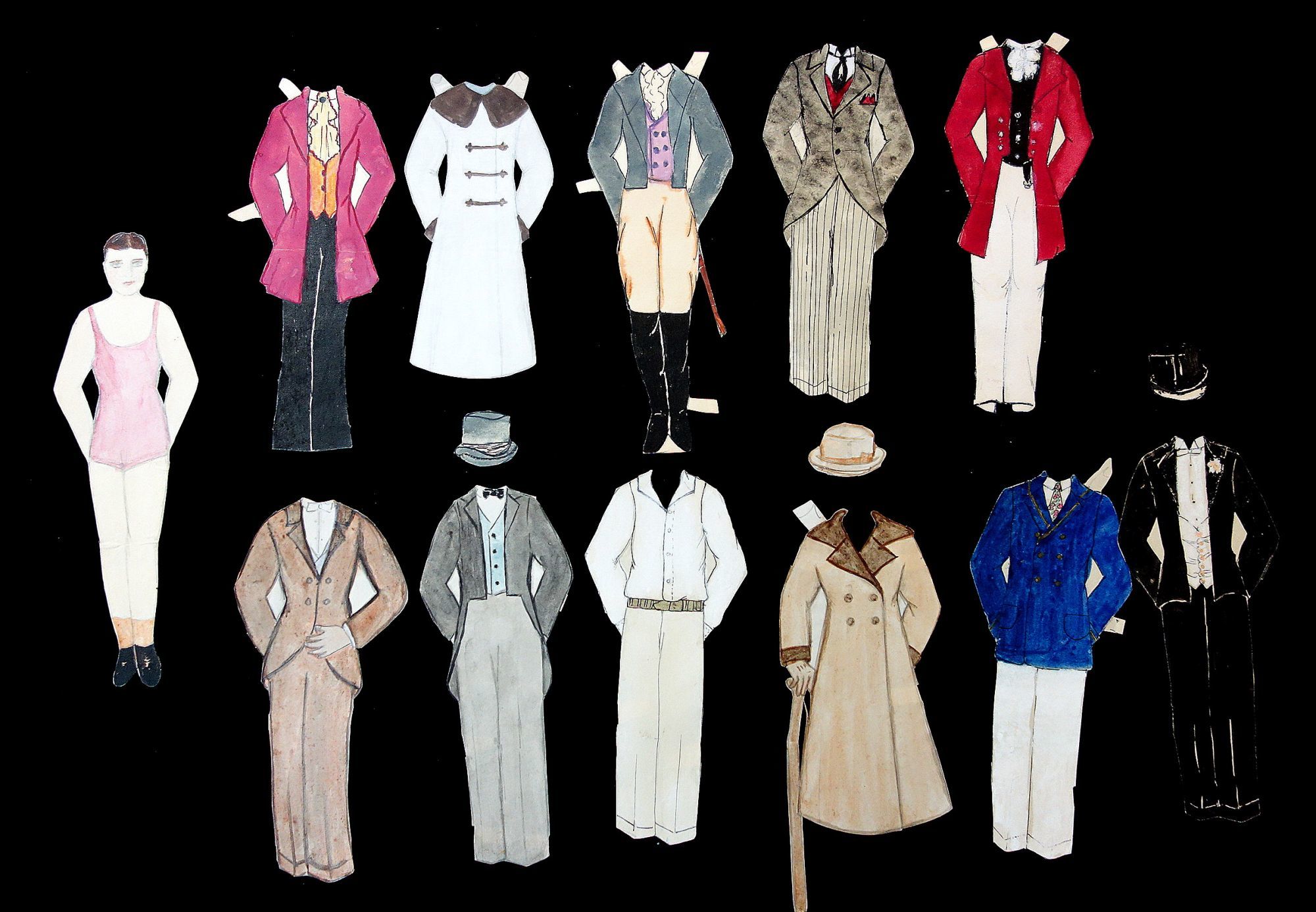 A 7 3/4" tall watercolor paper doll. A tidy gent with broad-set eyes. His 11 costumes appear to be both contemporary to the 1940s while others are vintage. Four are labeled on reverse - lounge suit, yacht suit, full dress suit and tennis suit. Three fine hats accompany the outfits.