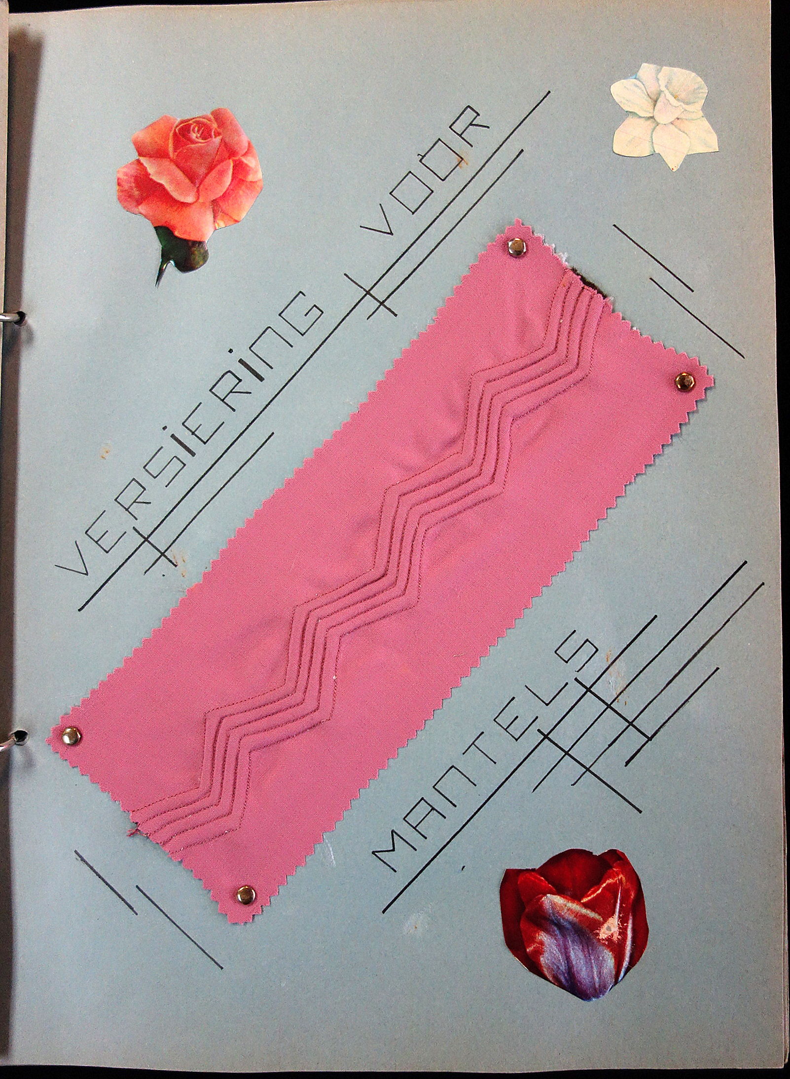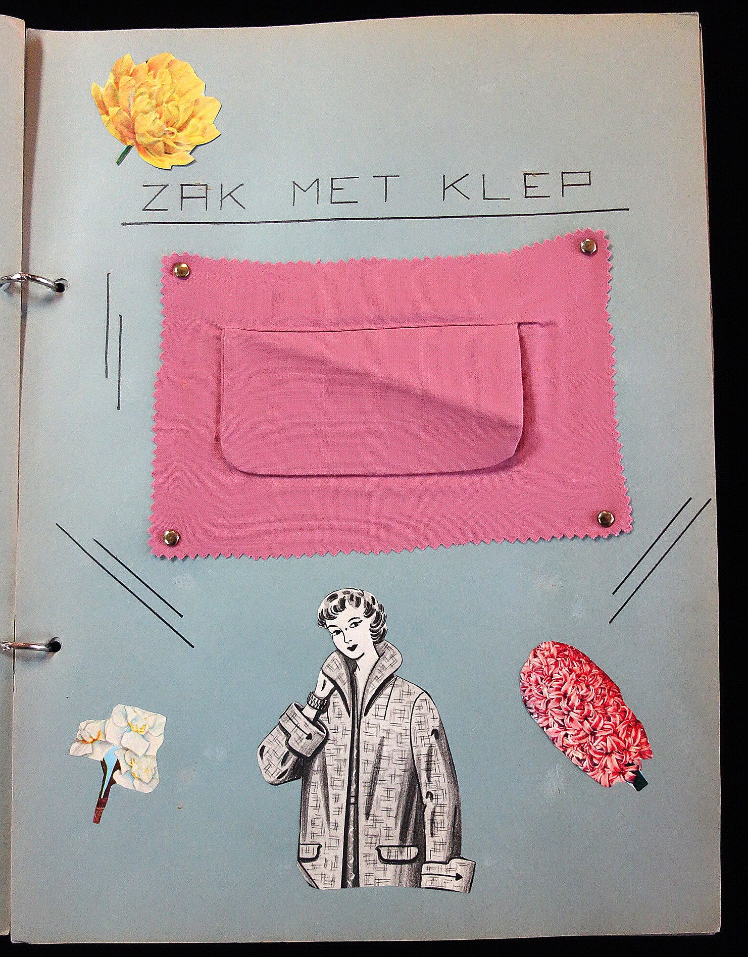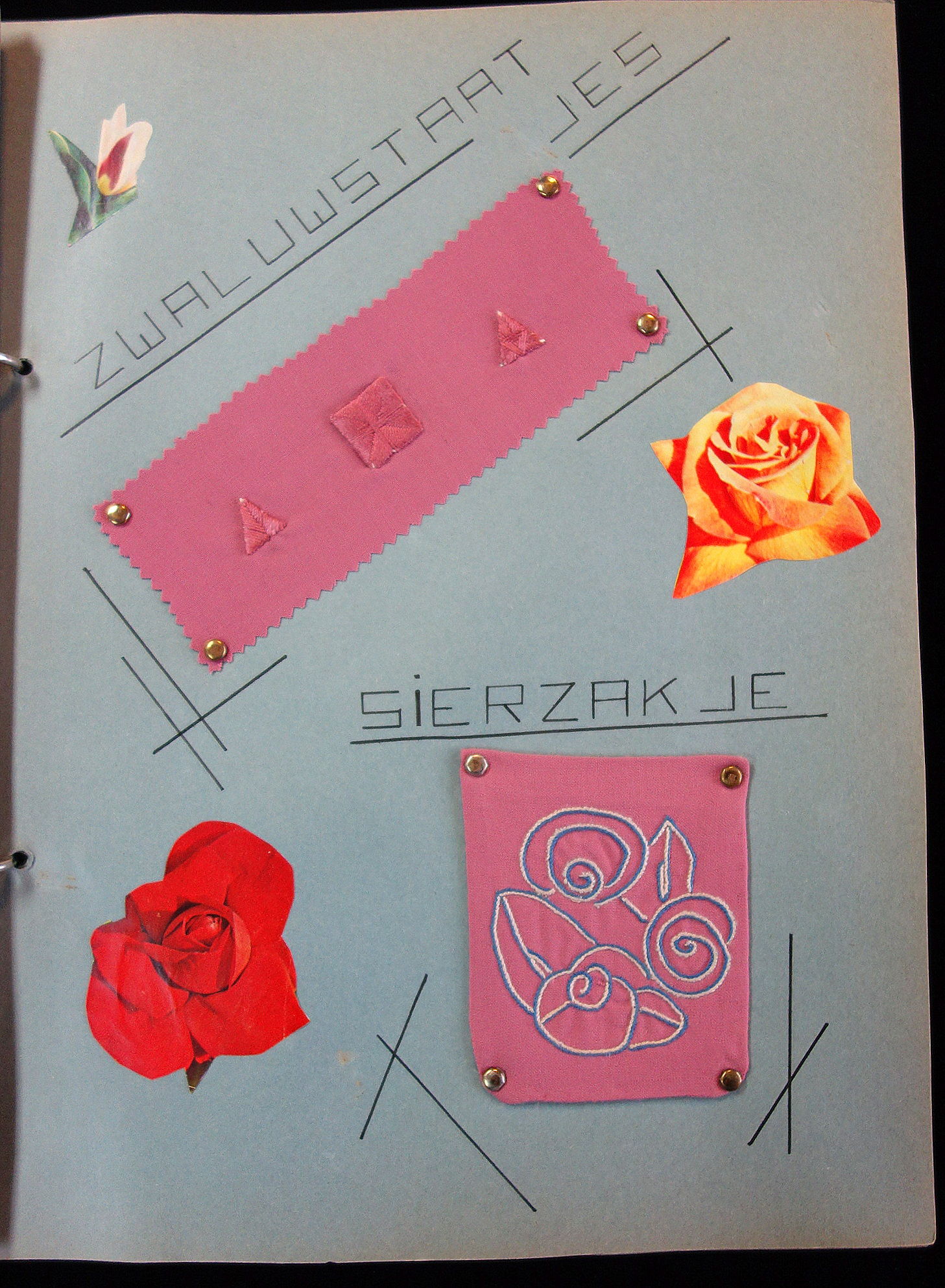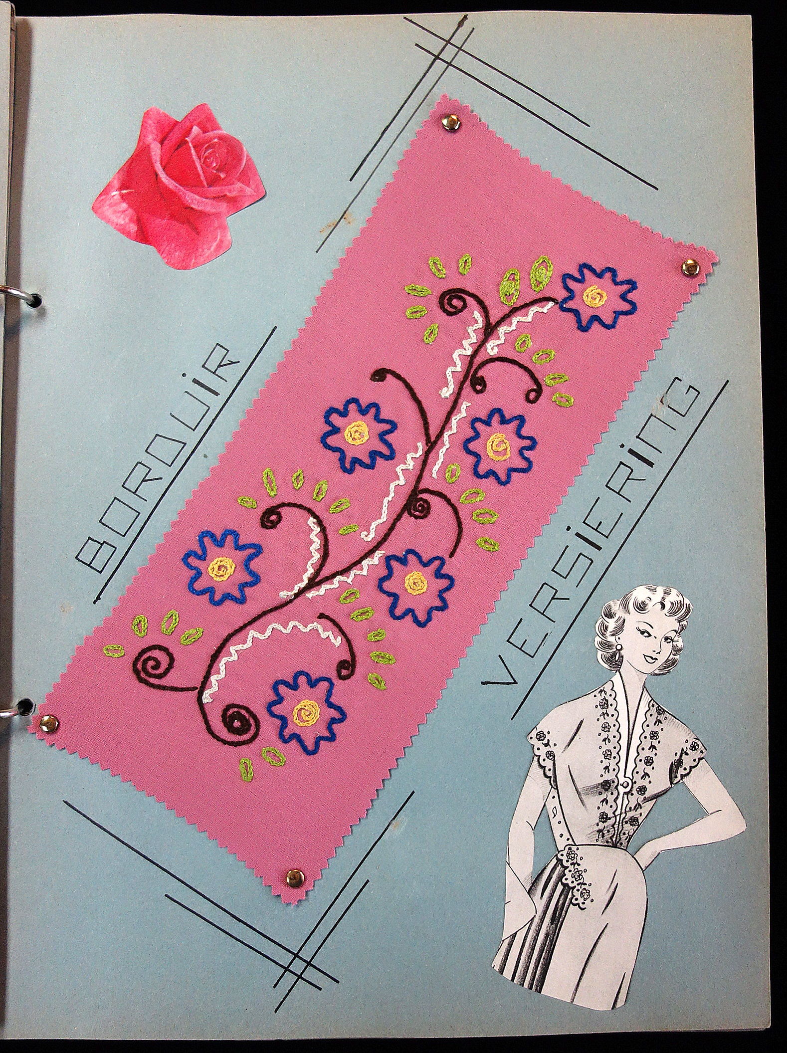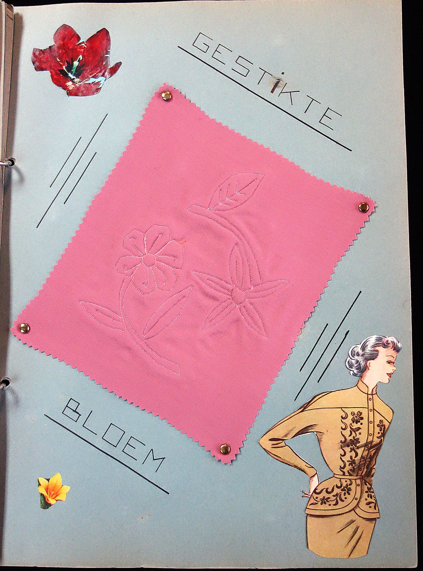 Bocholt, Belgium, 1961. Large format with pen and ink cover decoration. Includes ten (10) pages with seventeen (17) different samples. Each sample is captioned identifying the work and is accompanied by a magazine cut-out showing an example of the work on a garment. 11” x 14 ½”. Meticulous work. Minimal cover wear.