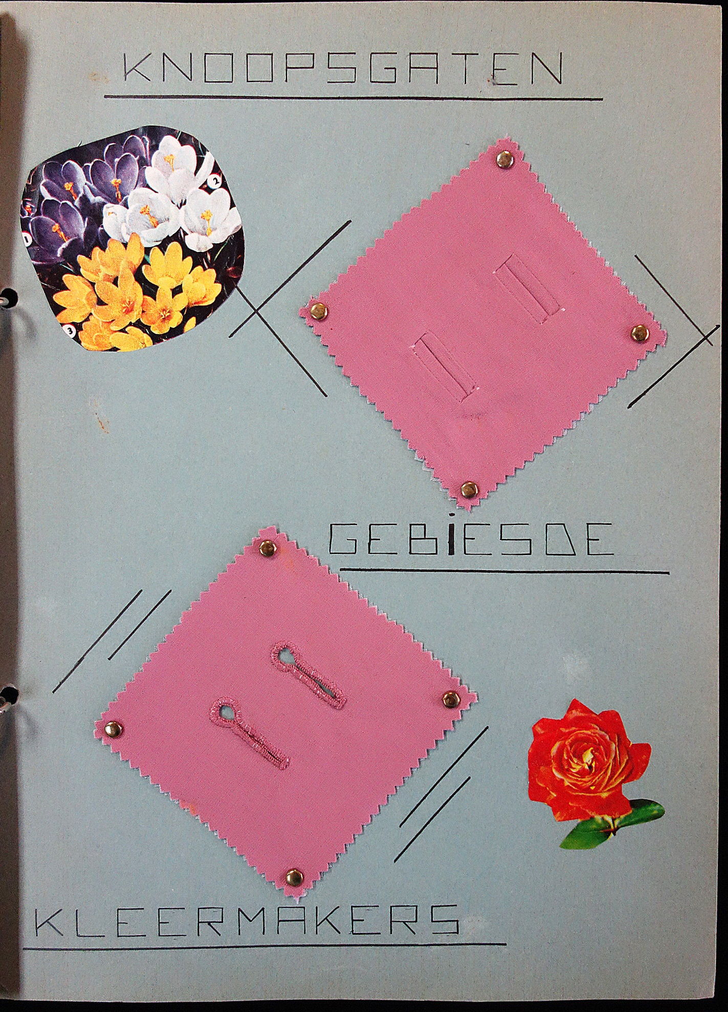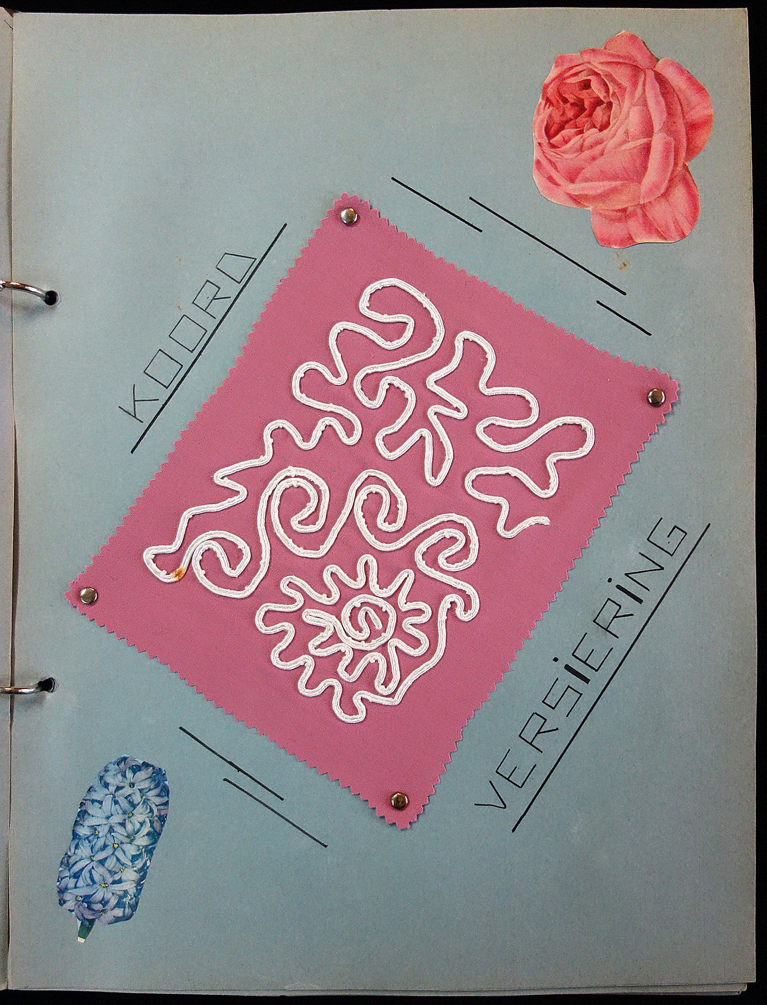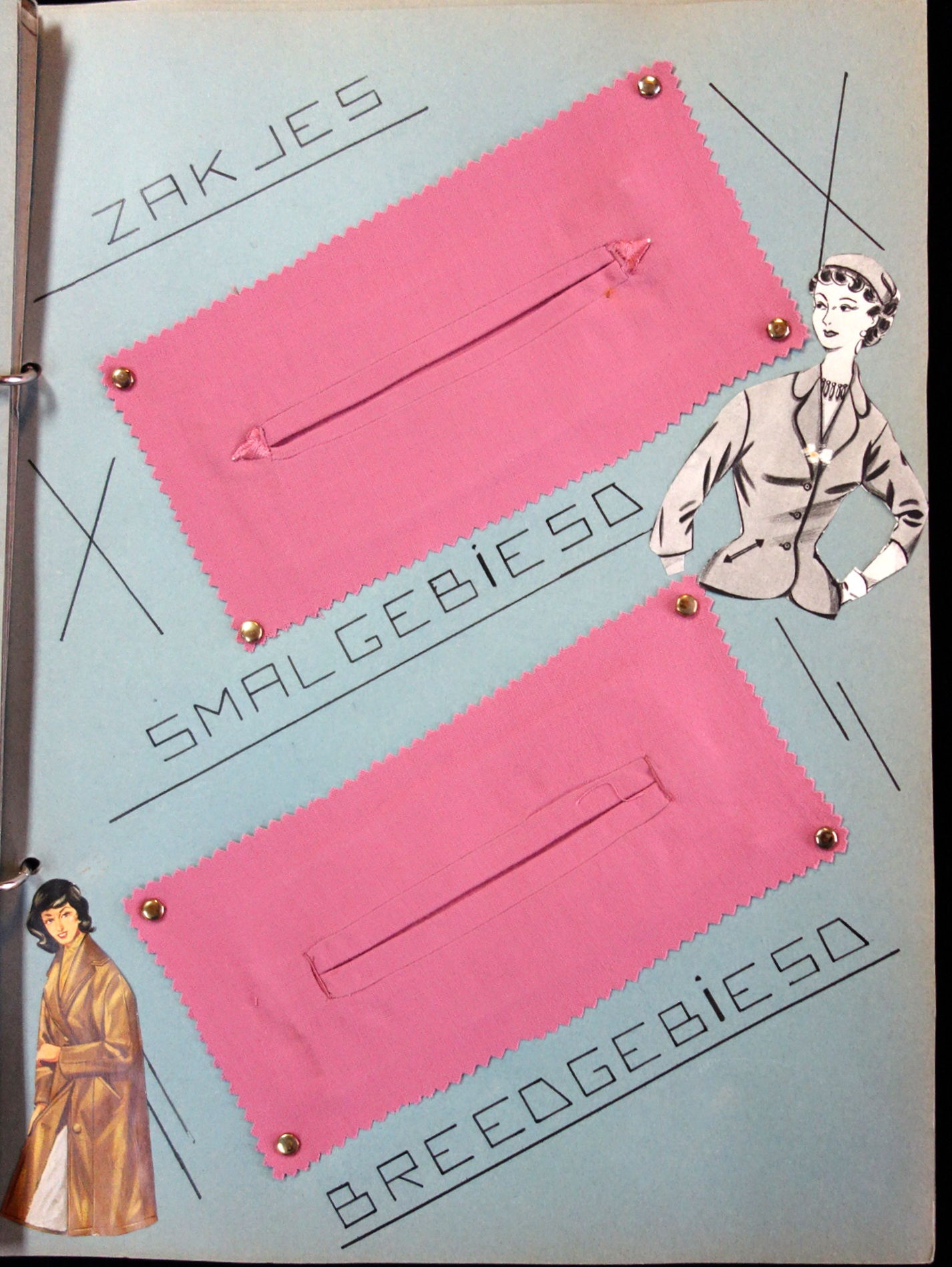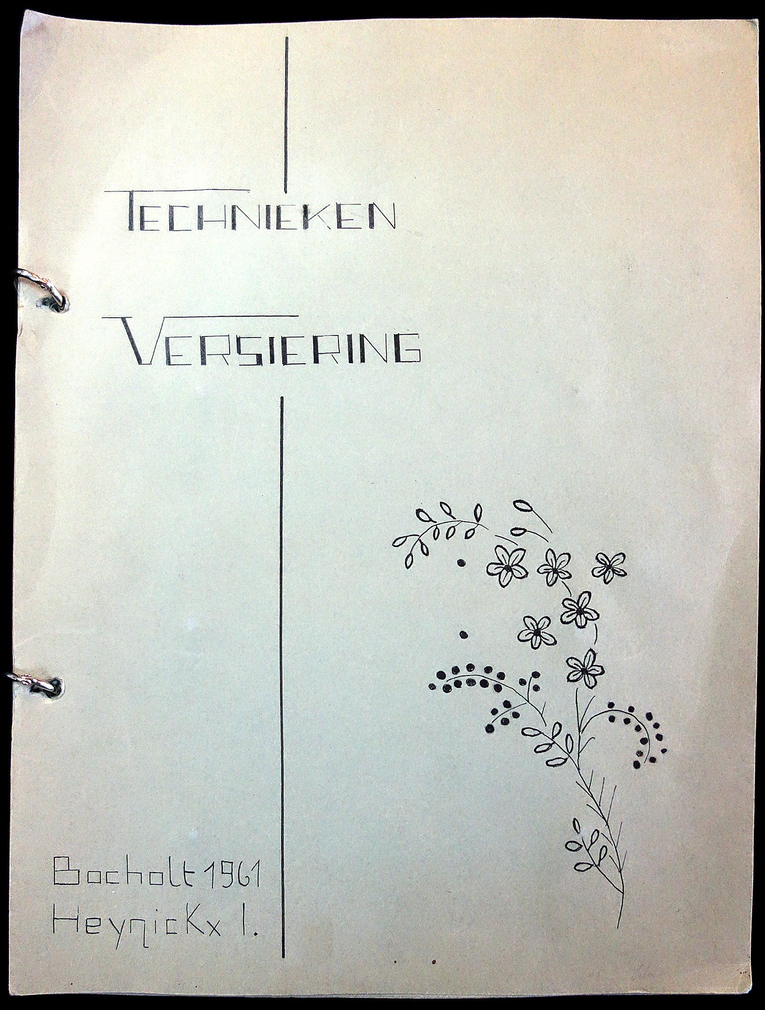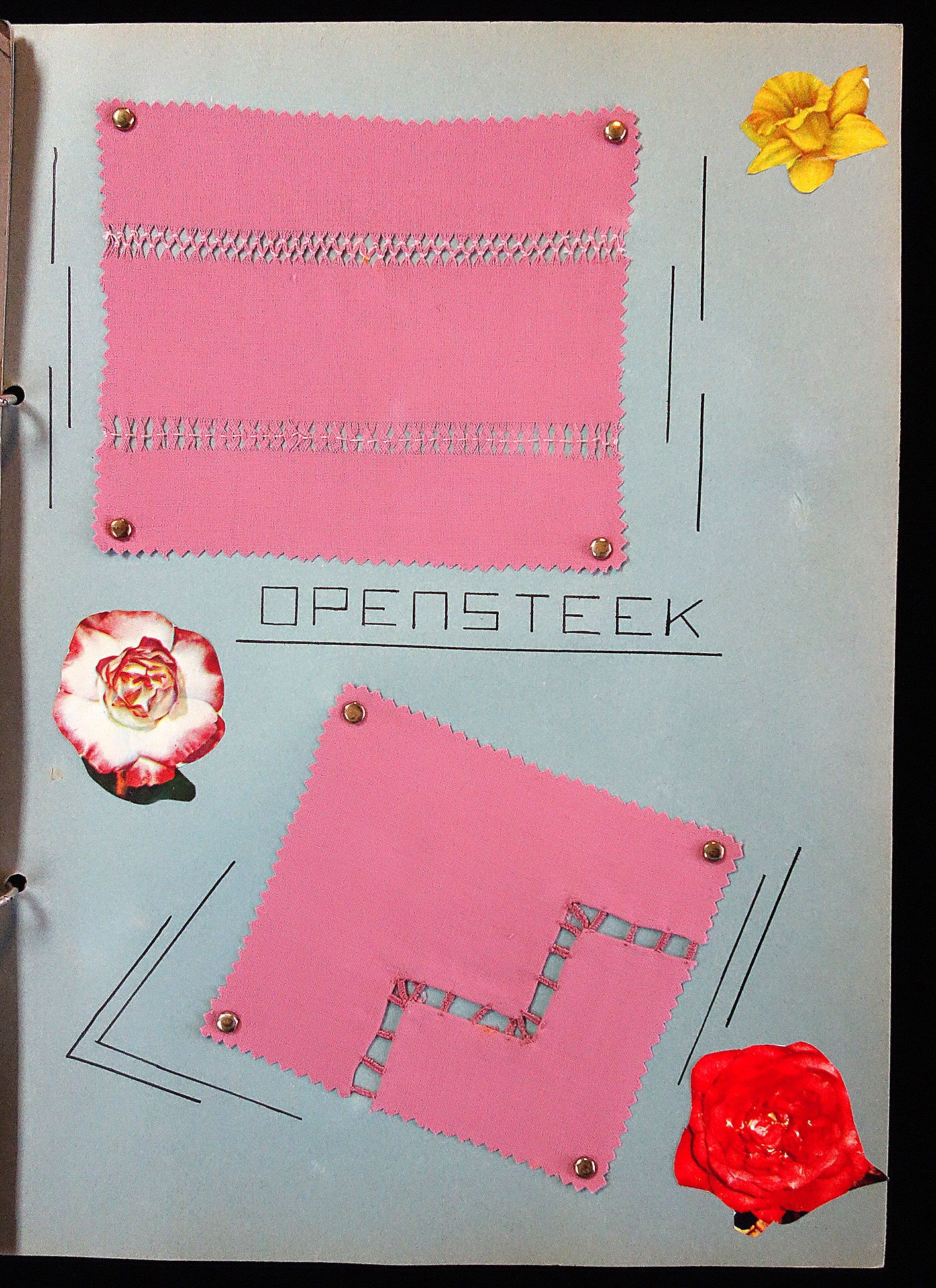 Bocholt, Belgium, 1961. Large format with pen and ink cover decoration. Includes ten (10) pages with seventeen (17) different samples. Each sample is captioned identifying the work and is accompanied by a magazine cut-out showing an example of the work on a garment. 11” x 14 ½”. Meticulous work. Minimal cover wear.