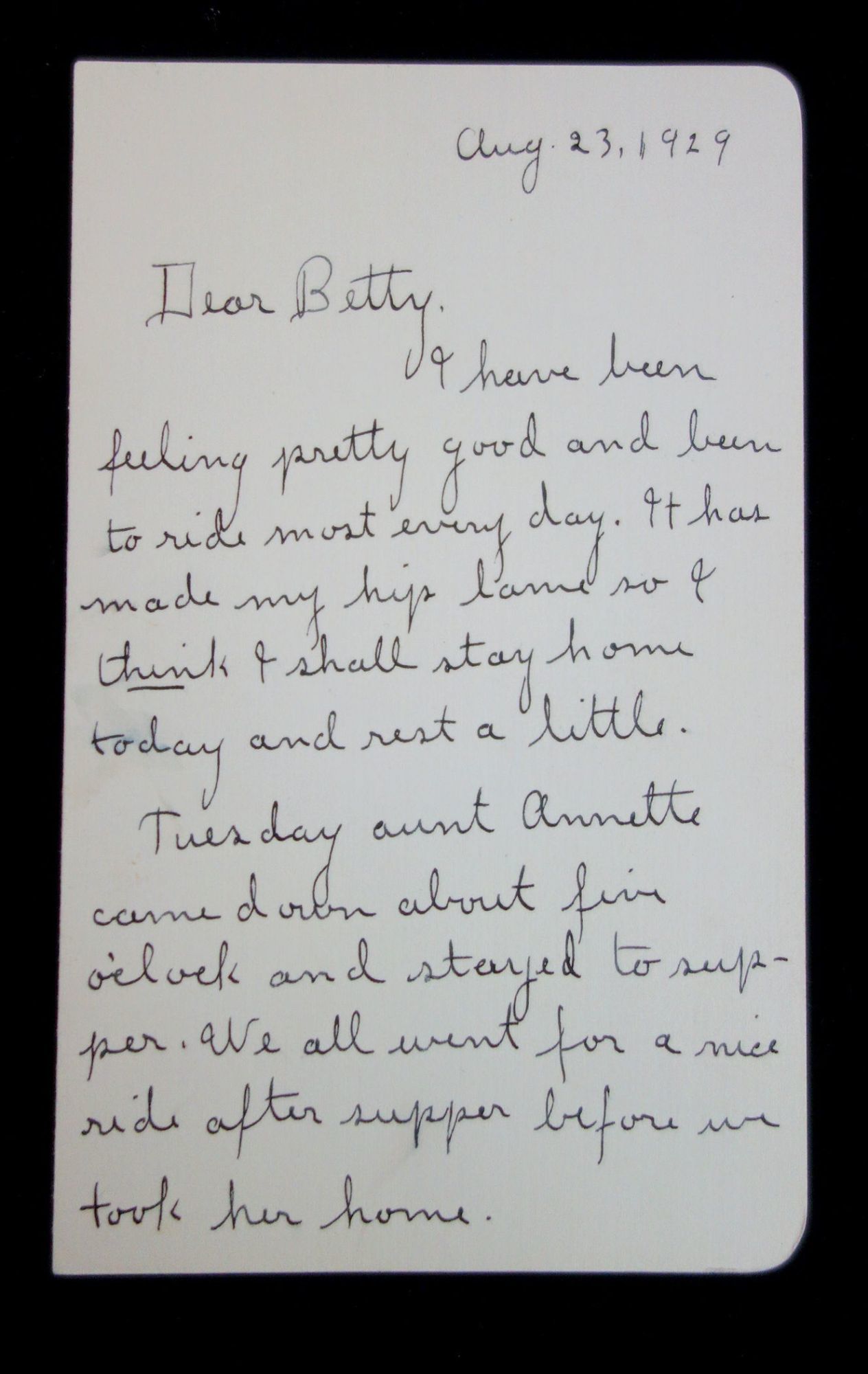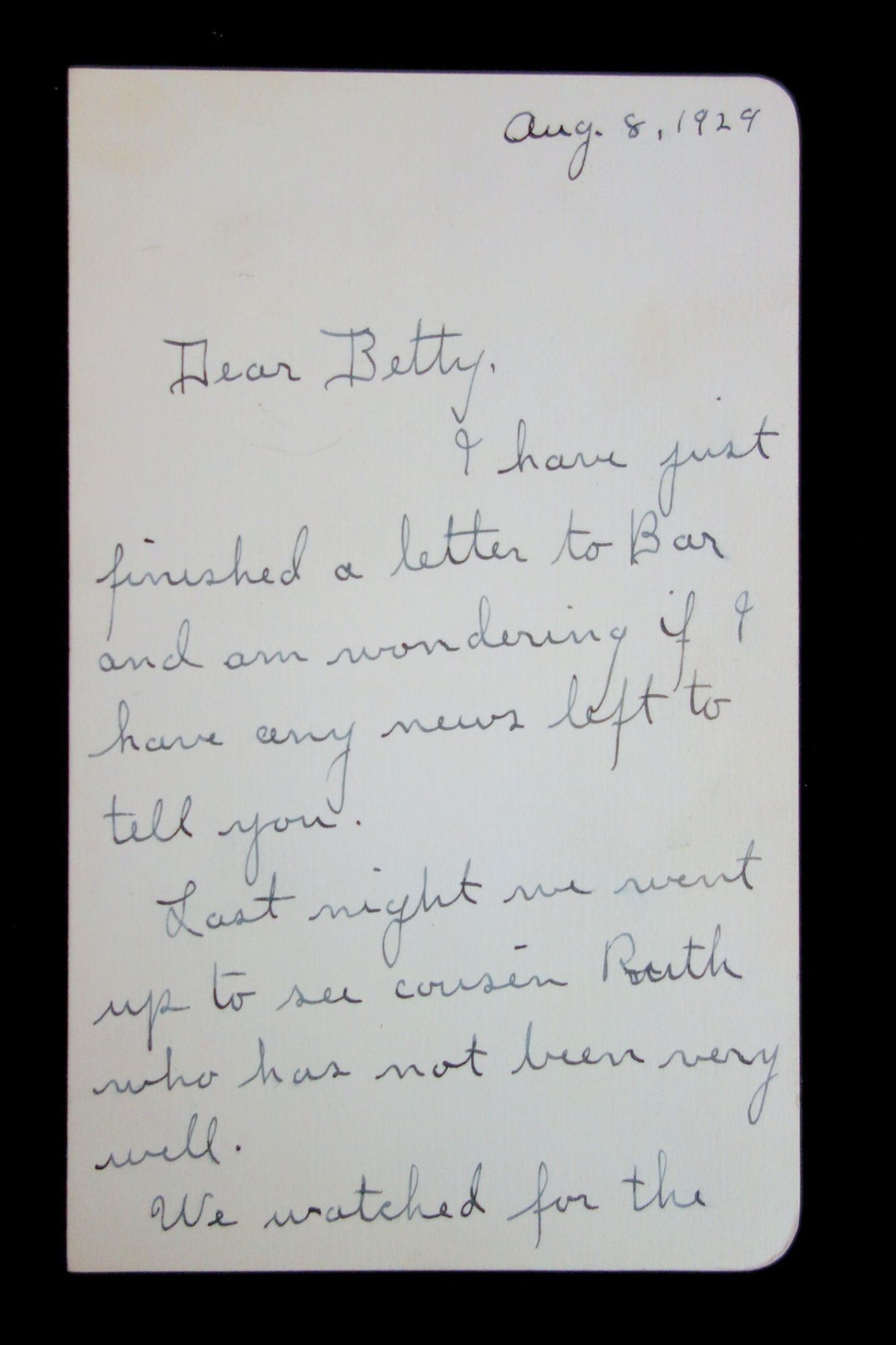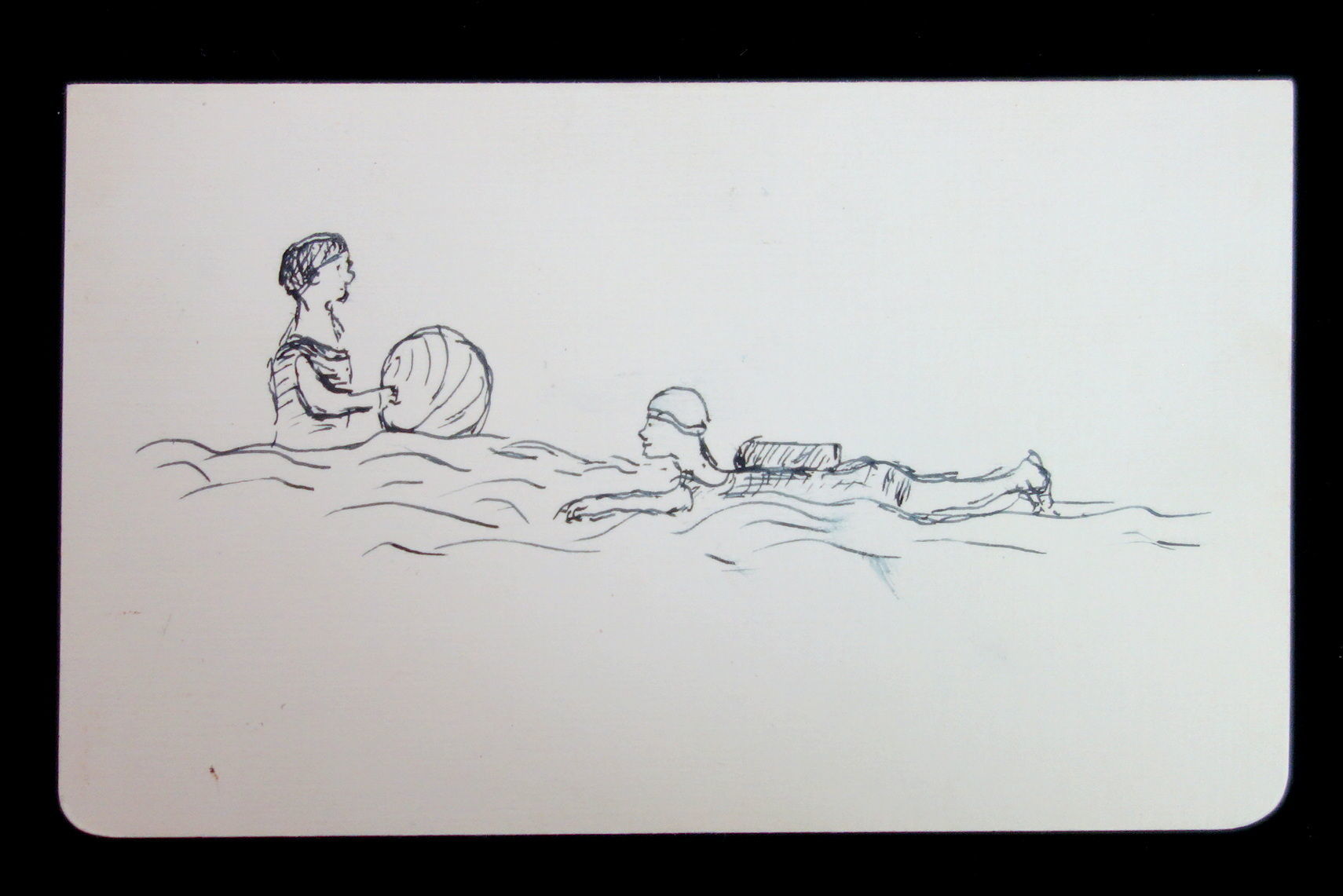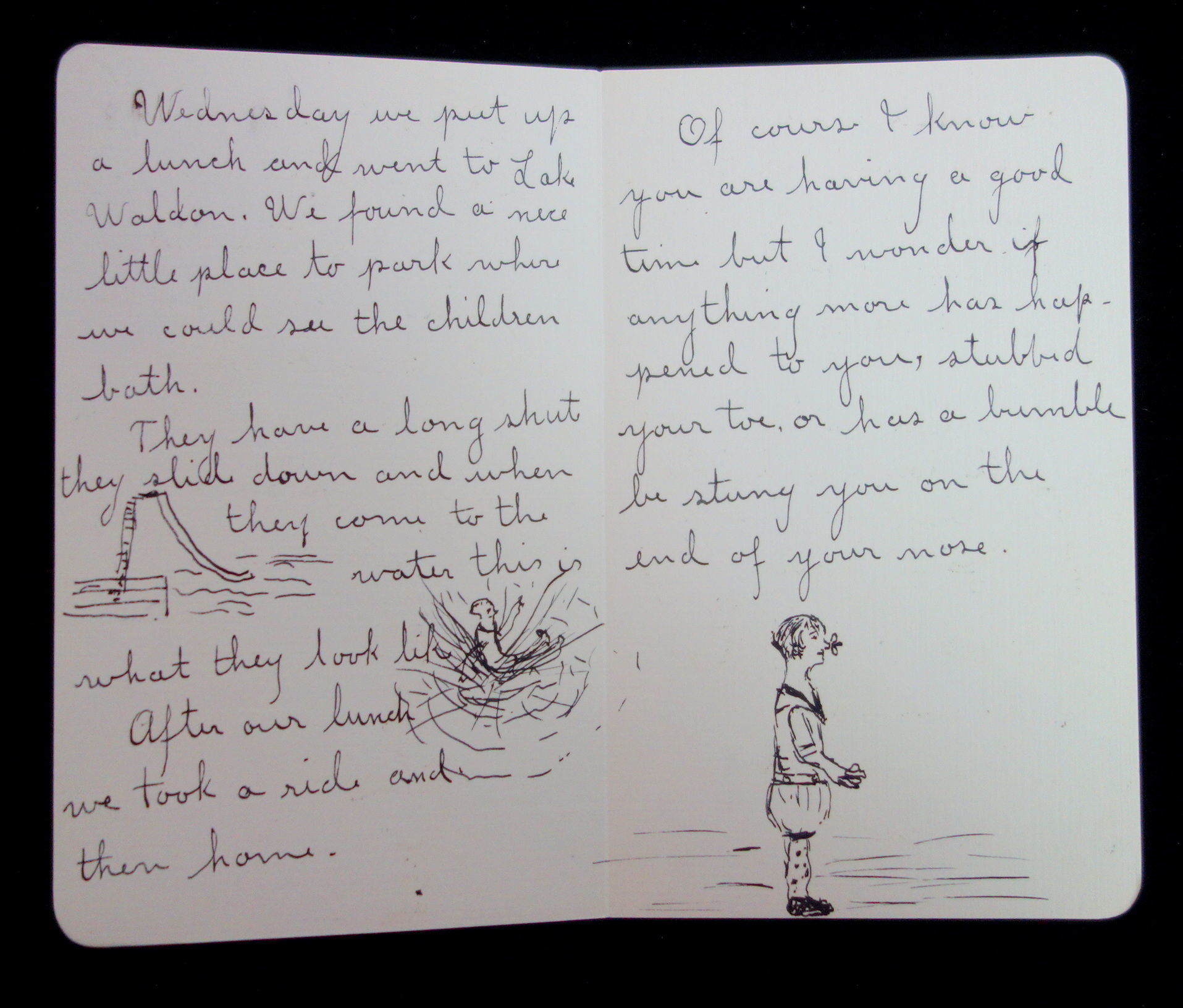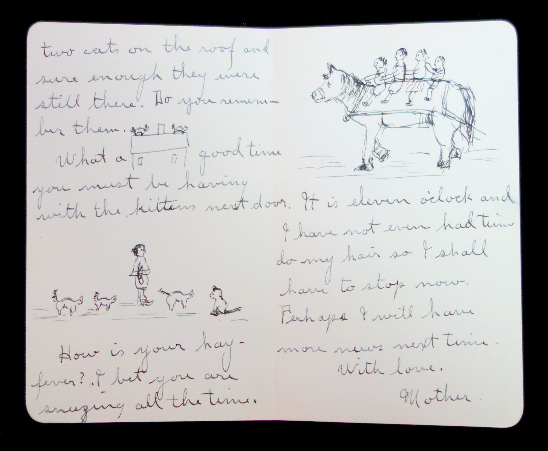 Boston MA, Aug-29. Two whimsical letters from a mother to one of her two daughters, Elizabeth Simon (nicknamed Betty). The first letter mentions a visit to their cousin Ruth, who has two cats on her roof. The missive continues on asking her how here hay fever is doing and if she has had anytime to play with the kitten next door. Lastly it mentions the mother has been so busy that morning that even though it is 11 AM, she still hasn't had time to fix her hair.The letter is embellished with four pen and ink drawing- two cats on a roof of house, little girl playing with cats, four children riding on a horse, and two children playing in the water. The second letter is longer than the first. It starts with the mother telling Betty that she has been feeling better lately, though her hip is hurting her pretty badly so she will most likely stop riding soon. It discusses a visit from their Aunt and a picnic lunch she had a Lake Waldon. There she watched several children on a water slide. She then inquires after what Betty has been doing in her spare time and if she has any stories to share, such as a stubbed toe perhaps or a bee landed on her nose? It ends with the hope that Betty will borrow her sister's, Barbara's, water wings to help her float. In-text drawings of a water slide, a child landing in the water, and presumably Betty with a bee on her nose. Measures 5 1/4" x 3 1/4" (folded card). The envelope is toned due to age and the letters themselves some minor soiling, otherwise fine.