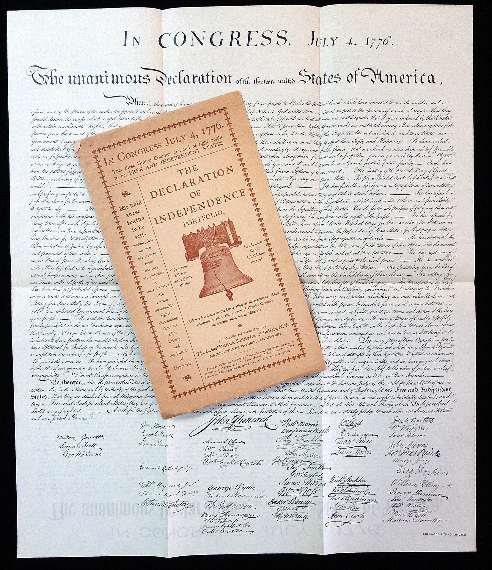 Buffalo, NY: The Ladies' Patriotic Society Co.,, 1899. A 17 1/2" x 14 1/2" facsimile of the Declaration of Independence, about one-third in size; also a copy of Charles Carroll's manuscript additions in 1826, etc. Compiled and Published by The Ladies' Patriotic Society Co., Distributors of Patriotic Literature. The Society is desirous that every citizen, especially young person and boys and girls, should study thoroughly or commit to memory the Declaration of Independence. A fee of 10 cents is proposed. Found in original envelope. NO OCLC or other internet reference to the Society. 3/2017.