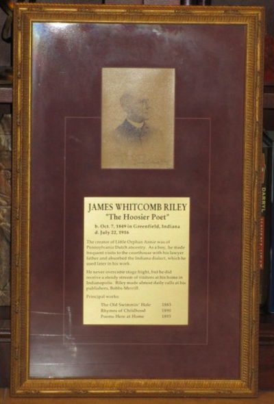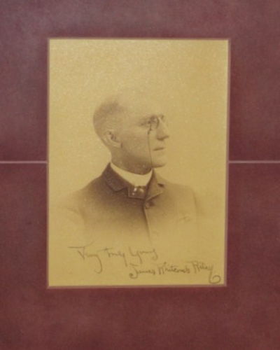 Fine. Offered is a photograph signed and inscribed by James Whitcob Riley. The photograph is in a museum quality frame with engraved biographical plate. Riley (Oct. 7, 1849 - July 22, 1916) was known as "The Hoosier Poet". He was the creator of Little Orphan Annie. His principal works are: "The Old Swimmin' Hole"; "Rhymes of Childhood"; and "Poems Here at Home."