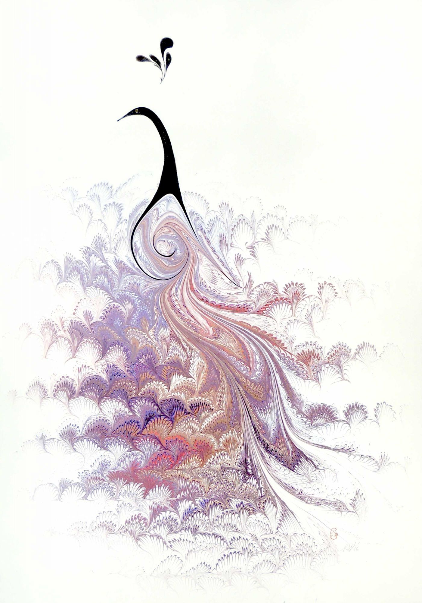 Toronto: Studio Robert Wu, n.d.. Fine. An exquisite hand marbled sheet by master marbler Robert Wu depicting a peacock in an elaborate multi-colored design. As the sheets are done individually, each varies slightly and is unique. Wu has been experimenting with paper marbling for many years and has developed a unique take on this traditional art form which he calls “marbled graphics.”