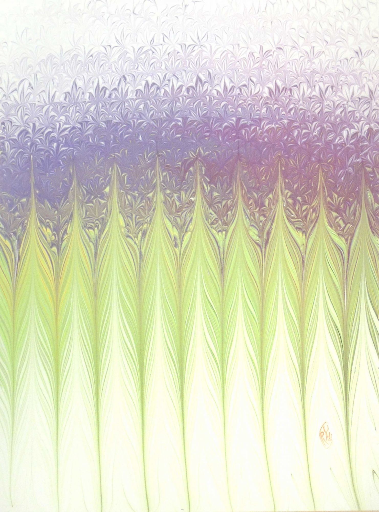 Toronto: Studio Robert Wu, n.d.. Fine. An exquisite hand marbled sheet by master marbler Robert Wu depicting a field of flowers done in shades of purple and green. As the sheets are done individually, each varies slightly and is unique. Paper size: 17 x 23 inches. ORIG/052217.