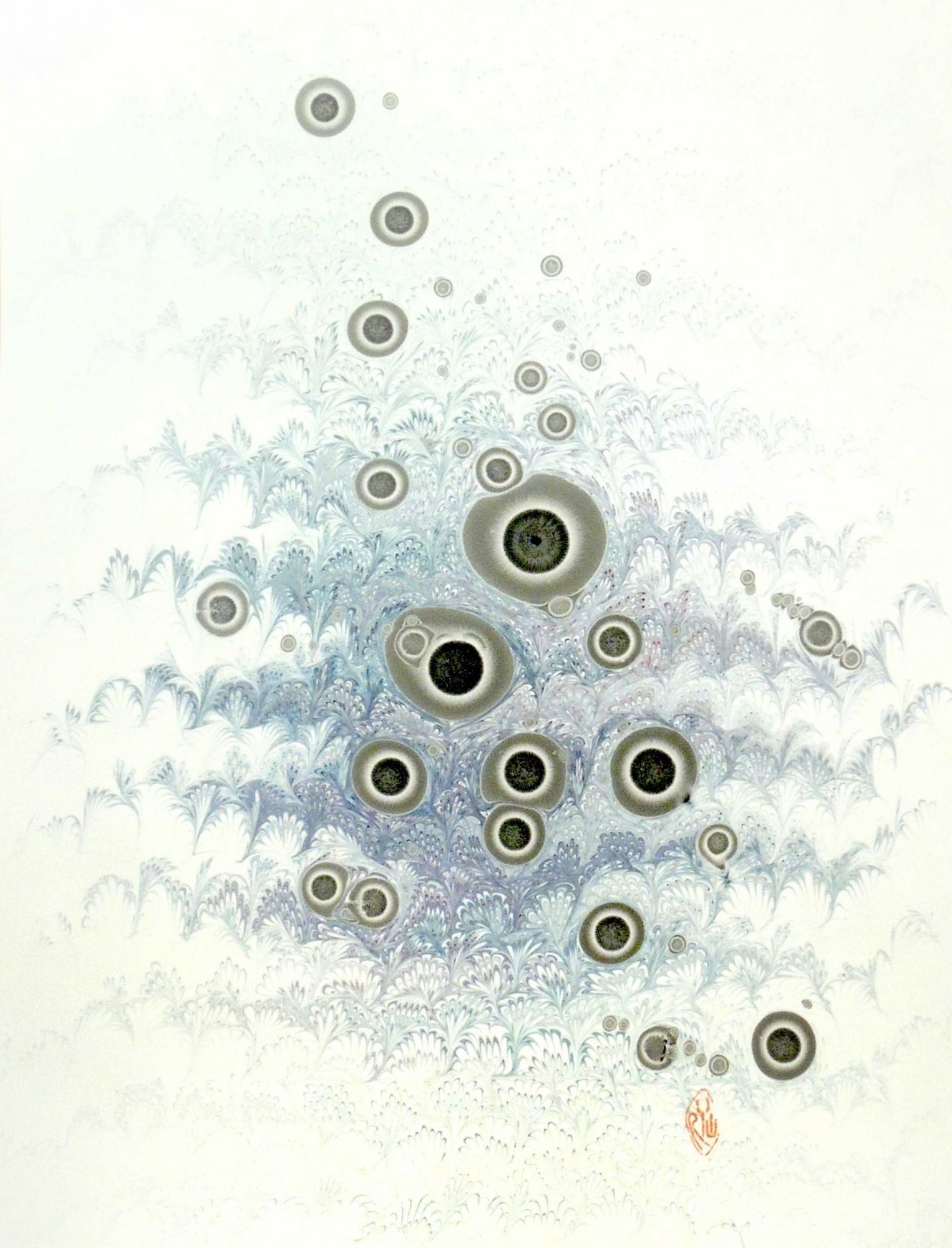 Toronto: Studio Robert Wu, n.d.. Fine. An exquisite hand marbled sheet by master marbler Robert Wu of an abstract bouquet with black tiger eyes speckled throughout. As the sheets are done individually, each varies slightly and is unique. Paper size: 17 x 23 inches. ORIG/052217.
