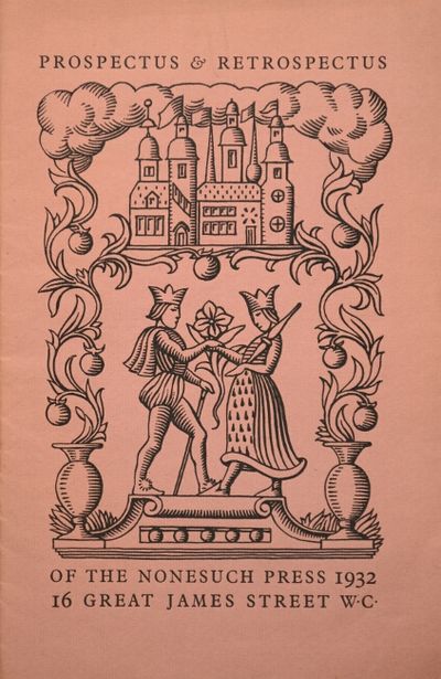 London & New York: Nonesuch Press & Random House, 1963. Four separate prospectuses in a terracotta cloth-covered clamshell box: 1) Prospectus & Retrospectus, 1932, a 16-page catalogue of upcoming books and books in print, with attractive pink pictorial wrappers; 2) 3 new Nonesuch books for the summer of 1934, 8-page prospectus, pictorial self-wrappers; 3) Sample Pages: The Nonesuch Dickens, 1938-39, pale green pictorial wrappers containing 5 leaves with sample text pages and illustrations; laid in is an announcement of Mitchell Kennerley's testimonial about the Nonesuch Dickens, printed in red; and 4) announcement of the nonesuch Bible in 3 volumes, 1963, issued jointly by Random House in New York, an 8-page prospectus with a facsimile title page, a bifolium on India paper sewn in, a printed letter from Random House, and an order form. All generally fine or near fine.