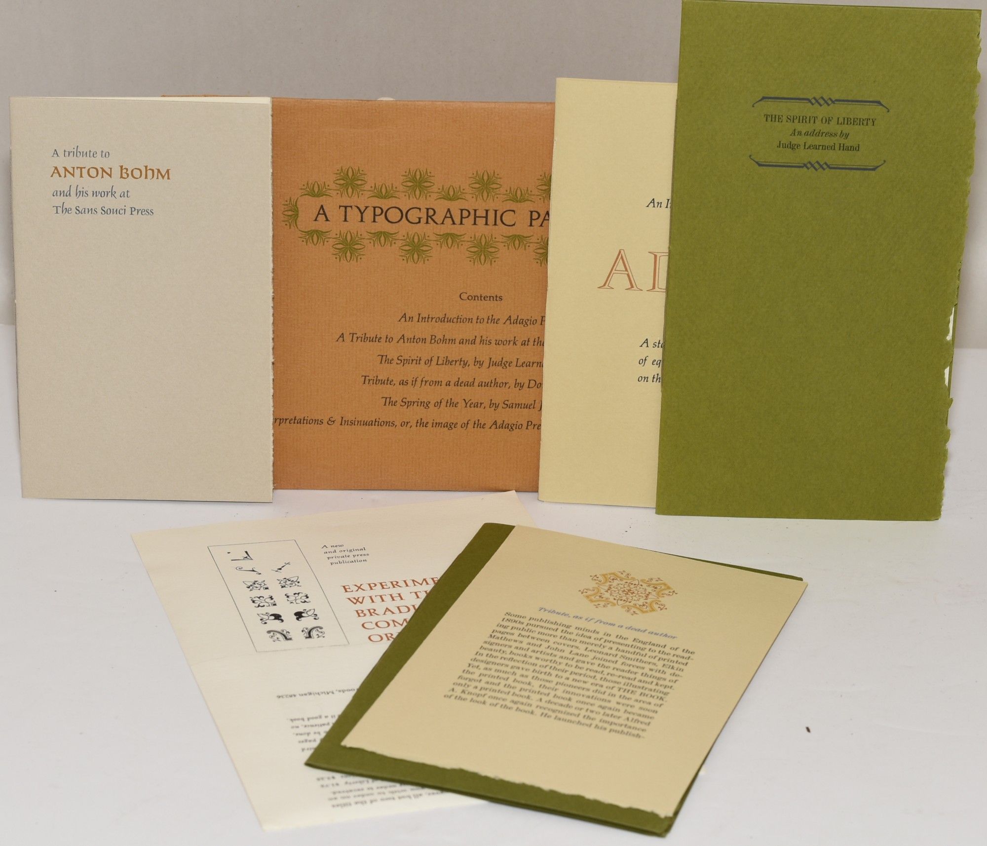 Harper Woods, Michigan: Adagio Press, 1965. Soft Cover. Near Fine binding. A packet of five unusual pamphlets and one folder printed with a variety of hand-set European foundry types; printed in two or more colors and sewn into a stiff cover. Six pieces in a printed envelope: 1. An Introduction to the Adagio Press; 2. A Tribute to Anton Bohm and his work at the San Souci Press; 3. The Spirit of Liberty, an Address by Judge Learned Hand; 4. Tribute As If From a Dead Author, by Donald Weeks; The Spring of the Year, by Samuel Johnson; Interpretations & Insinuations, or, The Image of the Adagio Press as seen Graphically by its Friends. Near Fine binding.