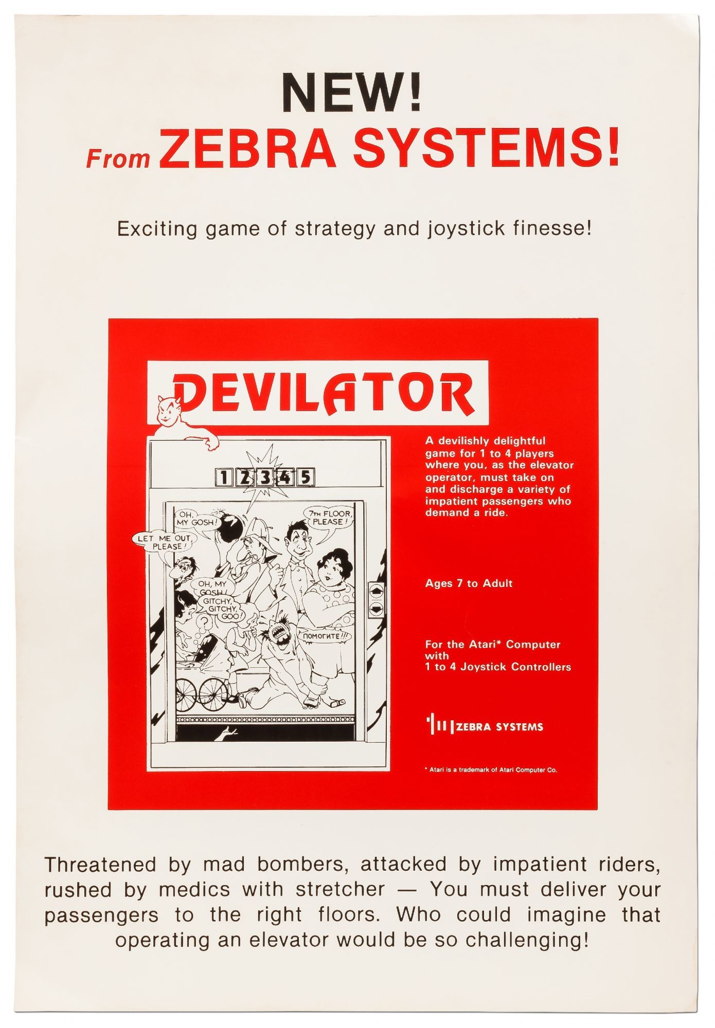 1983. Near Fine. Broadside. Measuring 12.5" x 18". Printed in red and black with glossy finish. Near fine with toning at the bottom edge, small edgewear and small dampstain at one corner. A poster advertising the multiplayer video game *Devilator* for the 8-bit Atari computer systems. The game, which involved controlling an elevator that picked up and delivered passengers to their correct floor, was self-published by Russian immigrant Yakov Epelboim as Zebra Systems. The game was distributed in extremely small numbers and the poster, presumably even more so. A wonderful obscure poster from the earliest days of computer gaming.