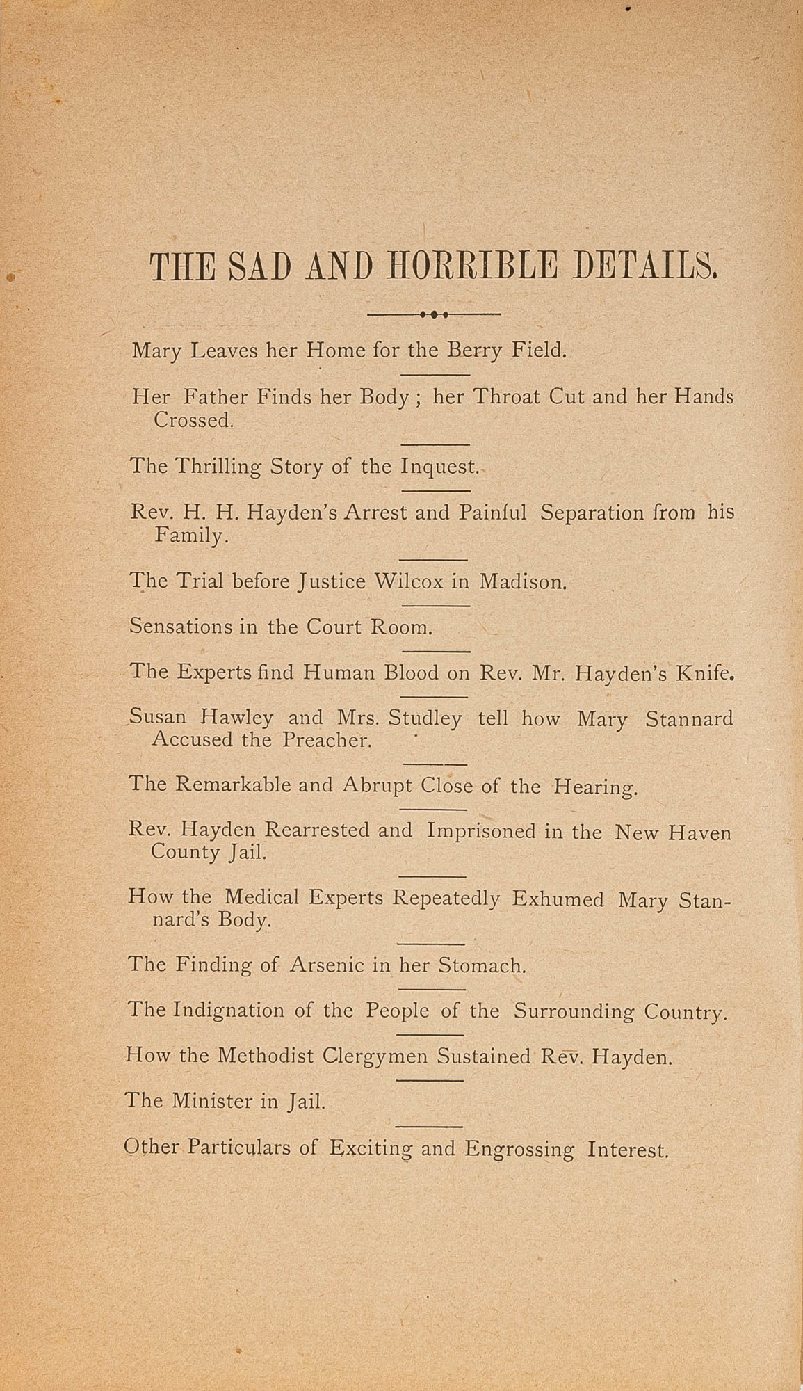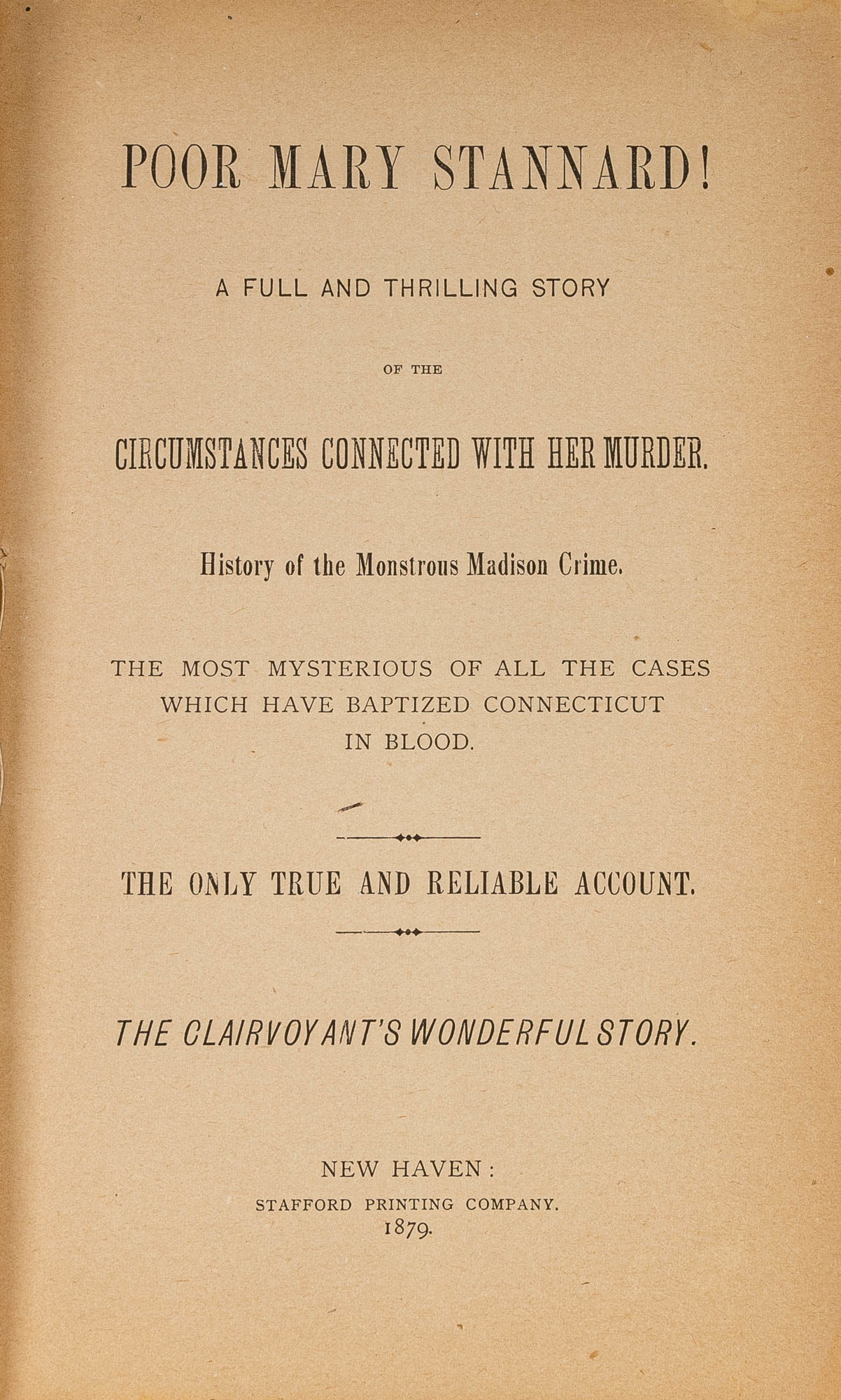1879. New Haven, 1879. Only edition. New Haven, 1879. Only edition. "The Most Mysterious of All the Cases Which Have Baptized Connecticut in Blood": McDade 449 [Trial]. [Hayden, Herbert H. (b.1850), Defendant]. Stannard, Mary [1856-1878]. Poor Mary Stannard! A Full and Thrilling Story of the Circumstances Connected with Her Murder. History of the Monstrous Madison Crime. The Most Mysterious of All the Cases Which Have Baptized Connecticut in Blood. The Only True and Reliable Account. The Clairvoyant's Wonderful Story. New Haven: Stafford Printing Company, 1879. 47 pp. Octavo (9" x 5-1/2"; 23 x 14 cm). Stab-stitched pamphlet in printed wrappers with a woodcut portrait of Stannard. Faint fold lines, some wear to spine ends, a few small chips to edges, small dampstain to upper corner of front wrapper, some browning to text. A well-preserved copy. $650. * Only edition. "In 1879, the body of Mary Stannard, twenty-two, once the servant of Reverend Herbert H. Hayden, was found in one of Hayden's fields in Madison, Conn. Her throat was cut, her skull was fractured, and there was arsenic in her stomach. Stannard had spoken to several people about her recent pregnancy by Hayden, and explained that he was going to give her something to induce an abortion. She said also that she was planning to meet Hayden in the field to pick berries and discuss their future. Unable to account for himself during the time of the killing, Hayden was arrested after it was discovered that he had purchased an ounce of arsenic "to kill rats" the day of his former servant's death.... At the three-month trial, a clairvoyant testified to the defendant's innocence, the first such incident in an American courtroom. A hung jury resulted in Hayden's release" (Nash). OCLC locates 12 copies, 2 in law libraries (University of Missouri, Yale). Nash, Encyclopedia of World Crime 1493. McDade, The Annals of Murder 449.