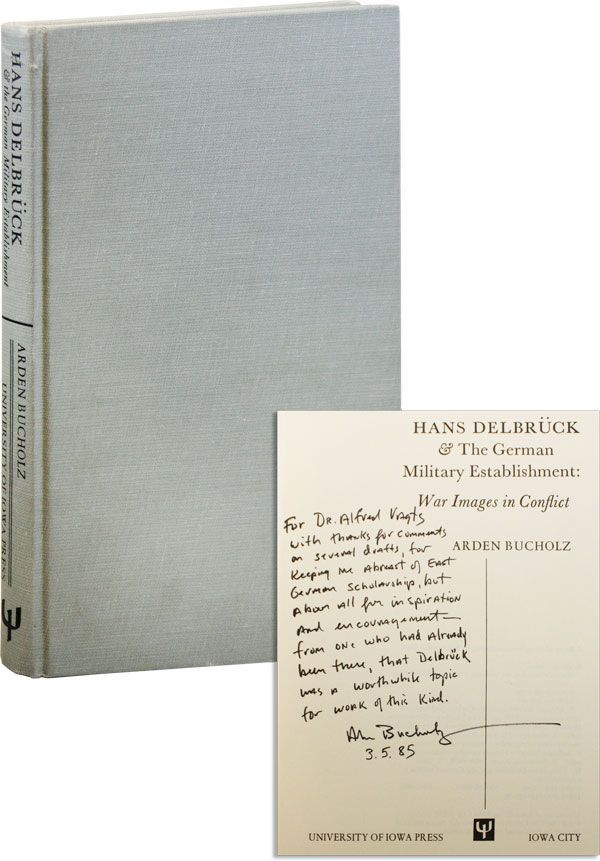 Iowa City: University of Iowa Press, [1985]. First Edition. Octavo (23.5cm.); publisher's grey cloth, spine lettered in black; xiv,191pp.; illus. Boards a bit rubbed with two small pressure points at bottom edge affecting first two leaves of textblock, brief faint pencil notes throughout (presumably Vagts's), else Near Very Good and sound. Inscribed and signed by the author on title page: "For Dr. Alfred Vagts with thanks for comments on several drafts, for keeping me abreast of East German scholarship, but above all for inspiration and encouragement--from one who had already been there, that Delbrück was a worthwhile topic for work of this kind. / Arden Bucholz / 3.5.85." Vagts, the German-American military historian and poet, was the son-in-law of Charles A. Beard.