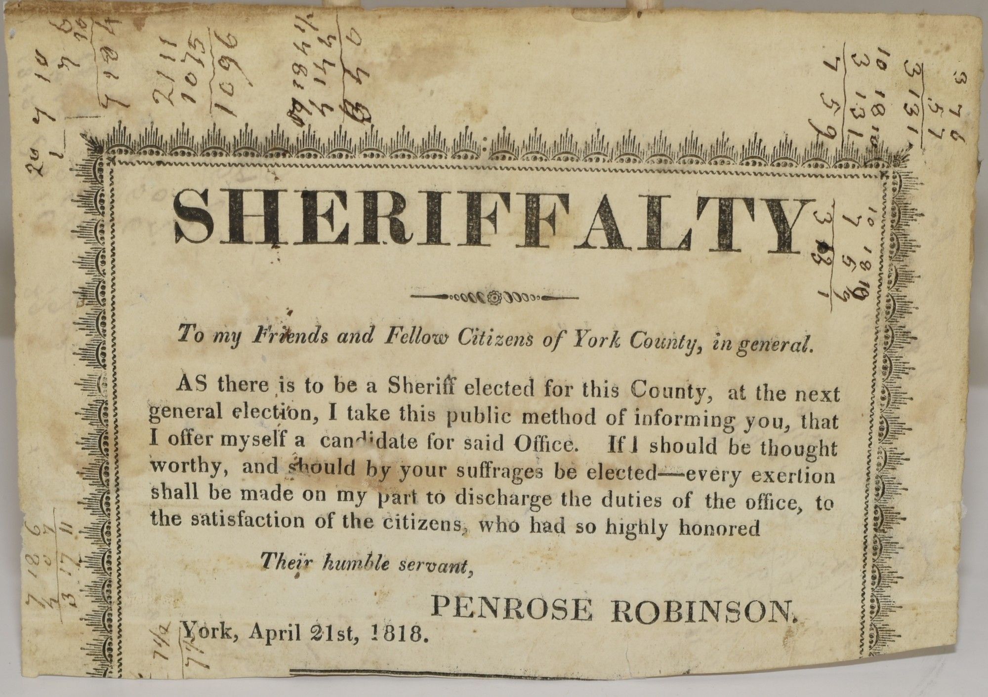 A handbill from 1818 promoting the candidacy of one Penrose Robinson, who was seeking to be elected Sheriff of York County, Pennsylvania. Robinson was a prominent local merchant. The handbill has been trimmed, affecting the border but not, we believe, the text.