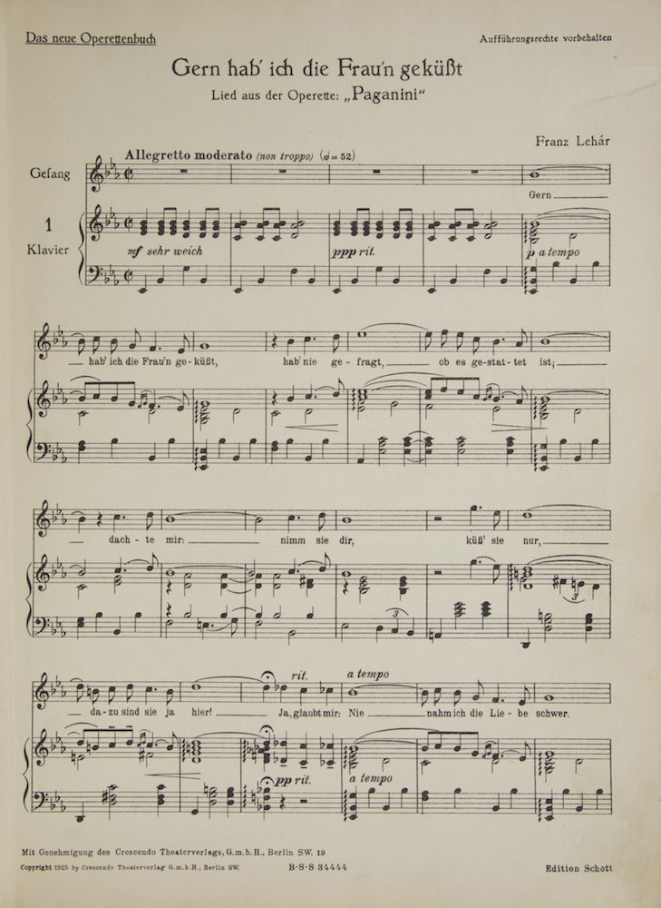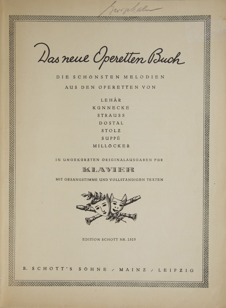 Includes 20 selections for voice and piano from popular 19th- and 20th-century German and Viennese operettas. Ownership signature in pencil to upper outer margin of title.