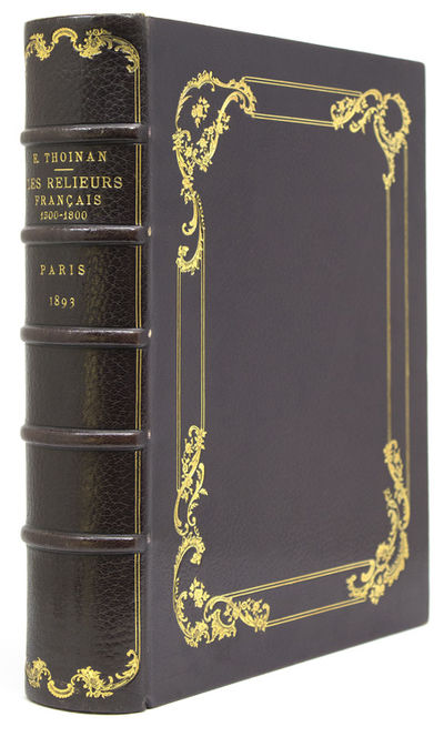 Paris: Ém. Paul, L. Huard et Guillemin, 1893. First edition, no. 9 of 20 large-paper copies on Japon Impérial, of a total edition of 650 copies. 32 plates (1 folding), numerous illustrations in text, with additional suite of 47 double-page photogravures by Jules Jacqueneau of historic bindings bound-in at rear. vii, [i], 416, [2] pp. 1 vols. 8vo. Full dark purple crushed morocco, covers tooled in gilt with wide double filet border with curling leaf and floral tools at corners, spine with raised bands, wide gilt turn-ins, silk doublures and endsheets, t.e.g, original warppers bound-in, by Pétrus Ruban. Minor surface wear at extremities, else fine. First edition, no. 9 of 20 large-paper copies on Japon Impérial, of a total edition of 650 copies. 32 plates (1 folding), numerous illustrations in text, with additional suite of 47 double-page photogravures by Jules Jacqueneau of historic bindings bound-in at rear. vii, [i], 416, [2] pp. 1 vols. 8vo. A classic work on early French bookbinding, comprising a history of the bookbinding trade in Paris, a study of the progression of binding styles, and a useful biographical dictionary of binders. This copy in a fine rococo binding by Pétrus Ruban (1851-1929). Brenni 523. Provenance: Phiroze K. Randeria (bookplate)