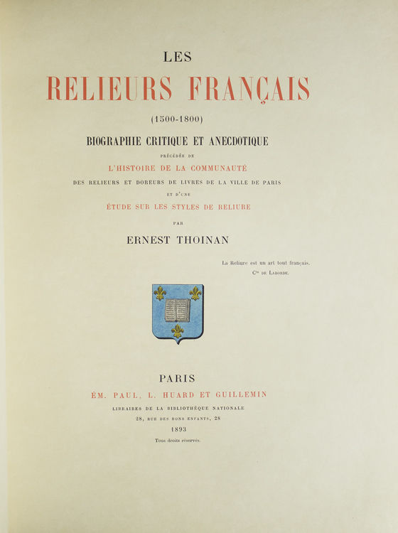 Les Relieurs Français (1500-1800). Biographie Critique et Anecdotique Précédée de l'Histoire de la Communauté des Relieurs et Doreurs de Livres de la Ville de Paris et d'une Étude sur les Styles de Reliure