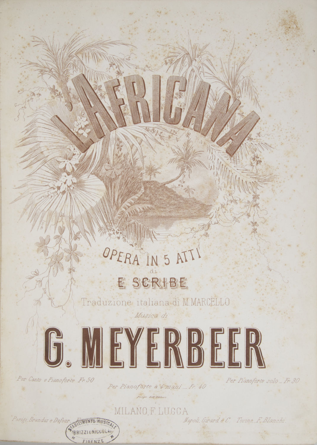 [L'Africaine]. L'Africana Opera in 5 atti di E. Scribe Traduzione italiana di M. Marcello ... Per Canto e Pianoforte Fr. 50 Per Pianoforte a 4 mani _ Fr. 40 Per Pianoforte solo _ Fr. 30. [Piano-vocal score]