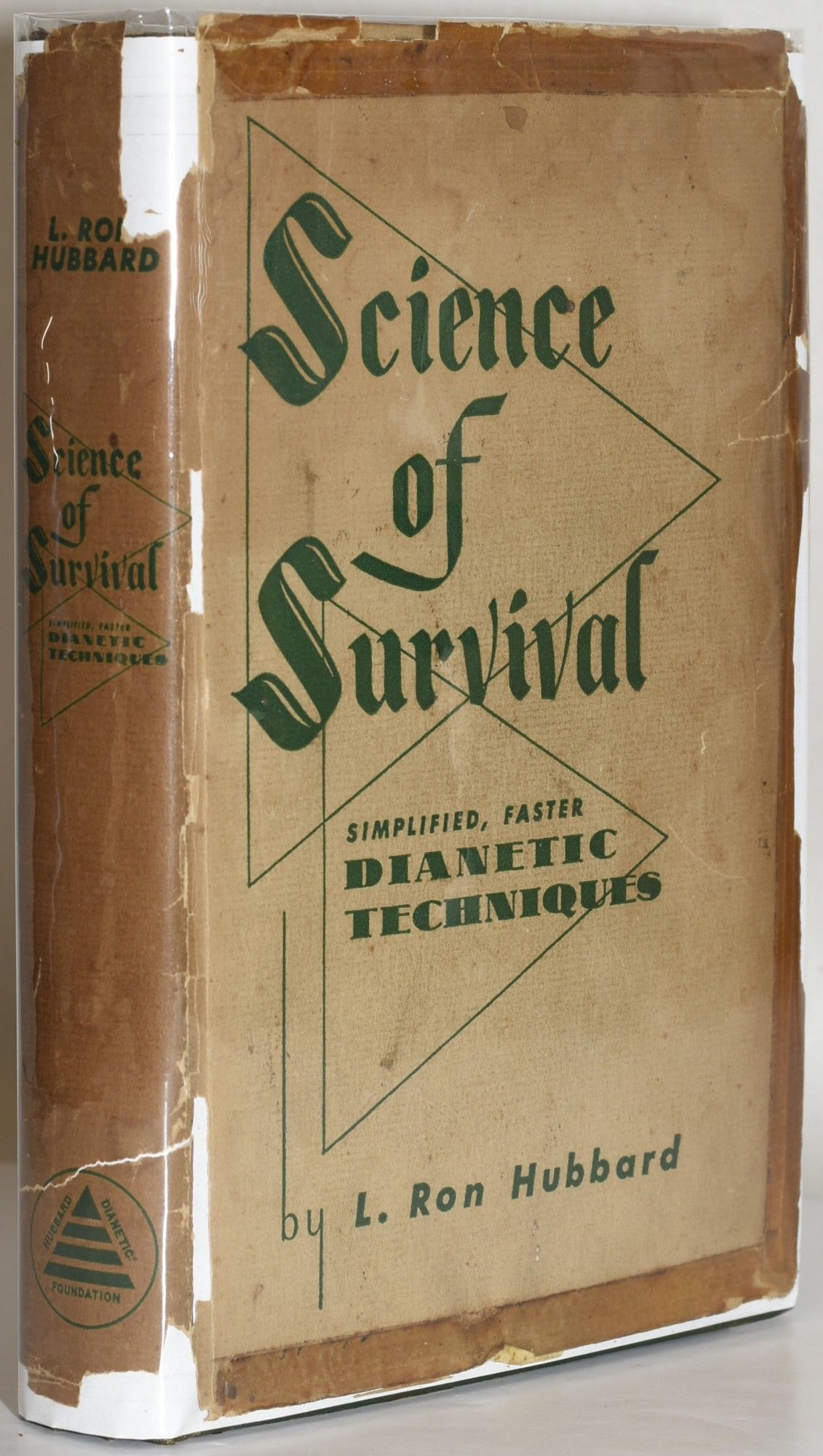 Wichita, Kansas: The Hubbard Dianetic Foundation, 1951. First Edition. Hard Cover. Very Good binding/Fair dust jacket. The first trade edition, with "First Edition" stated on the copyright page.. Typed slip on the front endpaper: "This book should contain two charts eight inches by twenty-four inches in length. If these charts are not in back of the book, please see your bookseller." The two original charts are present, as well as what appears to be two old photostats of the chart. Previous owner name stamped in green ink on the yellow pastedown, as appears to be usual. There is some old tape residue. The dustjacket is present, with tape repairs and loss. Most uncommon. Very Good binding / Fair dust jacket.