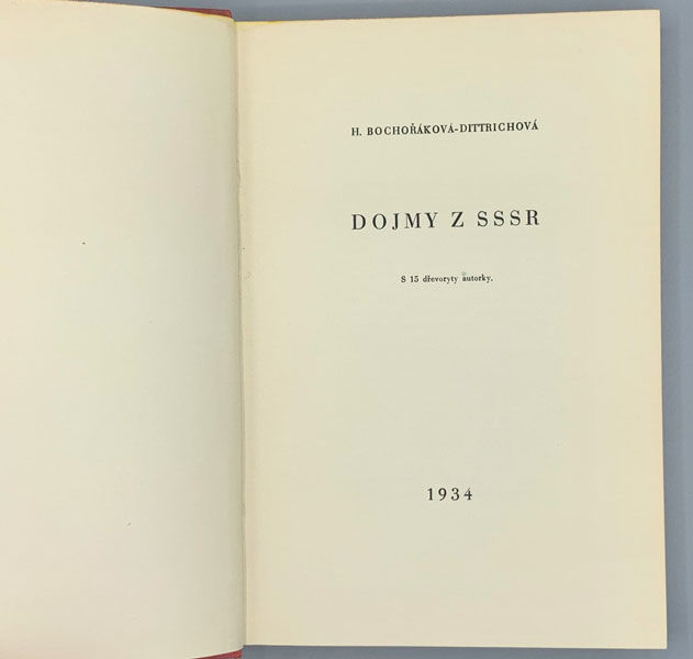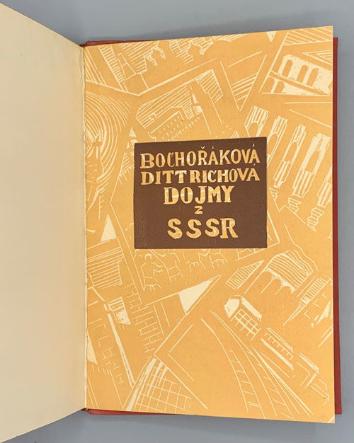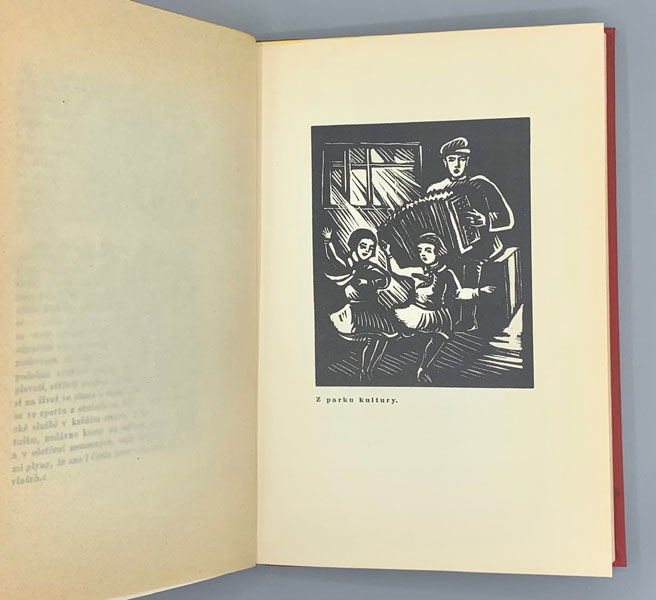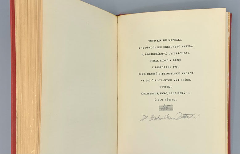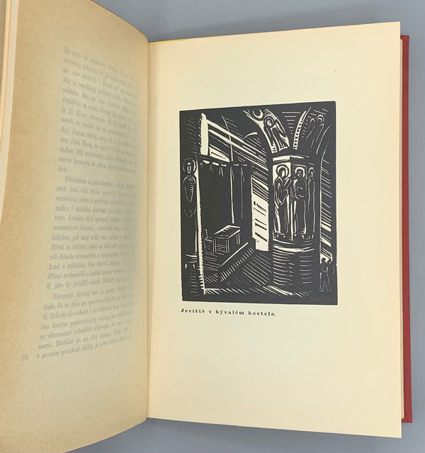 Brno: Exod, 1934. Second edition. Hardcover. Very good. SIGNED. 165pp. Octavo [22.5 cm] in red cloth with gilt-stamped title on backstrip. Spine faded and lightly cocked, light soiling to boards; dampstain to textblock top does not bleed into margins. This appears to be a rebound copy of the paperback original, with the front wrap bound in at rear. Illustrated with 15 woodcuts by the author. Signed by Bochorakova-Dittrichova in pencil on limitation page and handnumbered 45 of an edition of 200 copies.