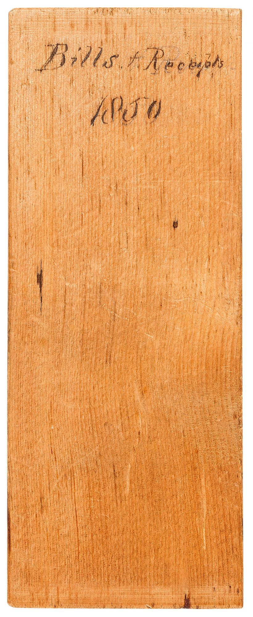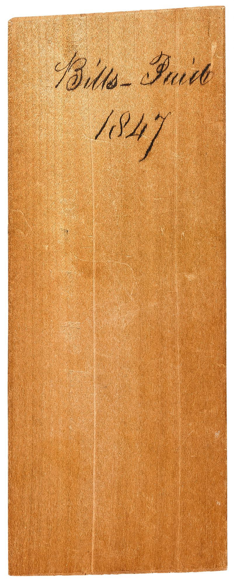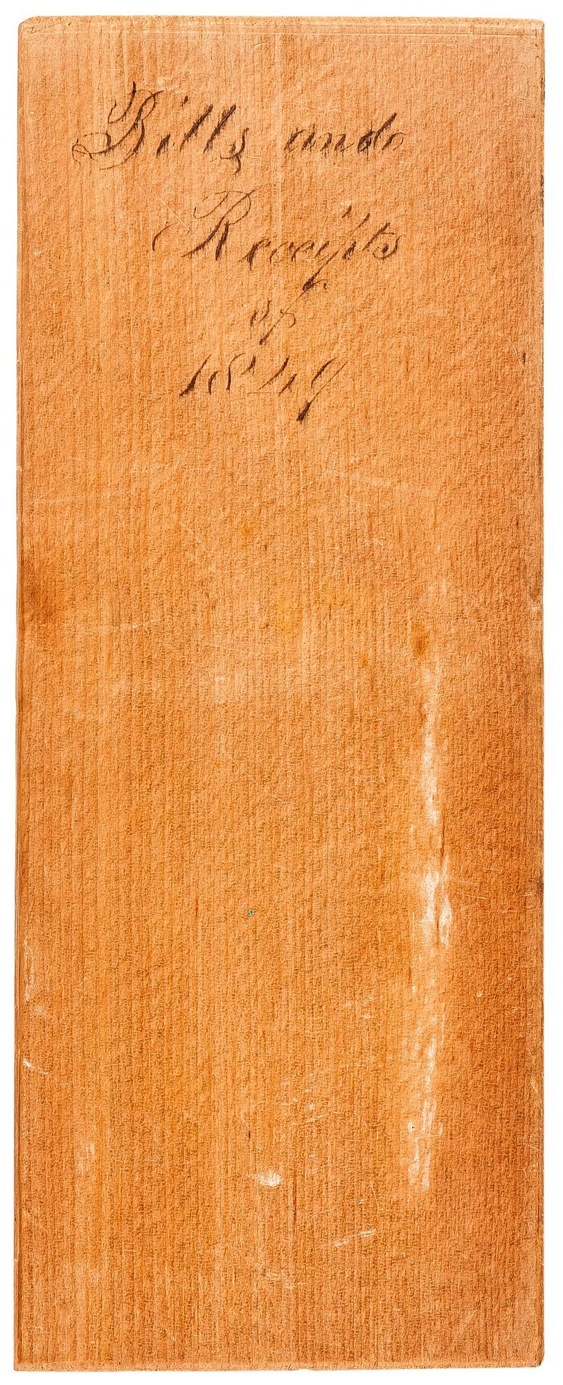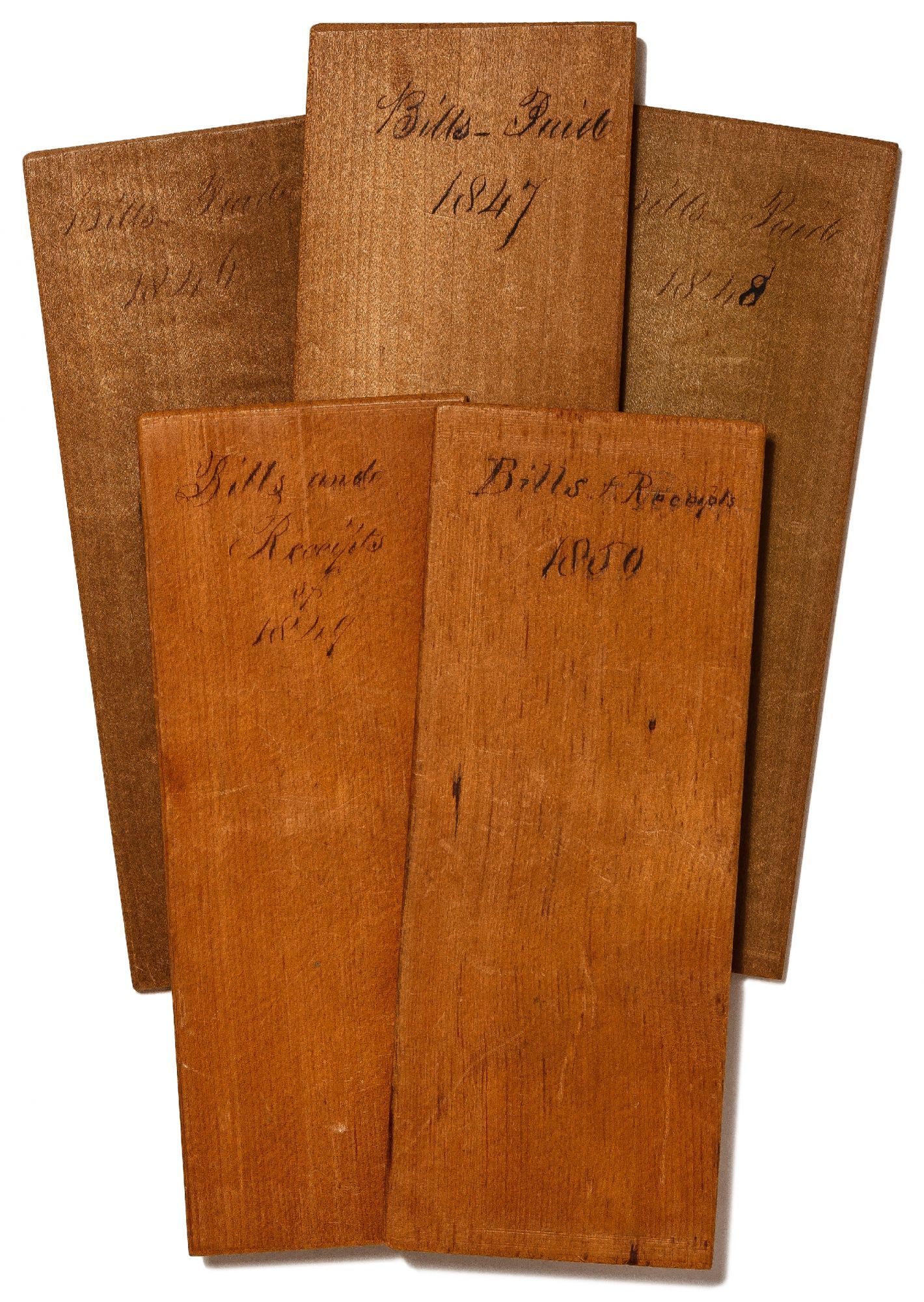 Unbound. Fine. Five wooden (probably cedar) file or account dividers for five consecutive years. Each is approximately 3.25" x 8". Each has the year and purpose neatly handwritten in ink at the top, as follows: "Bills Paid 1846," "Bills Paid 1847," "Bills Paid 1848," "Bills and Receipts 1849," and "Bills and Receipts 1850." Little ink stains on the back of one, otherwise fine condition. Likely from Pennsylvania or New Jersey (where we found them). An interesting insight into homemade 19th Century filing systems.