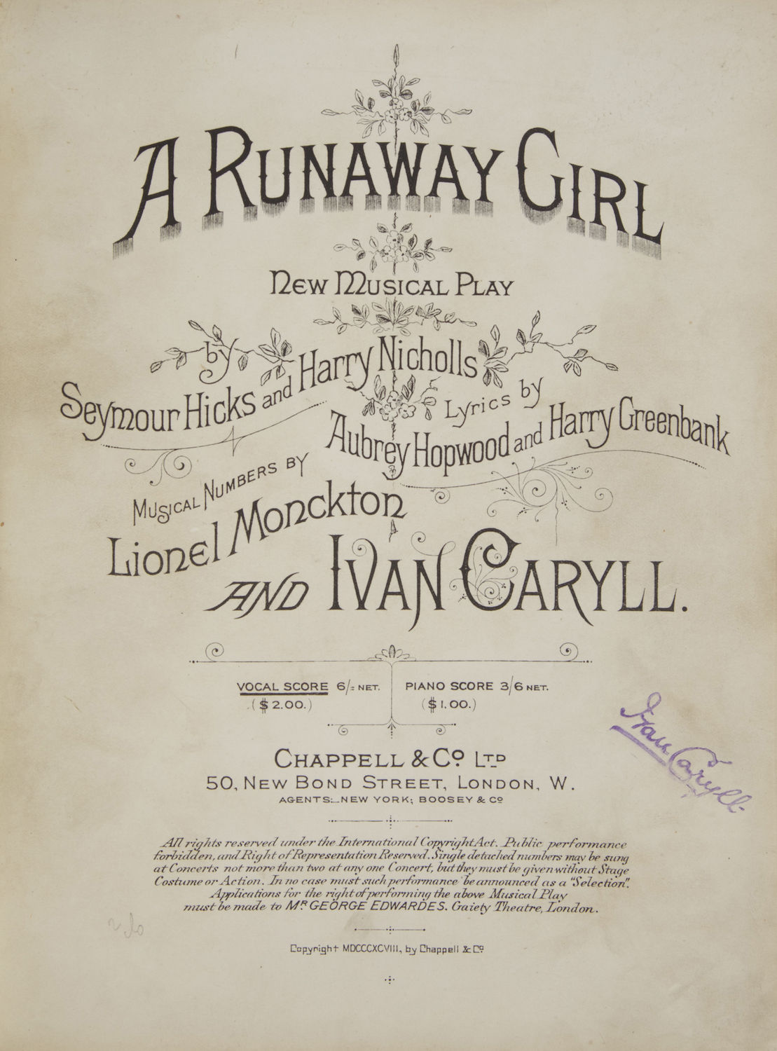 A Runaway Girl. New Musical Play Seymour Hicks and Harry Nicholls Lyrics by Aubrey Hopwood and Harry Greenbank. [Piano-vocal score]