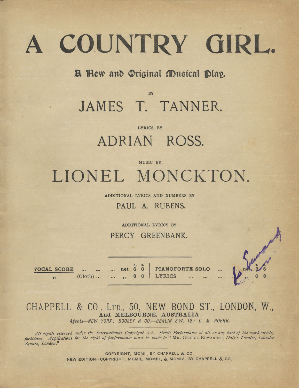 A Country Girl. A New and Original Musical Play. By James T. Tanner. Lyrics by Adrian Ross... Additional Lyrics and Numbers by Paul A. Rubens. Additional Lyrics by Percy Greenbank. [Piano-vocal score]