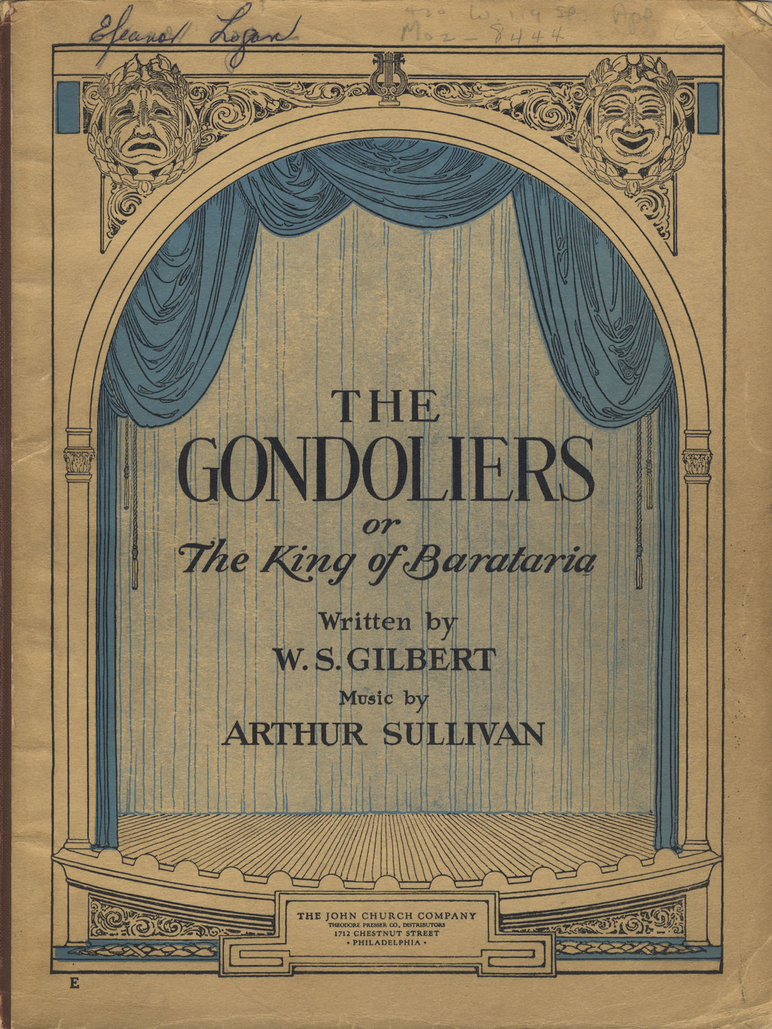 The Gondoliers; or, The King of Barataria. by W. S. Gilbert and Arthur Sullivan, Joint Authors of "Thespis; or, The Gods Grown Old" : "Trial by Jury" : "The Sorcerer". H.M.S. Pinafore; or, The Lass that Loved a Sailor" : "The Pirates of Penzance; or, The Slave of Duty." "Patience; or, Bunthrone's Bride" : "Iolanthe; or the Peer and the Peri" : "Princess Ida; or, Castle Adamant" : "The Mikado; or, The Town of Titipu" : "Ruddigore; or, The Witch's Curse" : and "The Yeomen of the Guard; or, The Merryman and his Maid." Arrangement for Pianoforte by J. H. Wadsworth. [Piano-vocal score]