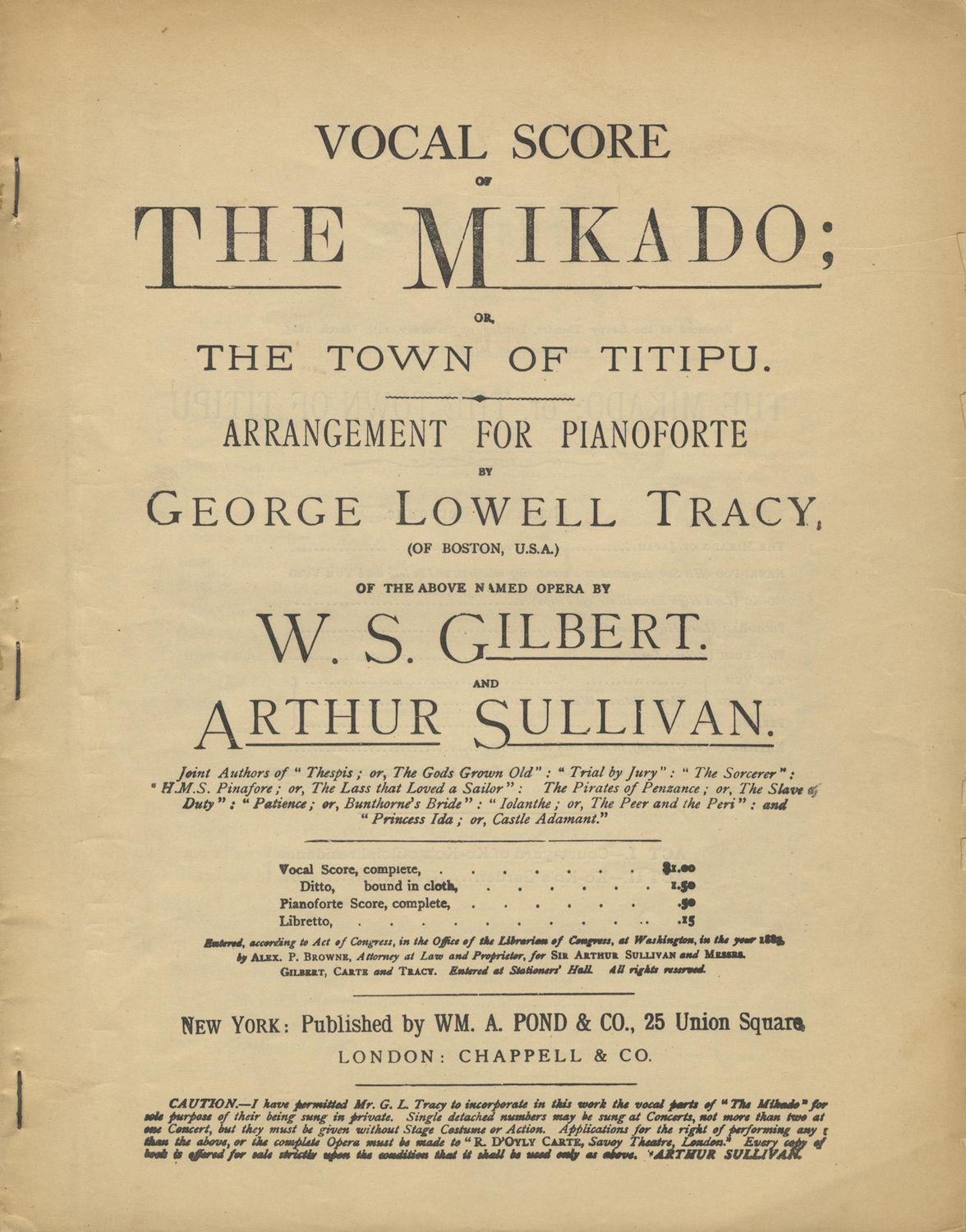 The Mikado; or, The Town of Titipu. Arrangement for Pianoforte by George Lowell Tracy, (of Boston, U.S.A.) of the Above Named Opera by W. S. Gilbert. and Arthur Sullivan. Joint Authors of "Thespis; or, The Gods Grown Old" : "Trial by Jury" : "The Sorcerer" : "H.M.S. Pinafore ; or, The Lass that Loved a Sailor" : The Pirates of Penzance ; or, The Slave of Duty" : "Patience ; or, Bunthorne's Bride" : "Iolanthe ; or, The Peer and the Peri" : and "Princess Ida ; or, Castle Adamant." [Piano-vocal score]