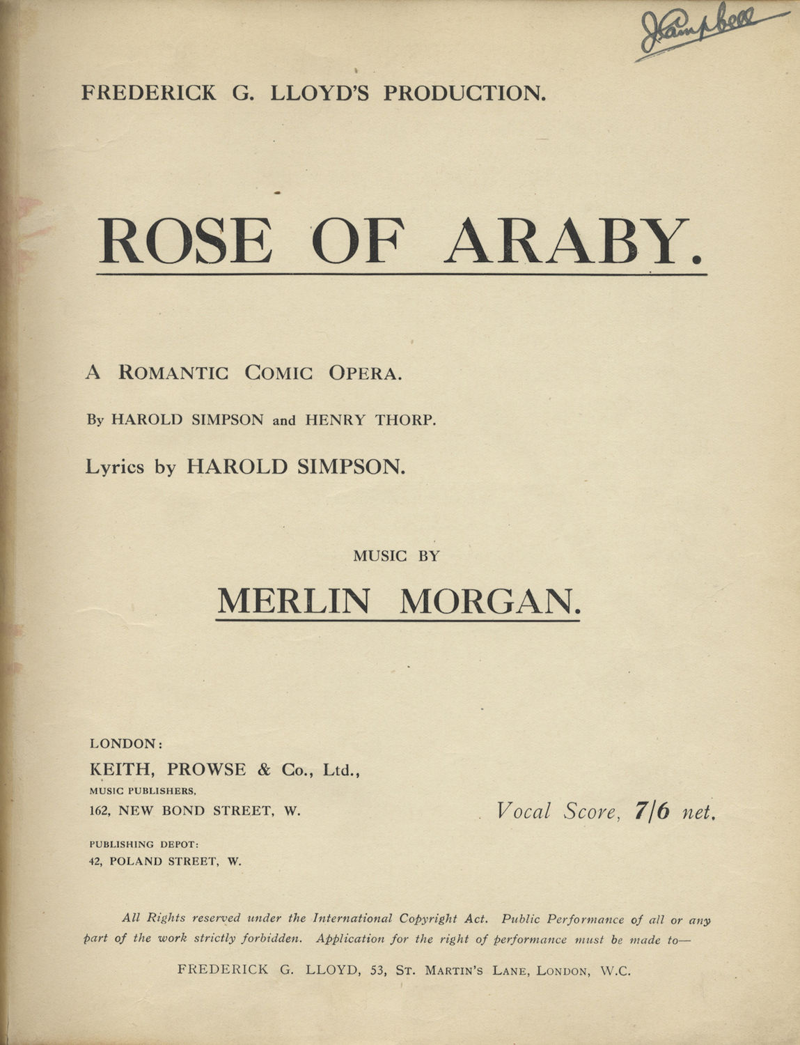 Rose of Araby. A Romantic Comic Opera. By Harold Simpson and Henry Thorp. Lyrics by Harold Simpson. [Piano-vocal score]