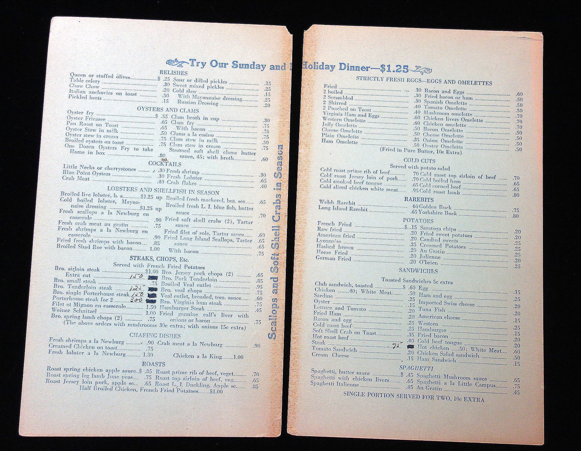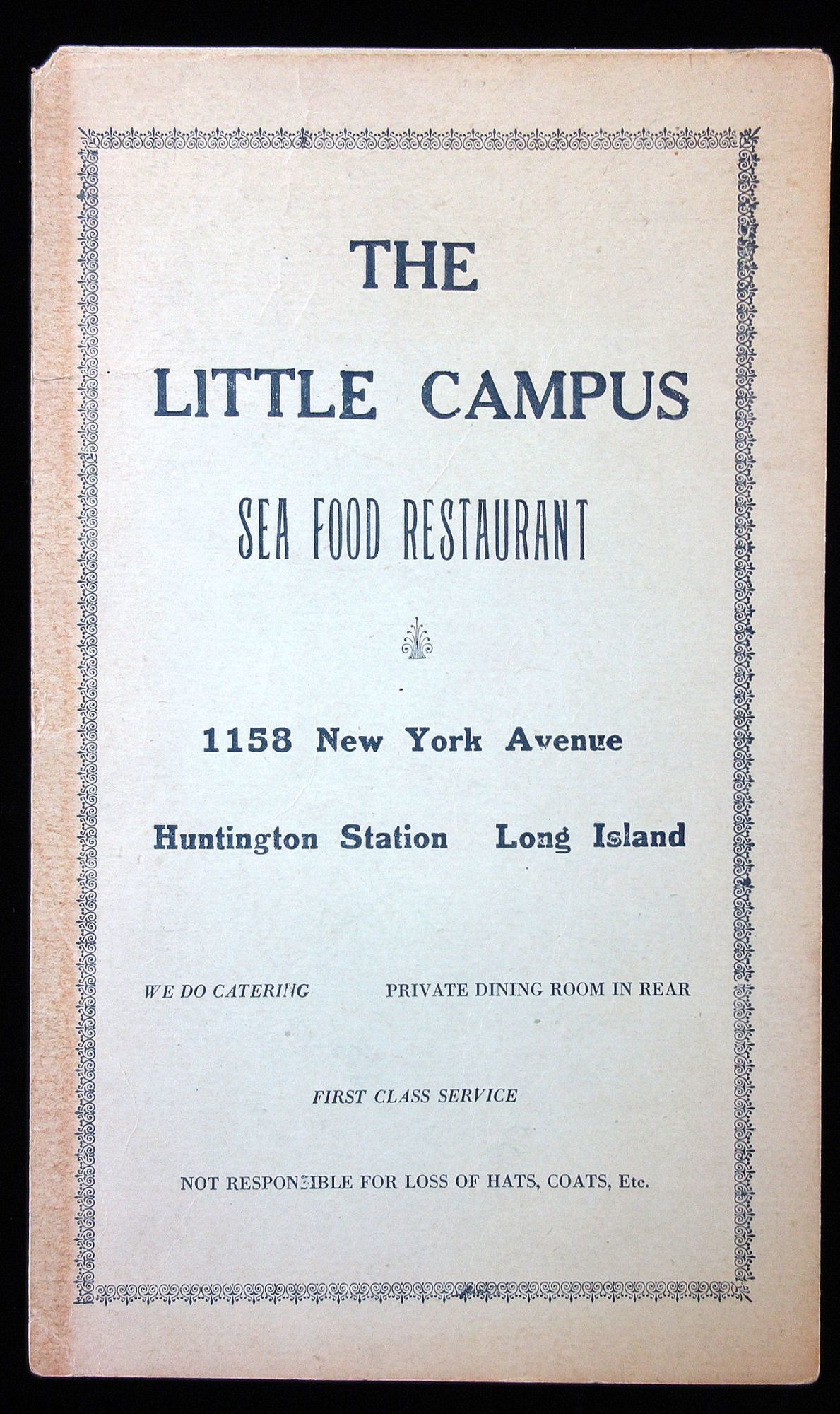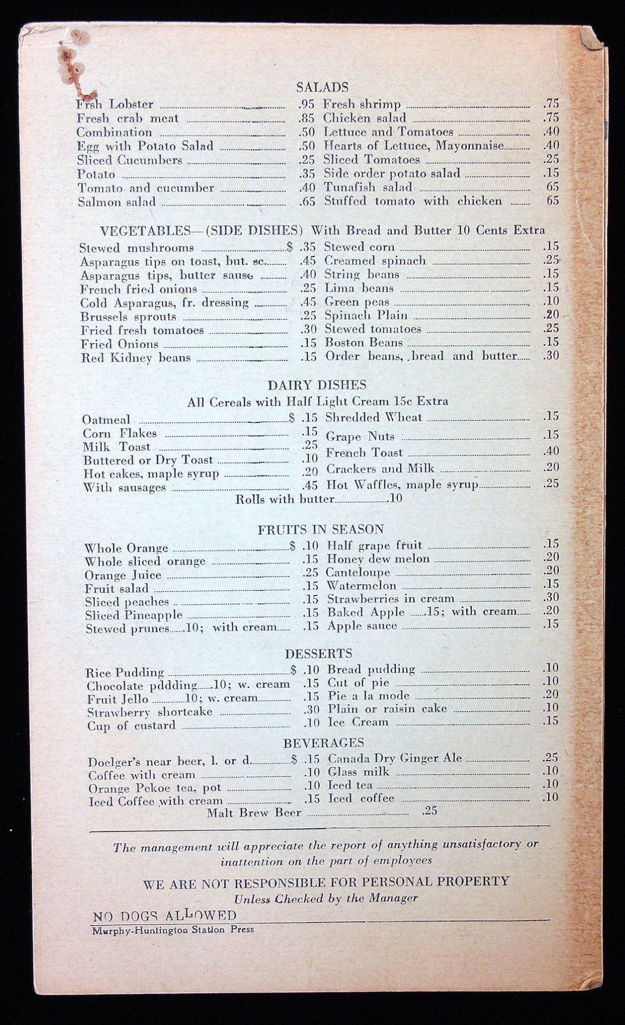Huntington Station, LI, NY, 1930. A comprehensive menu featuring 17 categories of fare. The specials are Scallops and Soft Shell Crabs in Season. The most expensive menu item is a Porterhouse for 2 at $3.00. Oysters and Clams were served 14 ways. Promotes first class service and no dogs allowed. Measures 10 1/2" x 6 1/4". A popular attraction in the 1920s and 30s. Separated at fold. Age toning.