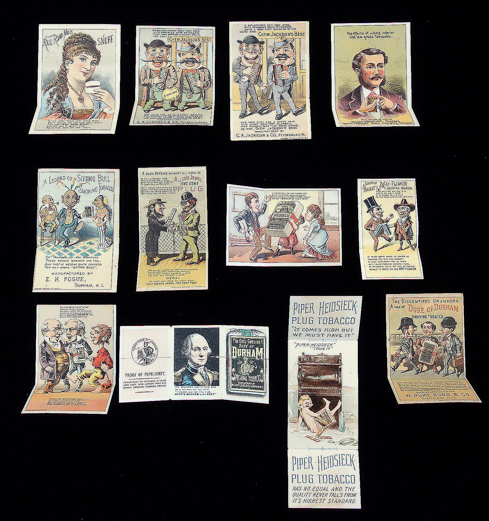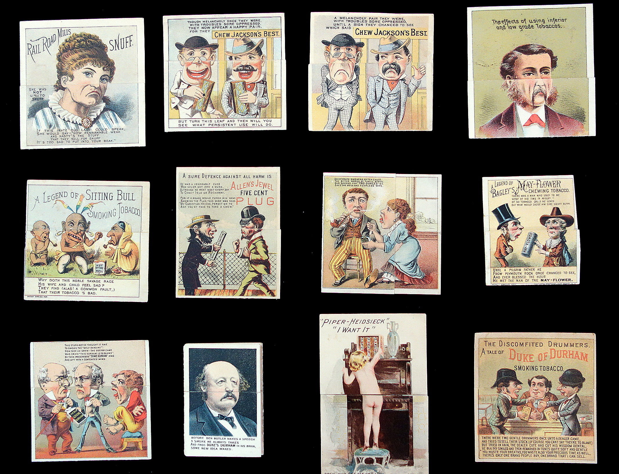 1880s. A group of 12 metamorphic advertising trade cards each depicting an unpleasant situation, when the card is opened flat the scene changes to a happily ever after situation,all as a result of using tobacco. Provided an effective means of advertising the technique was used by Wilson & McCallay's, Jackson's Best, Duke of Durham, Railroad Mills Snuff, Piper Heidsieck, Allen's Jewel, Bagley's, Dime Durham and Pogue's Sitting Bull. The use of tobacco was behind increased wealth, well-being, taming 'savage' native Americans, curing stomach disorders and heart burn and improving home life. Two of the cards are a slightly different format; one a small child so eager to get to the tobacco she falls off a piano stool and with sliced pages showing influencers like George Washington, Bismarck and Ben Butler all promoting the product. Various publishers.