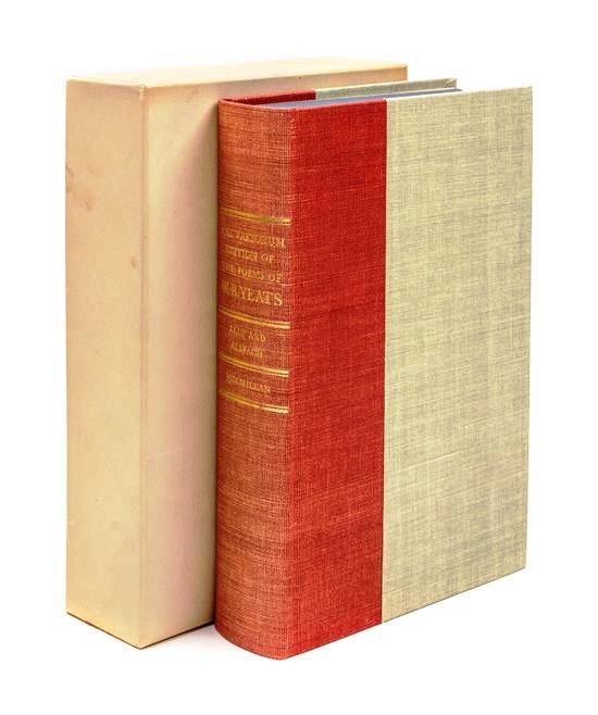 New York: The MacMillan Company, 1957. First Edition. Hardcover. Very mild sunning to the spine. Just about Fine in a close to Fine slipcase. Original two-color buckram with gilt lettering on the spine; 884 pages. Edited by Peter Allt and Russell K. Alspach. Copy #449 of 825 numbered copies SIGNED by the author on the limitation leaf of this definitive collection of Yeats's poetry. Yeats was the first Irish writer to win the Nobel Prize. Laid in is the original letter from Kroch & Brentano's offering the book and explaining how they are able to offer an autographed copy nearly 20 years after the death of Yeats.
