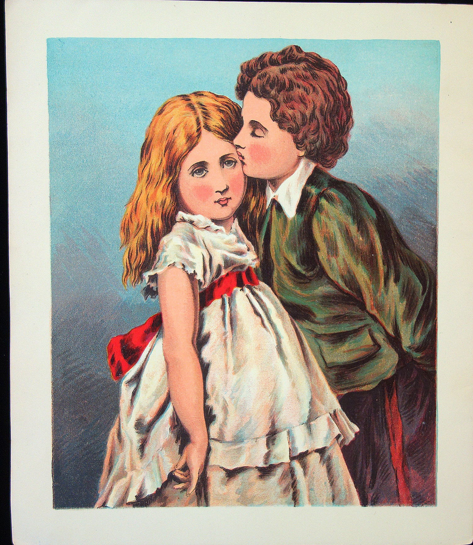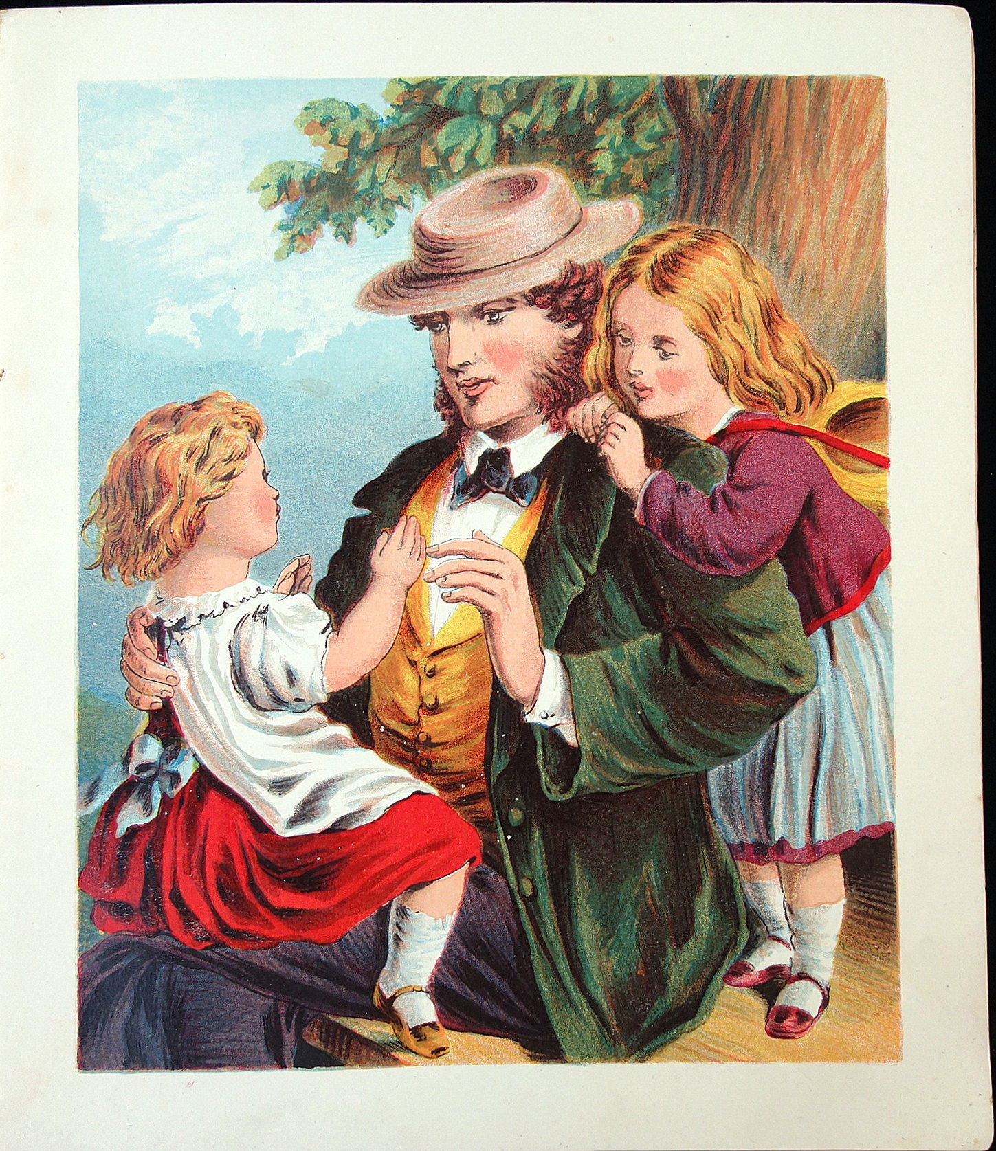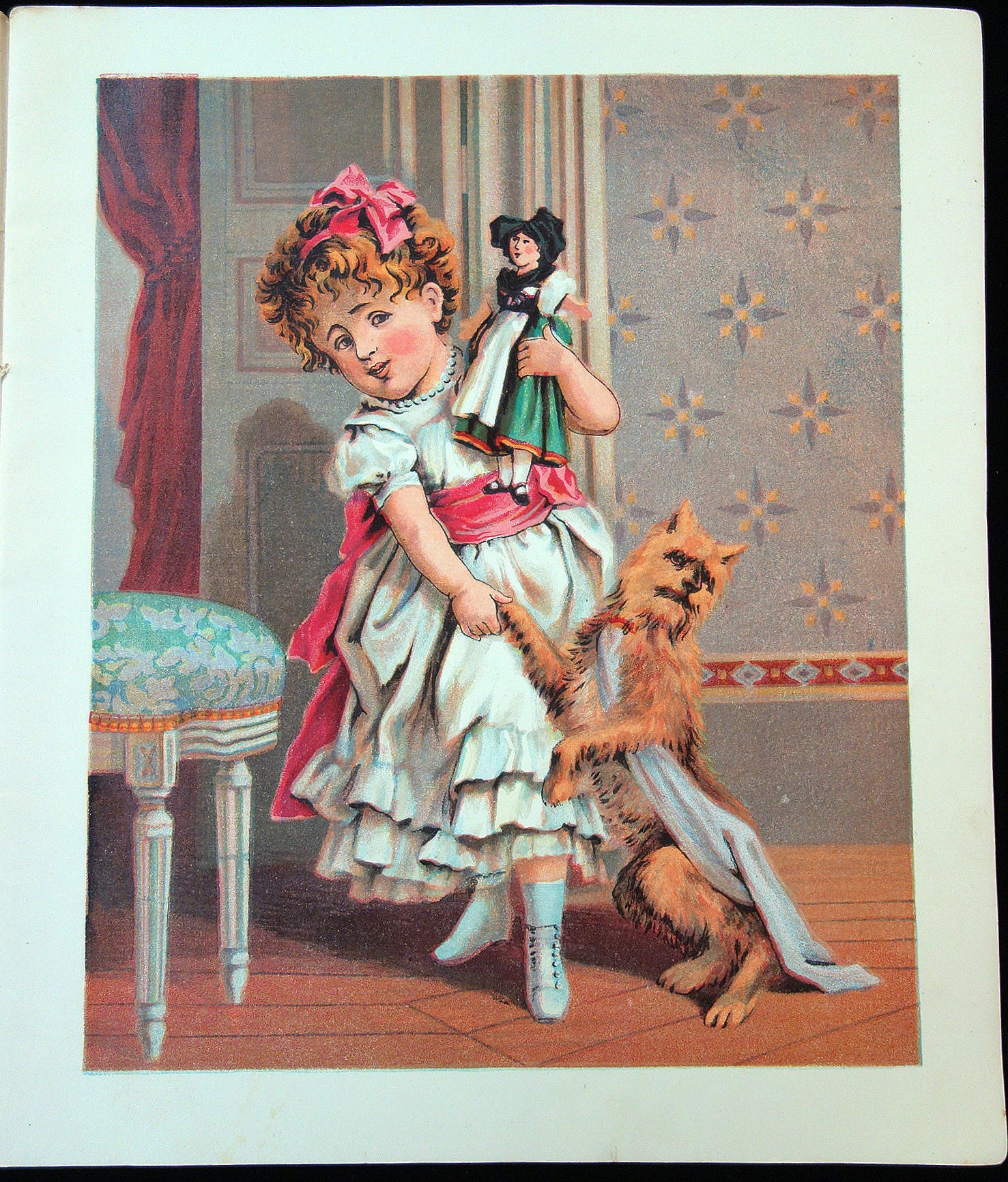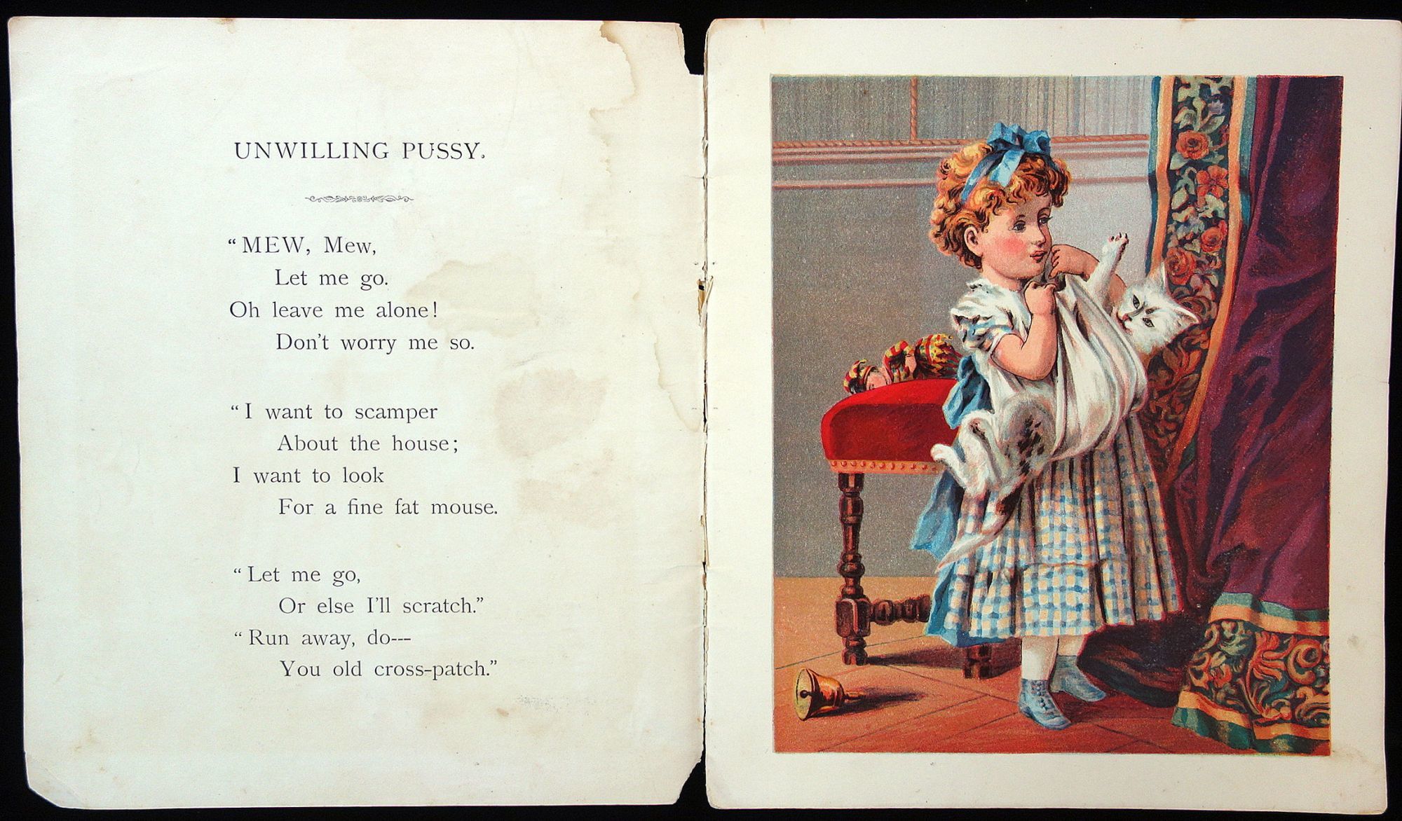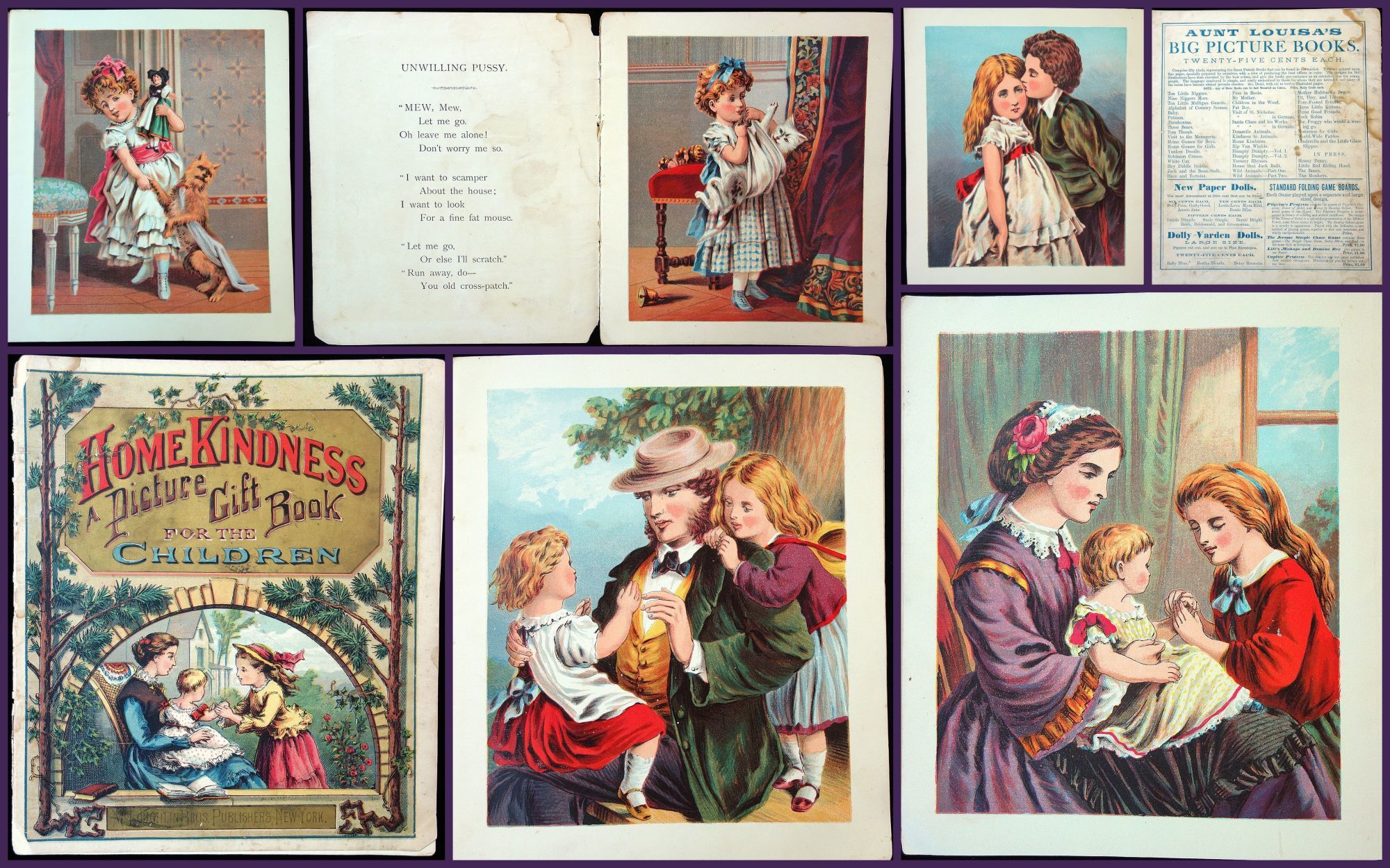 New York: McLoughlin Bros, 1870. Unpaginated. Illustrated Wrap. 6 full page lithograph illustrations. Verses include Unwilling Pussy, Lucy and Dash, Be Kind to They Father, Be Kind to Thy Mother, Be Kind to Thy Sister and finally Be Kind to Thy Brother. McLoughlin advertising back cover. Measures 9 1/2" x 10 3/4" Cover wear with edge chips and light staining.
