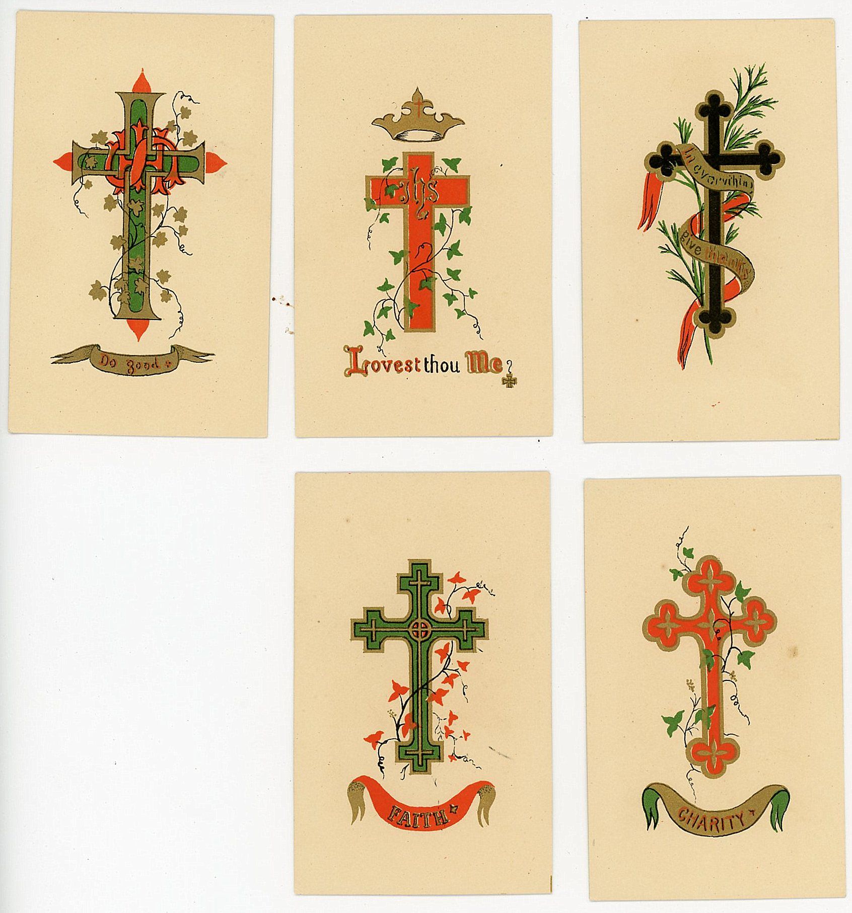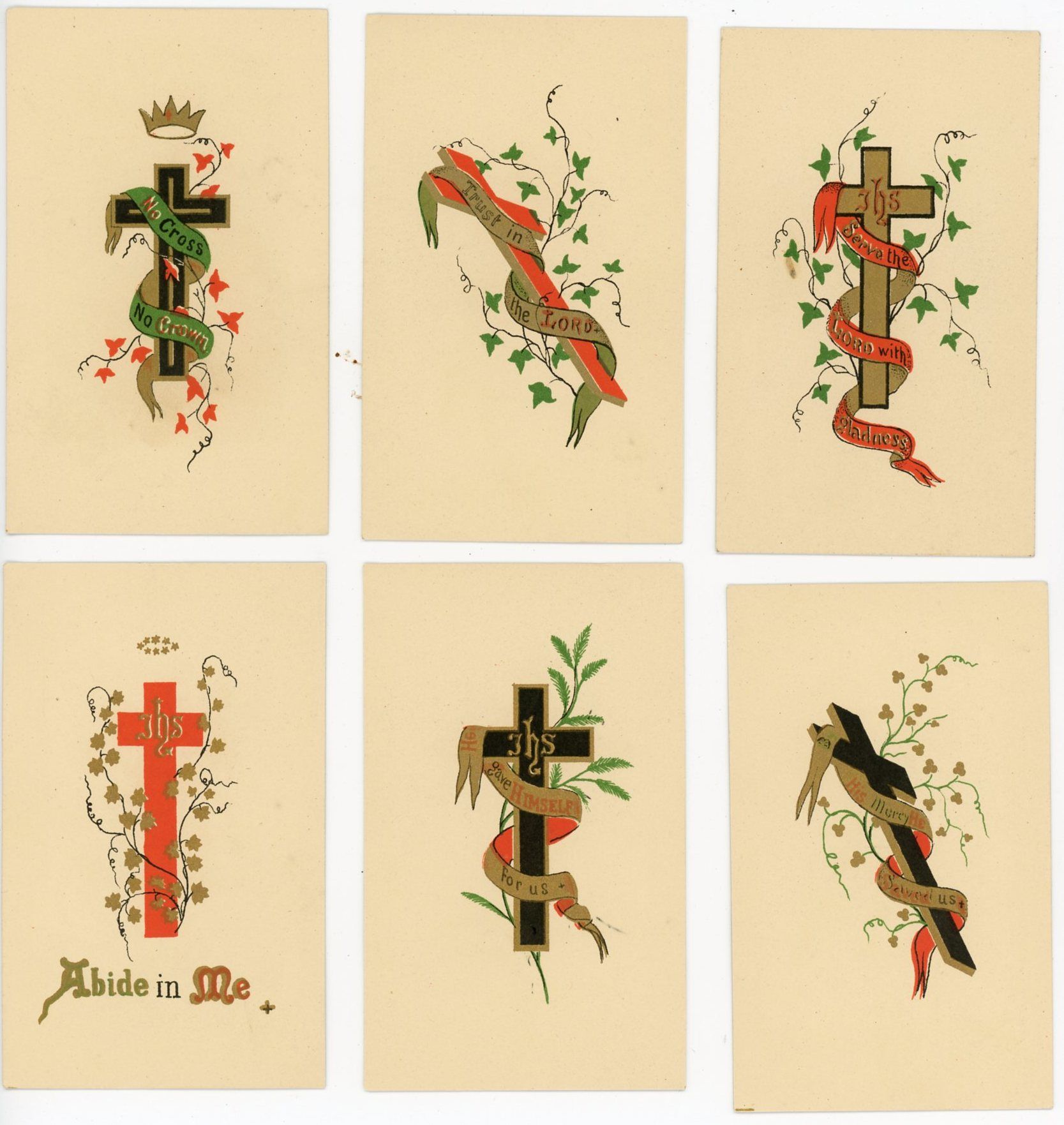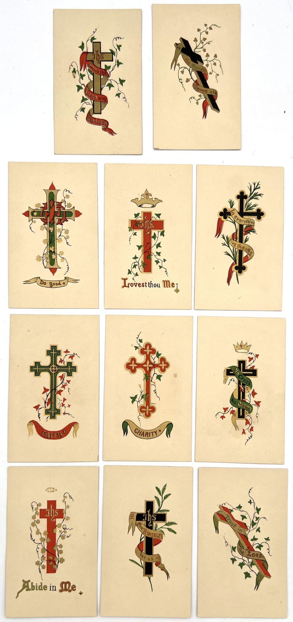 1880. Eleven (11) 4 1/4" x 2" chromolithograph motto card sprinted on heavy stock. The central theme of each card is a cross adorned with various ribbons and flora. Each with a religious in nature motto. Reverse of cards is blank.